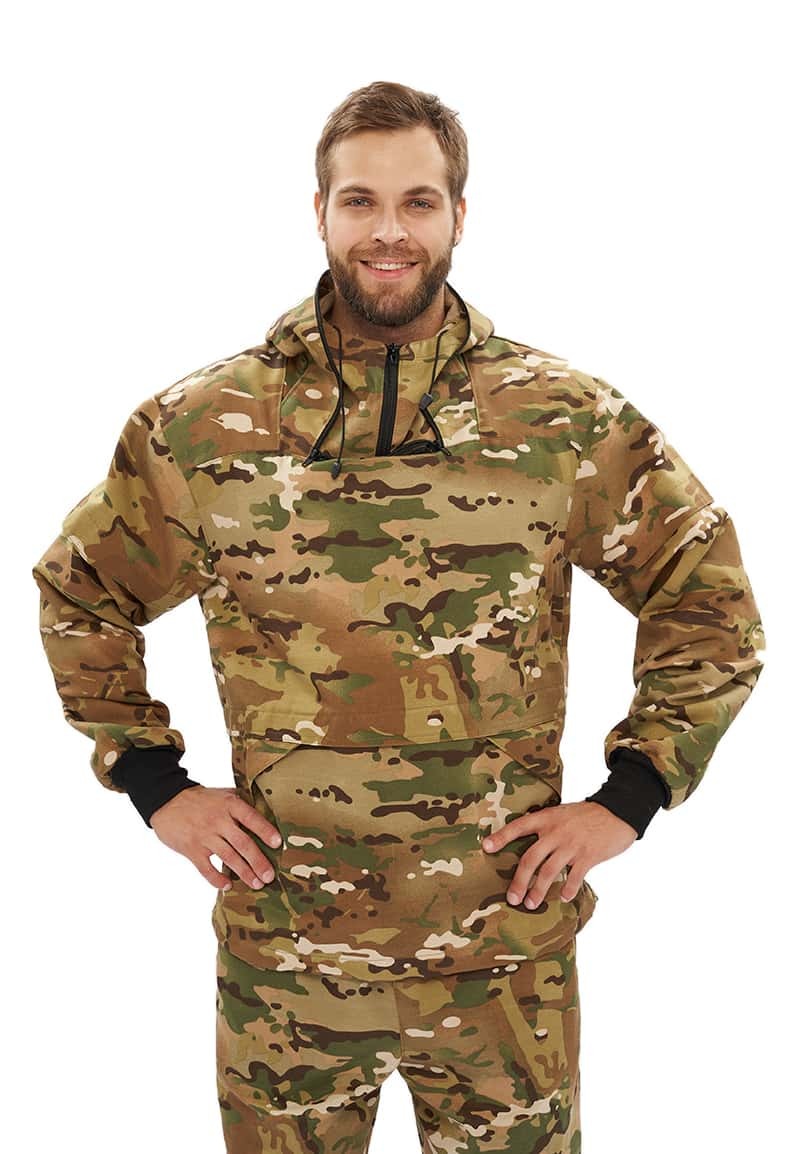 капюшон несъемный, регулируется по объему лицевой кулисой со шнуром и хлястиком на полукольцах в затылочной части;