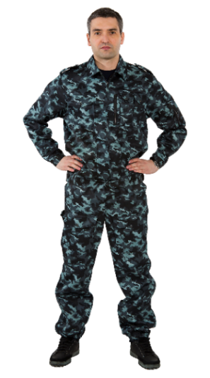 Брюки с притачным поясом с пятью шлевками, с застежкой-гульфиком на петли и пуговицы. Брюки имеют объемные боковые накладные карманы с клапаном на супатной застежке на петли и пуговицы, а также на передних половинках брюк расположены карманы с отрезным бочком. Низ штанин регулируется эластичным шнуром.