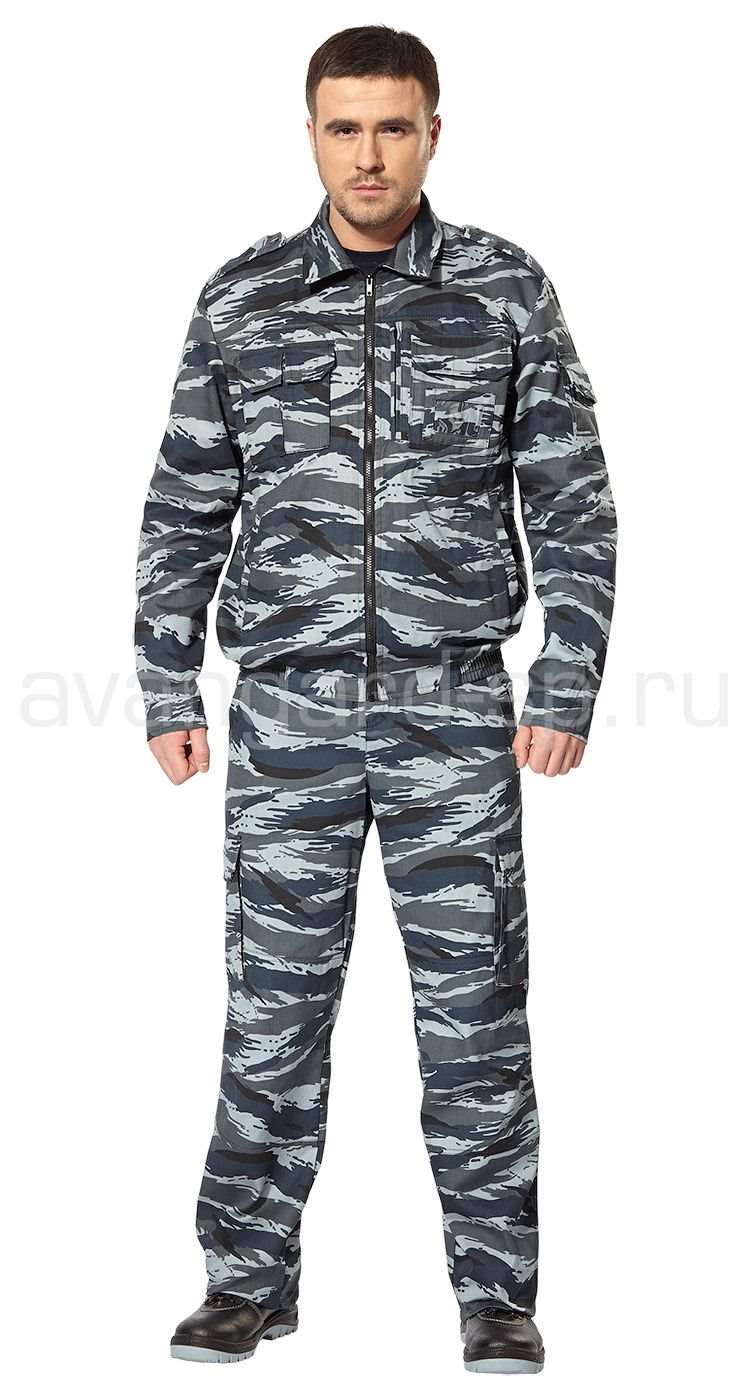 Рекомендуется для охранных структур, работы, активного отдыха. Состоит из куртки и брюк. Куртка прямого силуэта с центральной застежкой на молнию, отложным воротником. Оснащен нагрудными накладными карманами с клапанами на липучках для средств связи, имеется карман на молнии для документов. Поверх кармана прозрачное окно для бейджа. На рукаве накладной карман с клапаном. Объем талии брюк регулируется эластичной лентой. Артикулированные колени. Низ штанин регулируется эластичным шнуром.