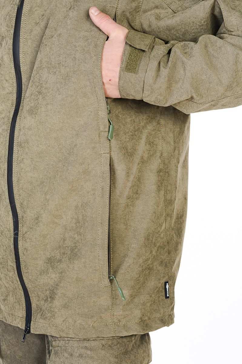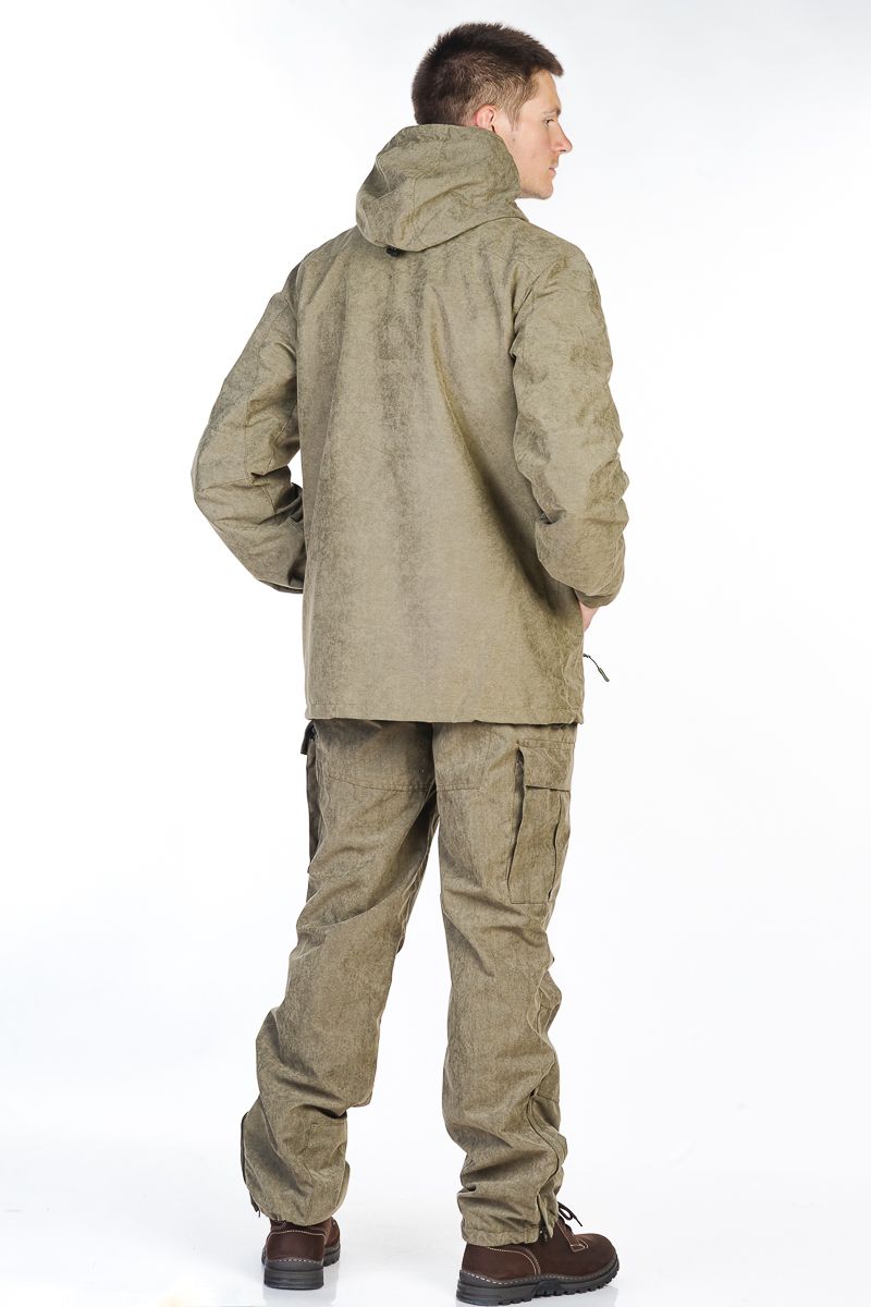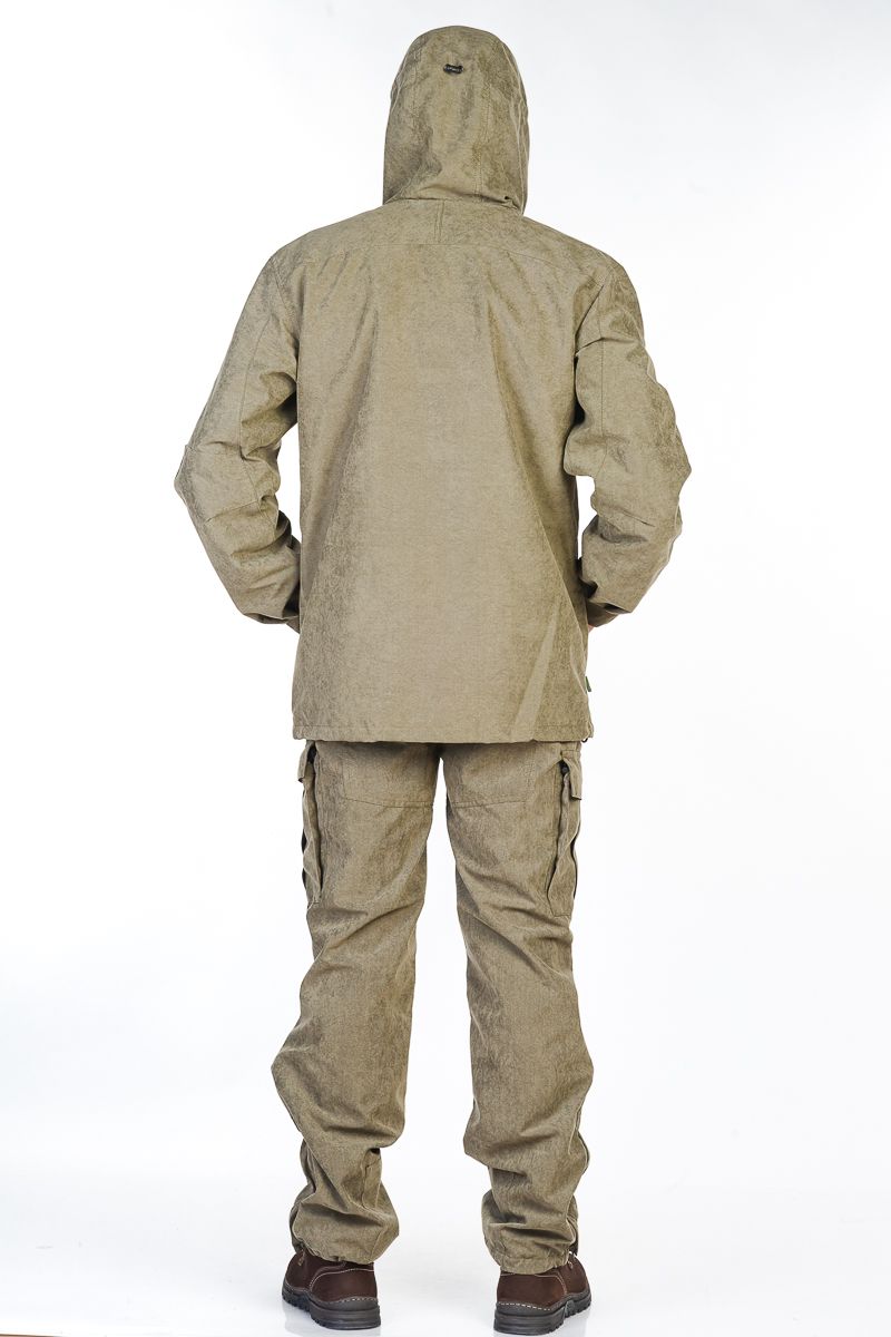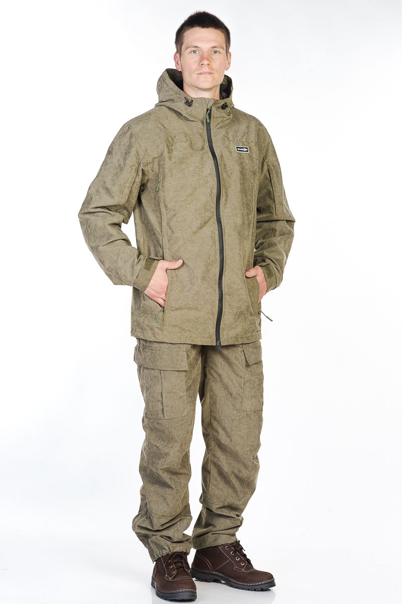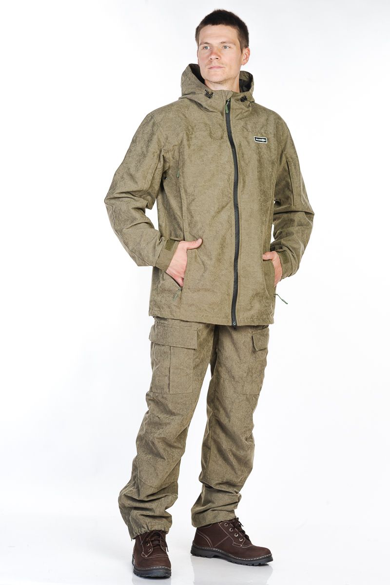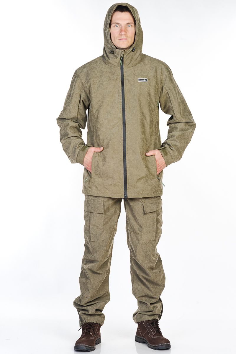Центральная застежка куртки на 2х замковую влагостойкую молнию. Карманы удобно расположены в боковых швах и закрываются на молнию. Капюшон регулируется эластичным шнуром. Внизу рукавов трикотажные манжеты. На локтях и коленях усиленные накладки. Низ куртки также регулируется эластичным шнуром. Низ брюк на резинке. Универсальный цвет, актуальный эко - стиль и прекрасное качество оценят любители туризма, рыбалки и охоты.