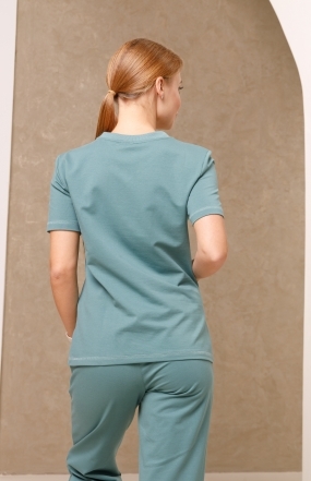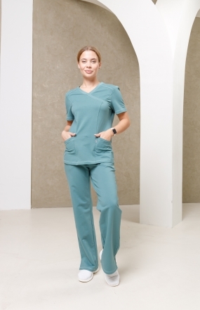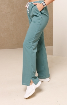 Брюки женские, прямого покроя, на притачном поясе из кашкорсе со вставкой посередине, и с продернутым шнурком через петли на вставке. На передних половинах брюк обработаны боковые карманы. На правой передней половине брюк в районе колена настрочен накладной карман. В боковых швах брюк по низу обработаны разрезы.