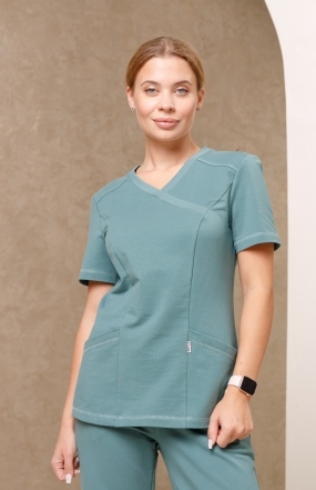 Куртка полуприлегающего силуэта, без воротника и застежки. Горловина V-образной формы с имитацией запаха, обработана планкой из кашкорсе. Перед с горизонтальными кокетками и с рельефами из проймы до низа куртки. В нижней части переда карманы, входящие в швы рельефов. Около входа в левый карман вставлен жаккардовый флажок. Спинка без среднего шва. Горловина спинки внутри обработала киперной лентой, заранее продекатированной. Рукава короткие втачные, одношовные. По краю кокеток на полочке, по краю подгибки карманов, по подгибке низа куртки и рукава проложена тройная декоративная строчка.