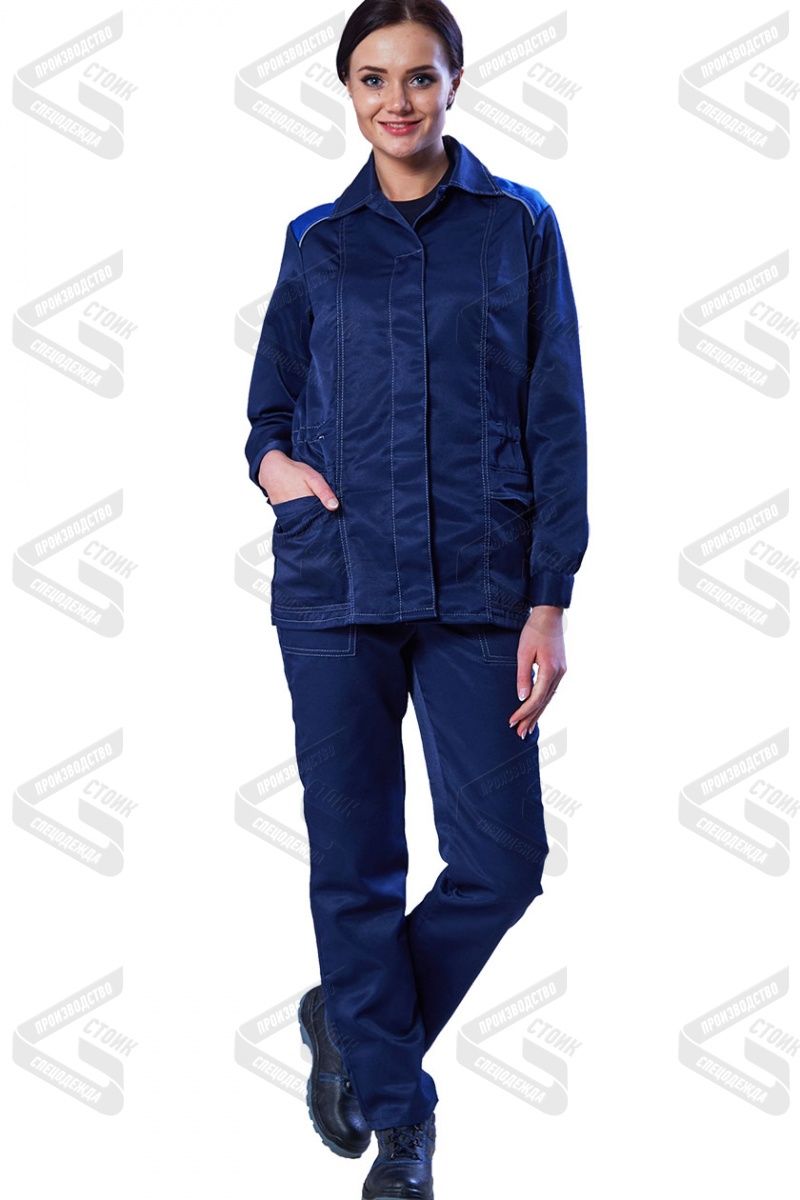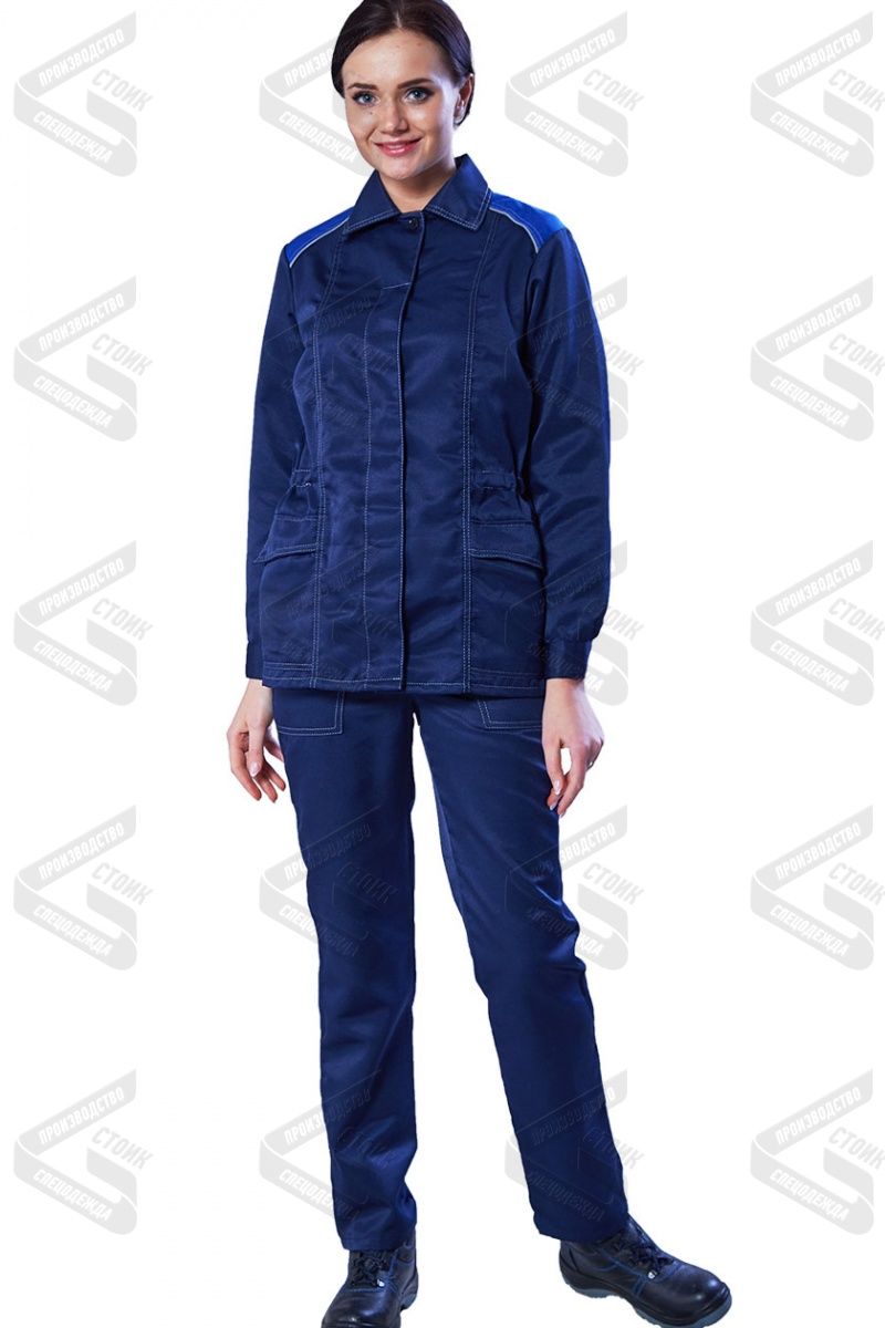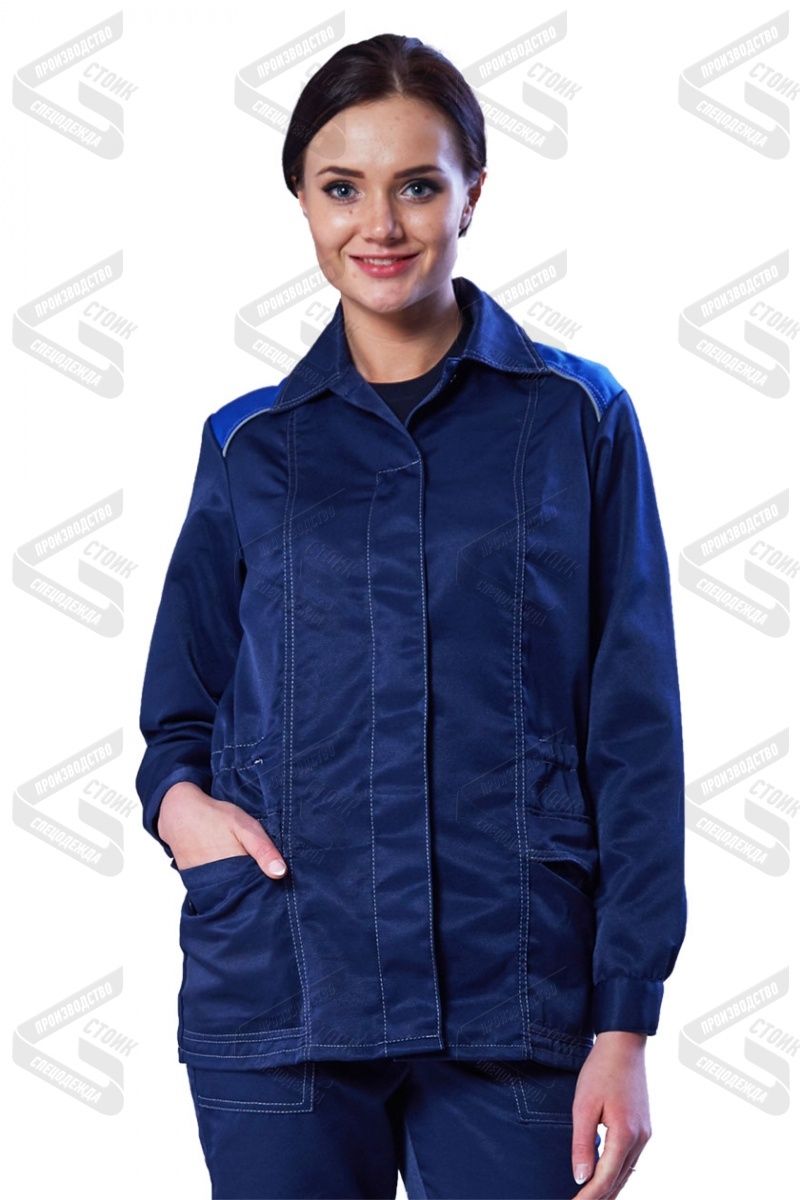 Куртка прямая, с центральной бортовой супатной застежкой на петли и пуговицы. Воротник отложной. Полочки с рельефами. Два нижних накладных кармана с фигурными клапанами. Левый нагрудный карман с отделением для ручки. Рукава с манжетами, застегивающимися на пуговицу. В области талии кулиса со шнуром и фиксатором. По шву притачивания кокетки СВ кант.