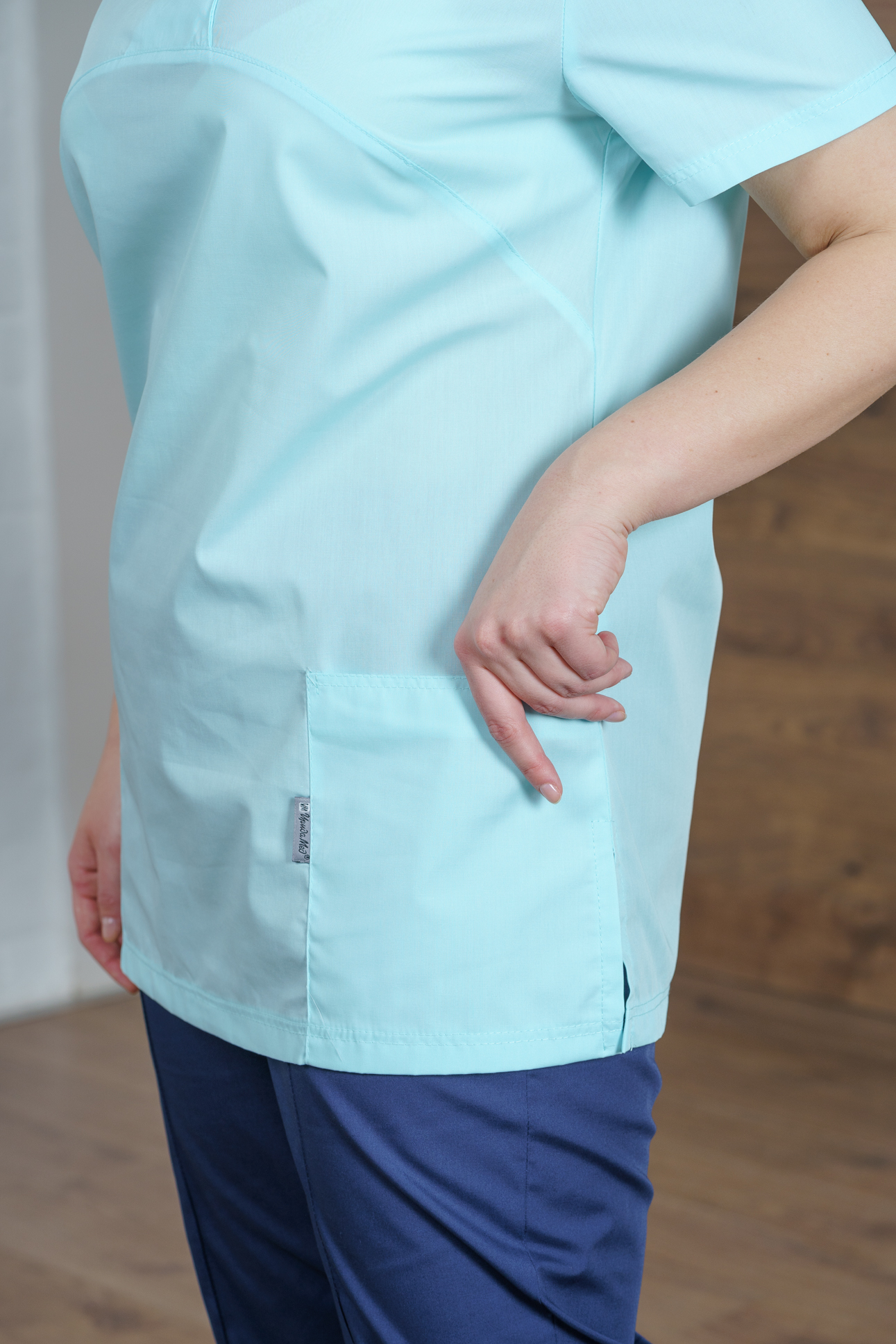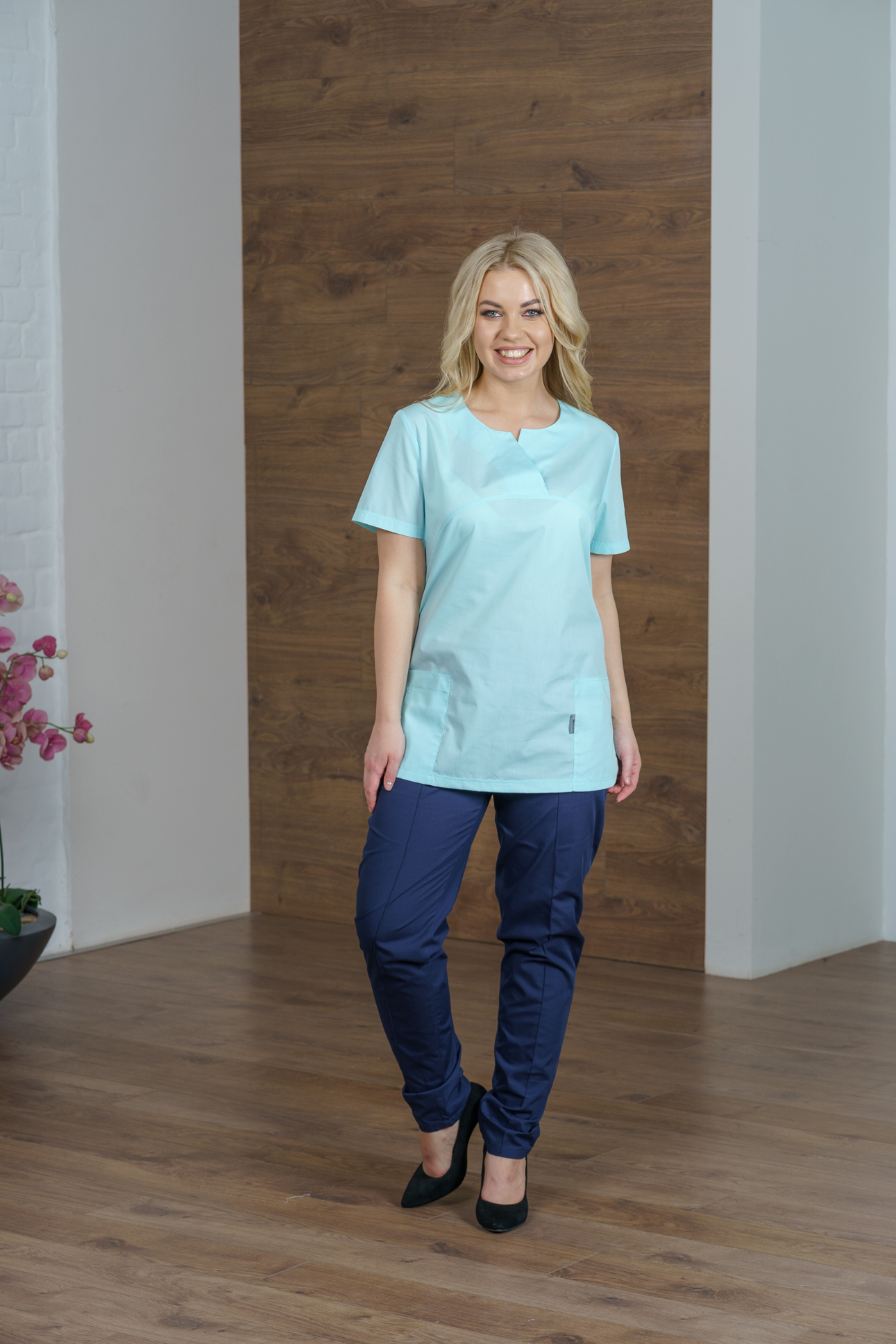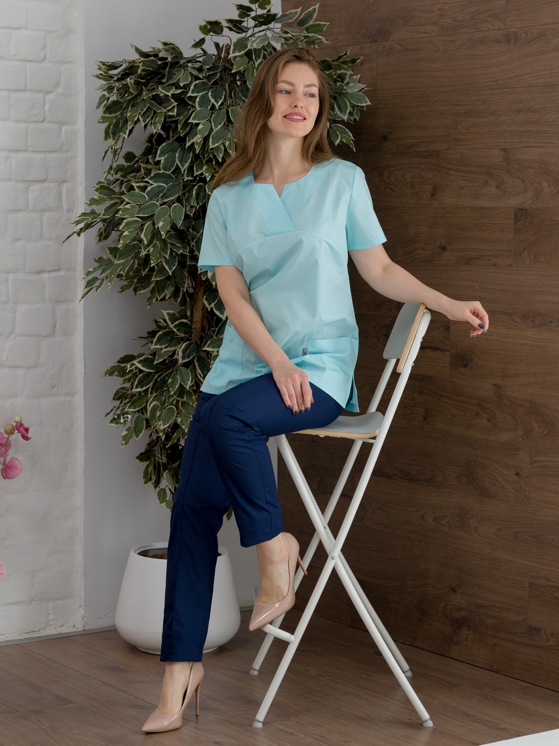 Костюм женский состоит из блузы с коротким рукавом, тремя накладными карманами. Закруглённая кокетка с фигурным v образным вырезом. Брюки классические, зауженные к низу со стрелками.