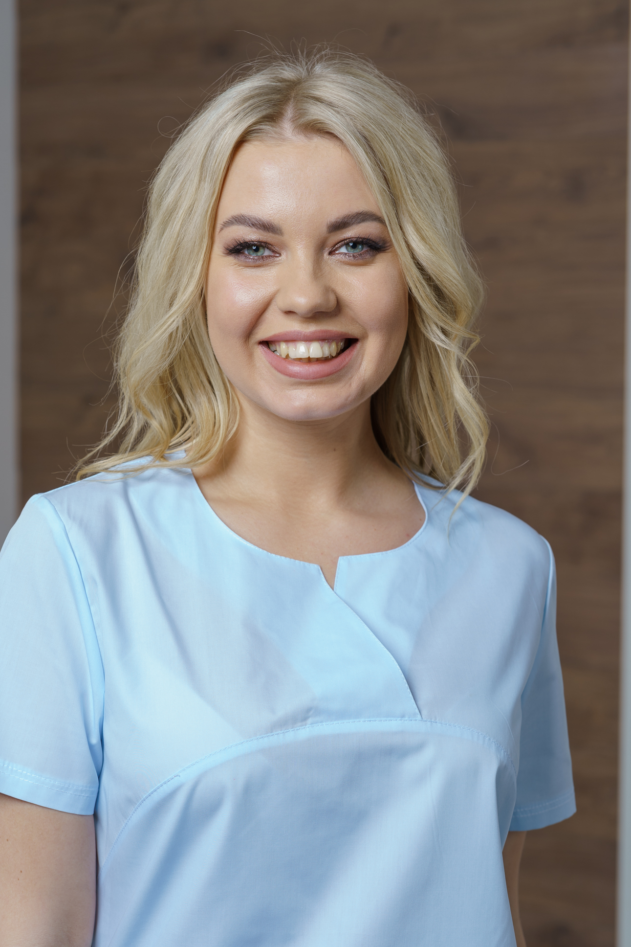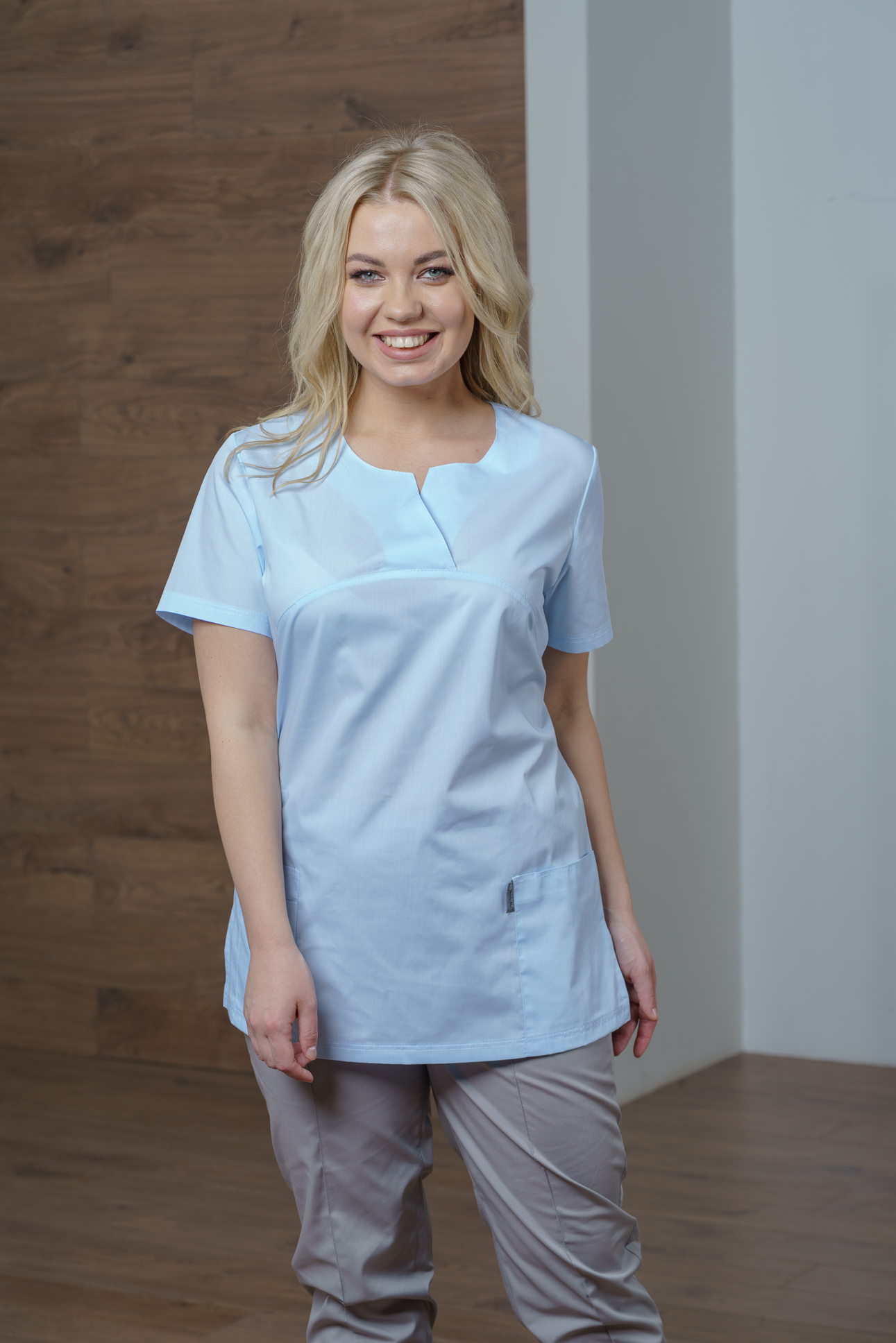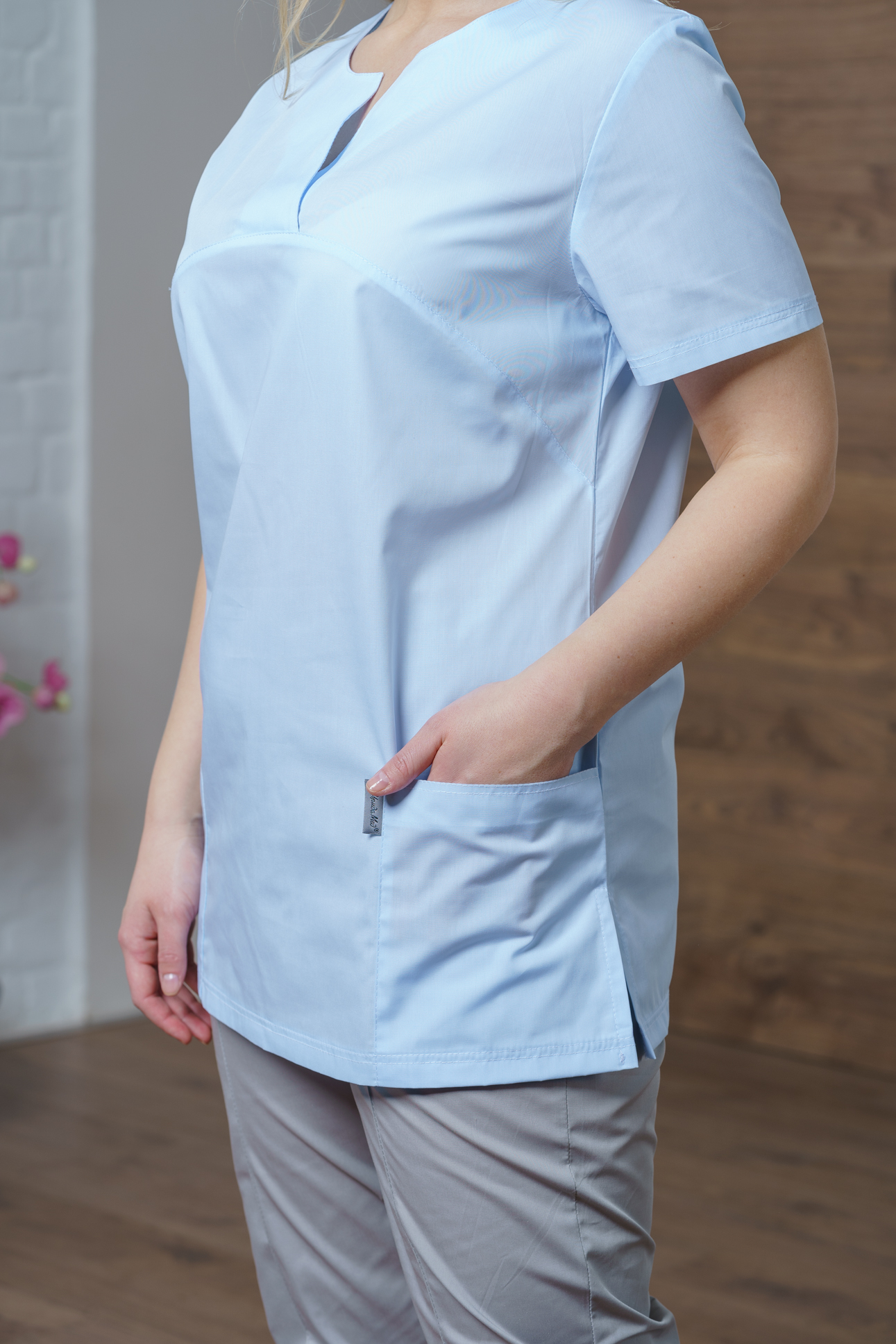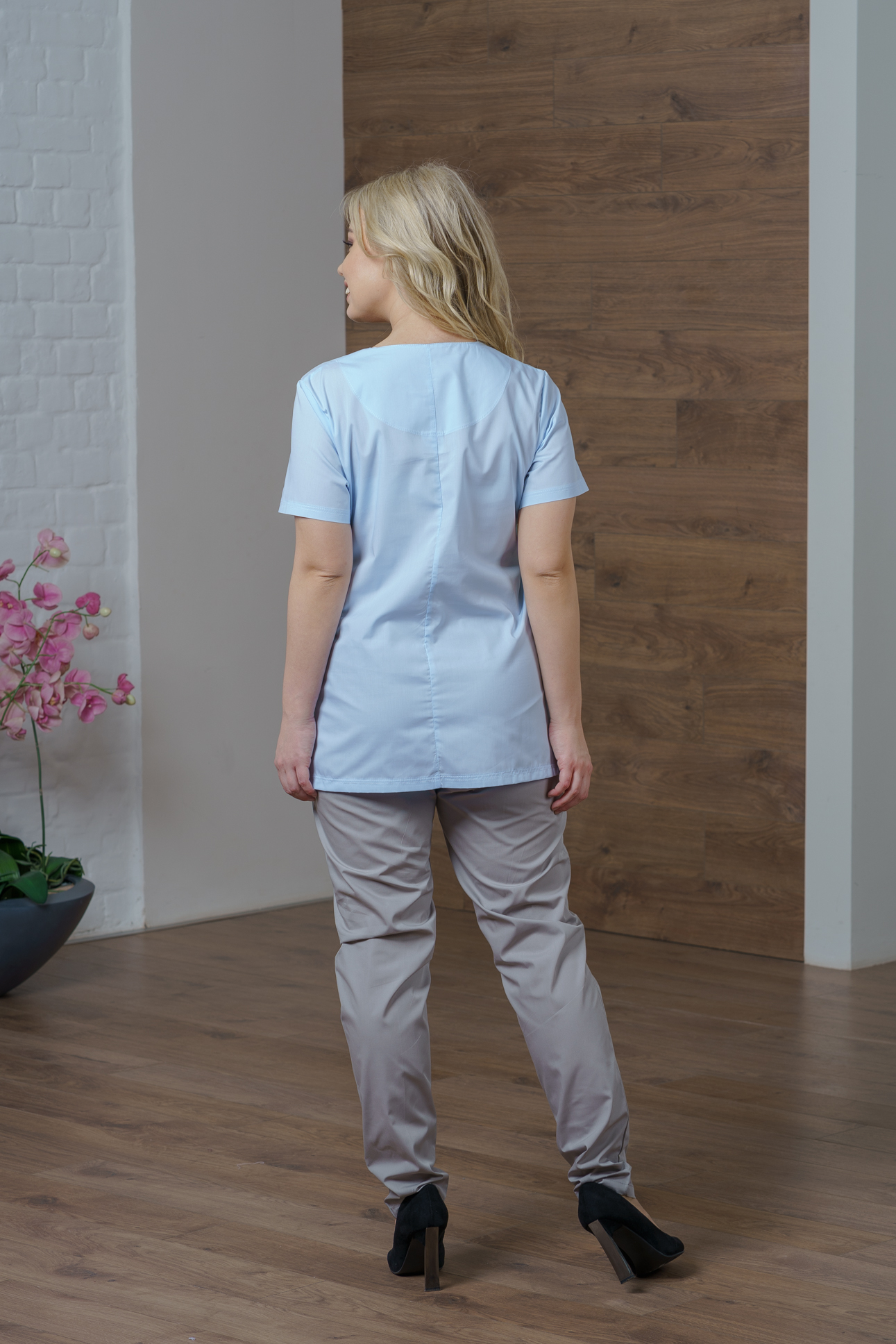 Костюм женский состоит из блузы с коротким рукавом, тремя накладными карманами. Закруглённая кокетка с фигурным v образным вырезом. Брюки классические, зауженные к низу со стрелками.