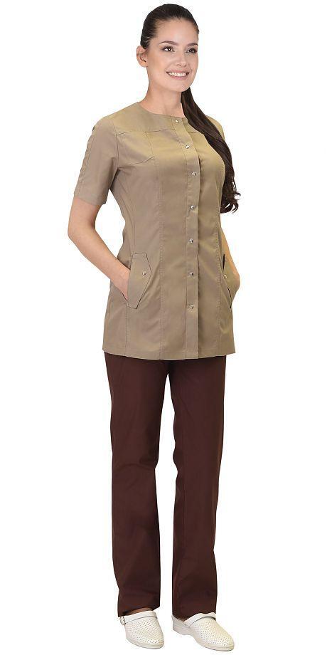 Костюм комбинированный из ткани двух цветов состоит из блузы бежевого цвета и брюк цвета шоколад.