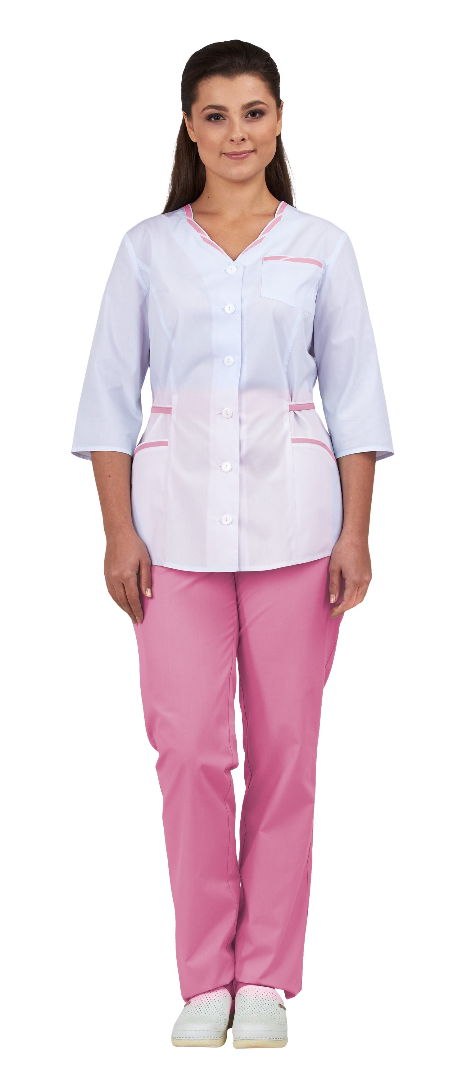 - блуза полуприлегающего силуэта с центральной застежкой на пуговицы и фигурной линией низа,
