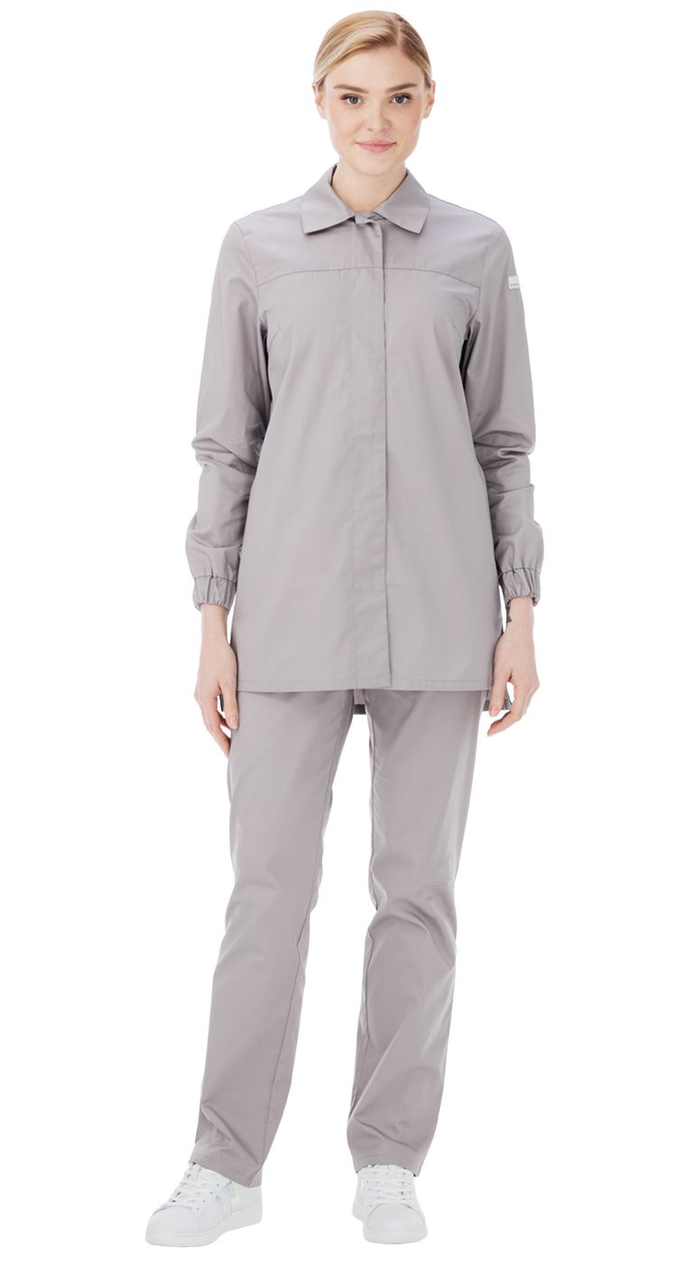 Воротник отложной, рубашечного типа. Застежка центральная на потайные кнопки. На изнаночной стороне кокетки справа потайной карман на липучке.