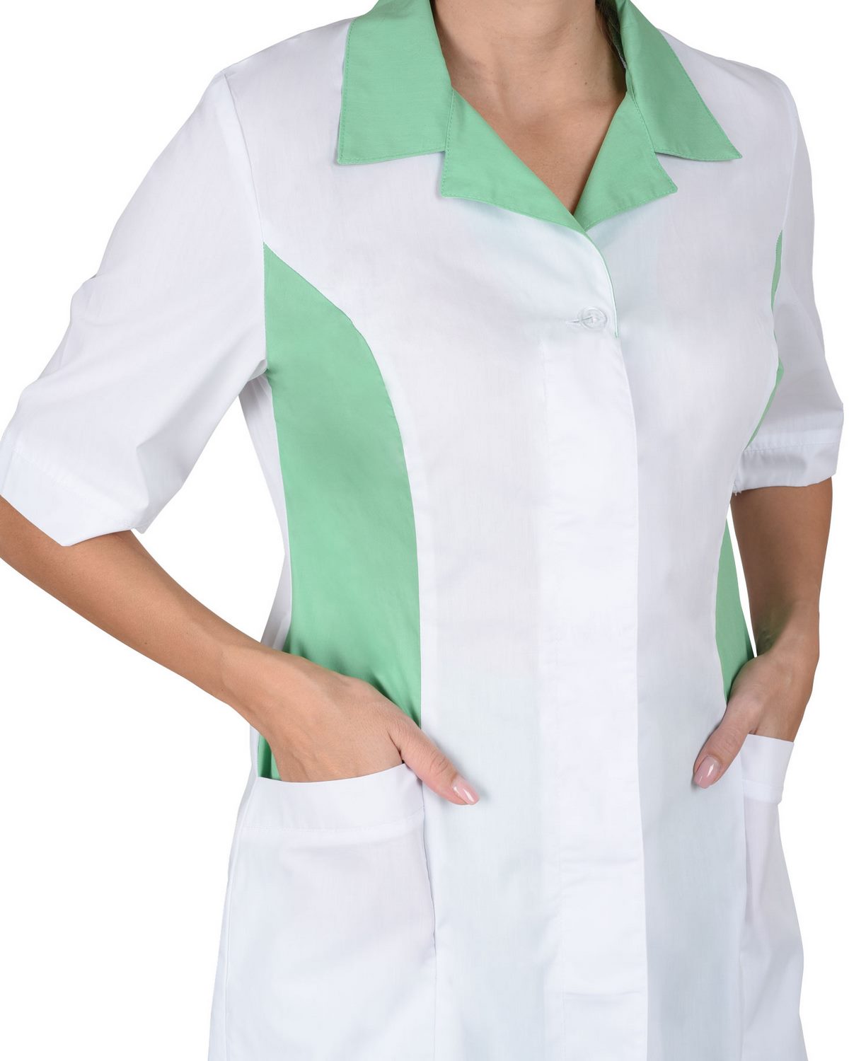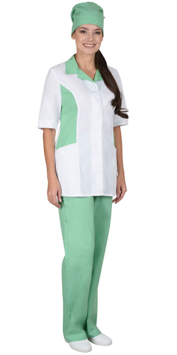 Костюм состоит из блузы, брюк и колпака. Блуза с центральной супатной застежкой на пуговицы. Боковые детали полочек, воротник и колпак из отделочной тканию Рукава короткие. Брюки прямого покроя на резинке. Колпак с фигурной отделкой.