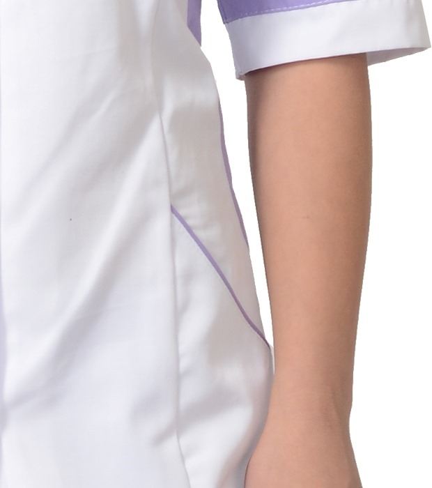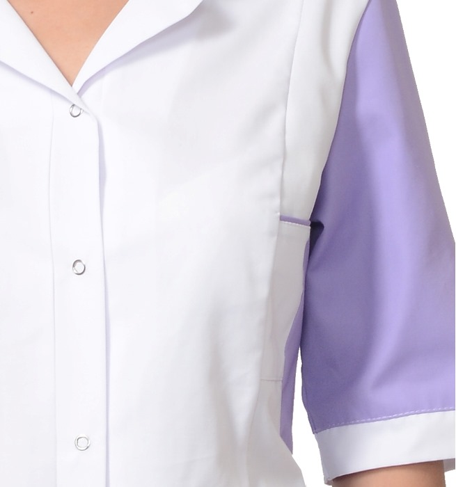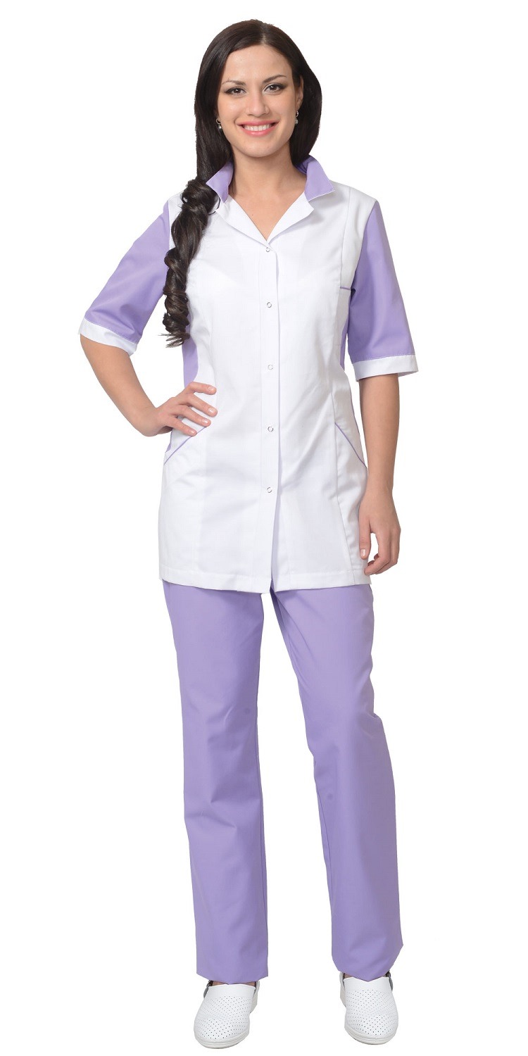 Костюм состоит из блузы и брюк. Блуза полуприлегающего силуэта, с центральной застёжкой на рубашечные кнопки. Воротник отложной с лацканами. На полочке расположены верхний накладной и нижние внутренние фигурные карманы. Рукава втачные, укороченные с манжетами. Детали блузы выполнены из отделочной ткани в цвет брюк. Брюки прямого силуэта, с застёжкой гульфика на тесьму «молния». Пояс притачной, застёгивающийся на петлю и пуговицу. Ширина пояса регулируется эластичной тесьмой в области боковых швов.