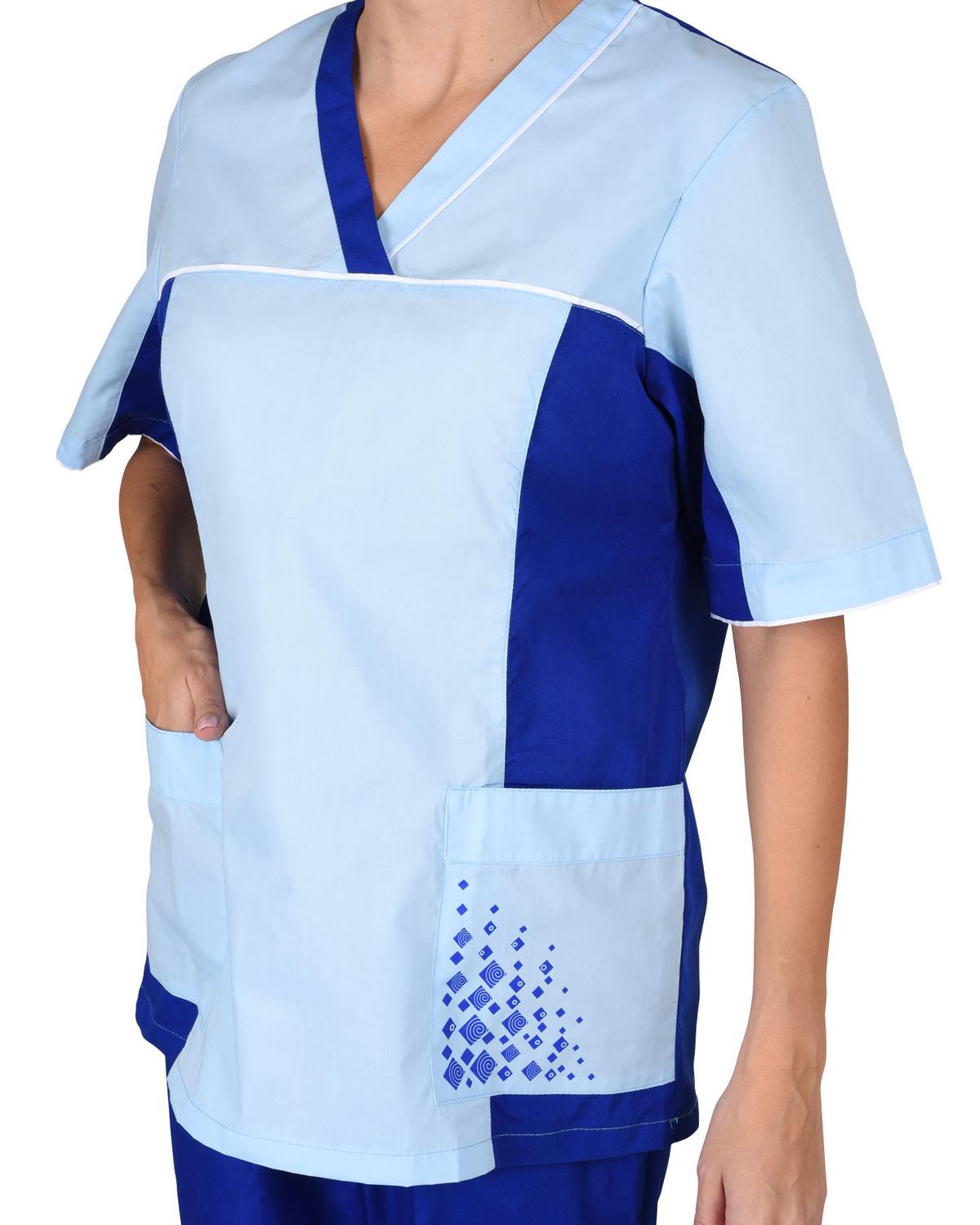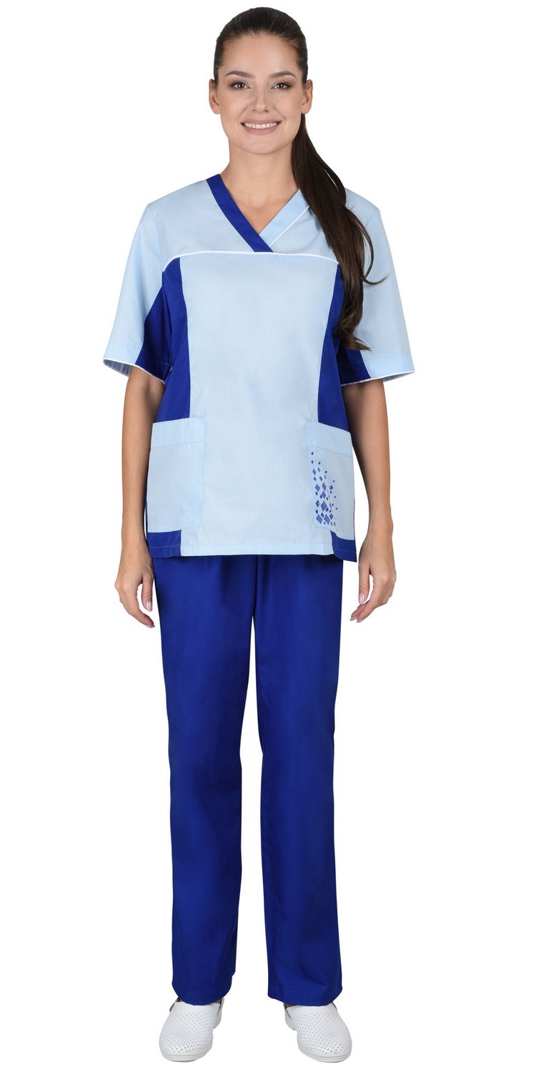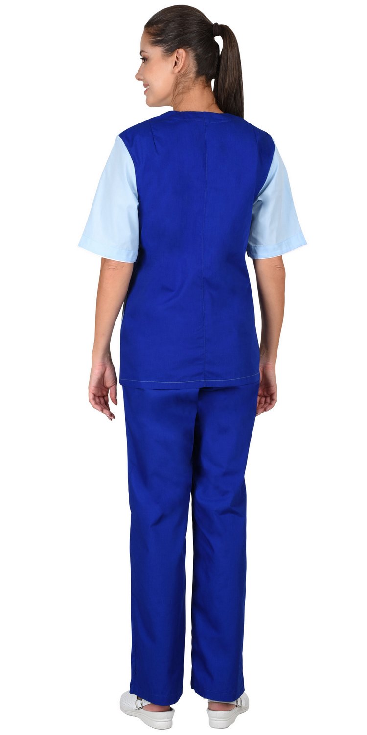 Костюм состоит из блузы и брюк. Блуза полуприлегающего силуэта, с V- образным вырезом горловины, с нижними накладными карманами. Рукава короткие. Блуза с отделочными деталями и кантами. Брюки прямые, с притачным поясом, стянутым эластичной лентой.