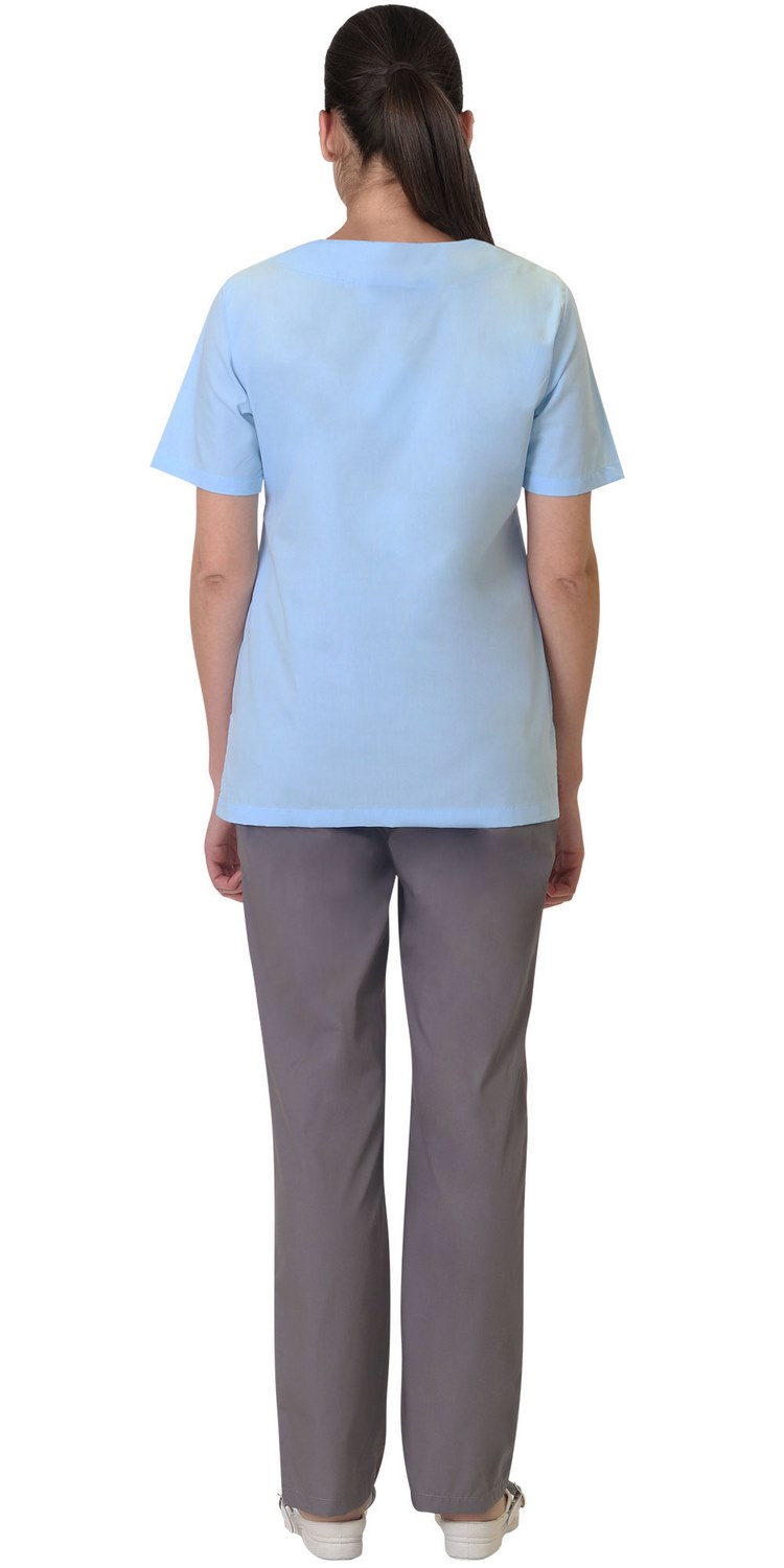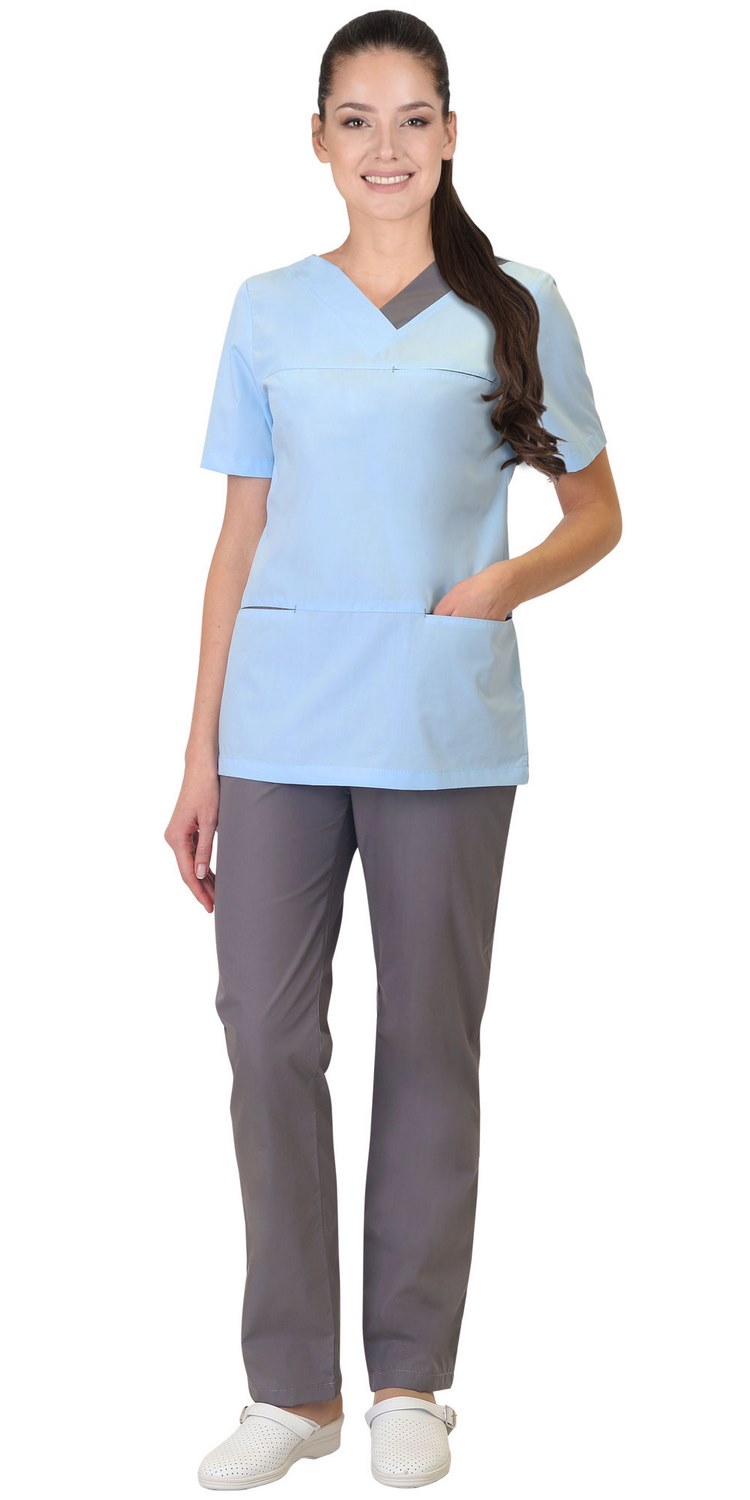 Костюм комбинированный из ткани двух цветов состоит из блузы голубого цвета и брюк темно-серого цвета.