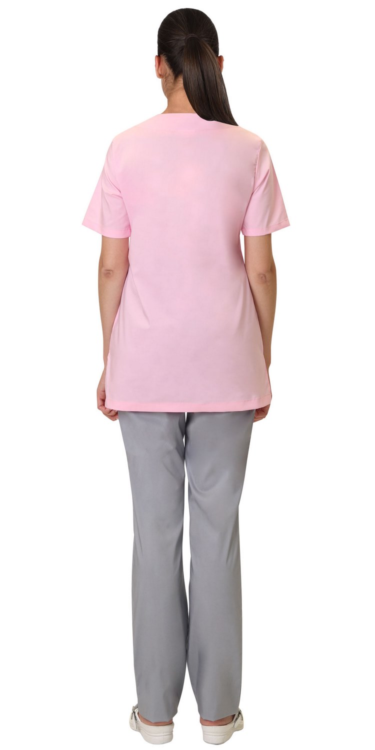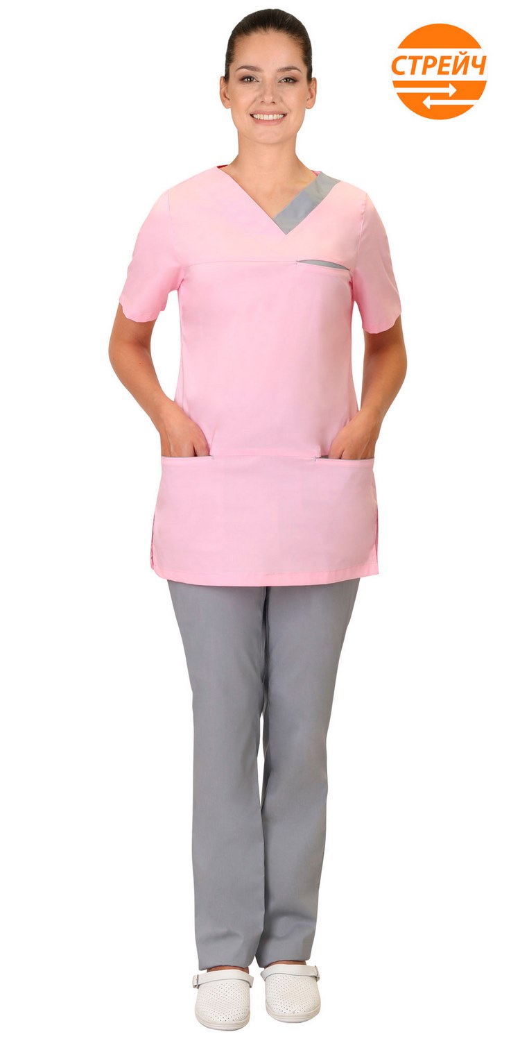 Костюм комбинированный из ткани двух цветов состоит из блузы розового цвета и брюк серого цвета.