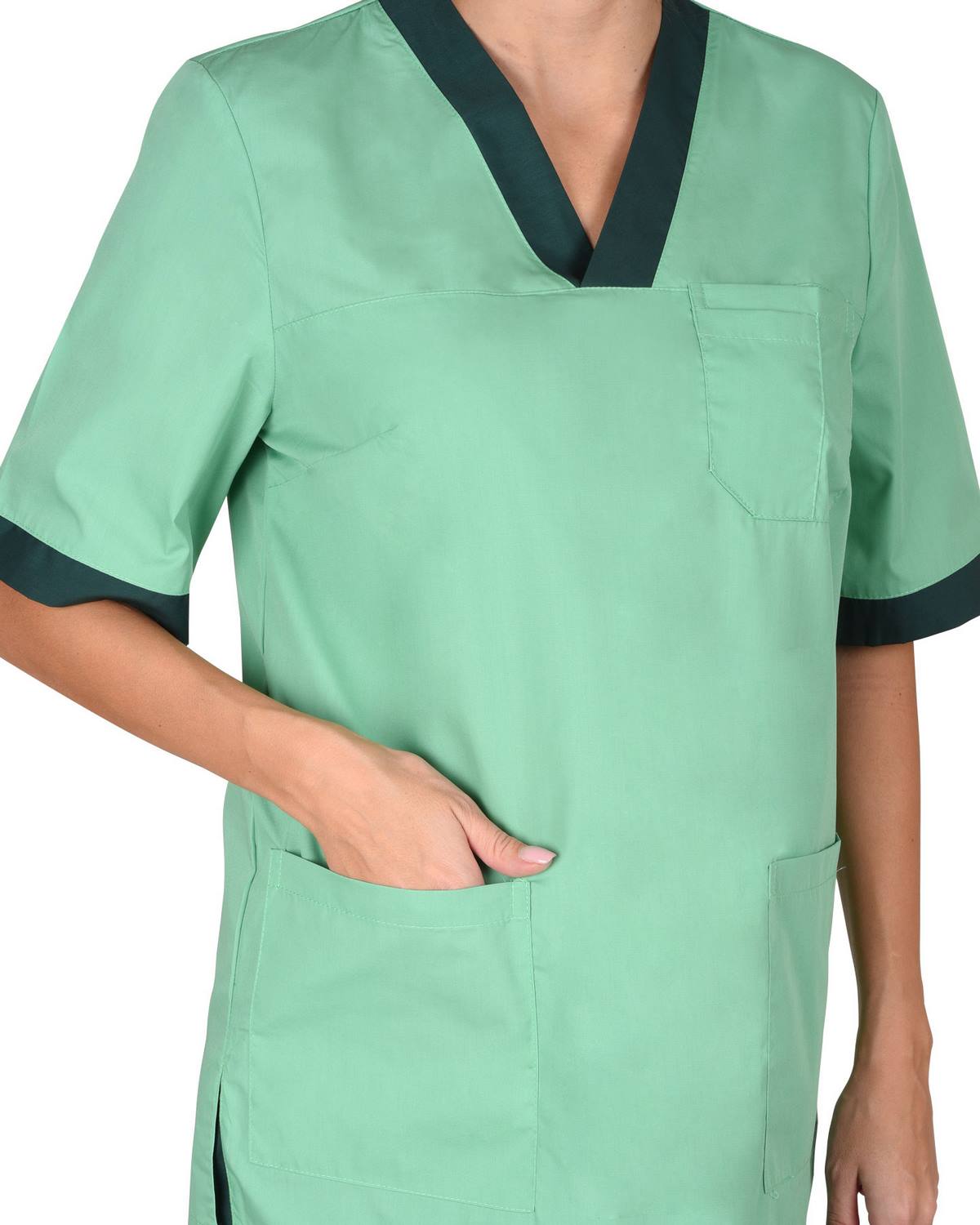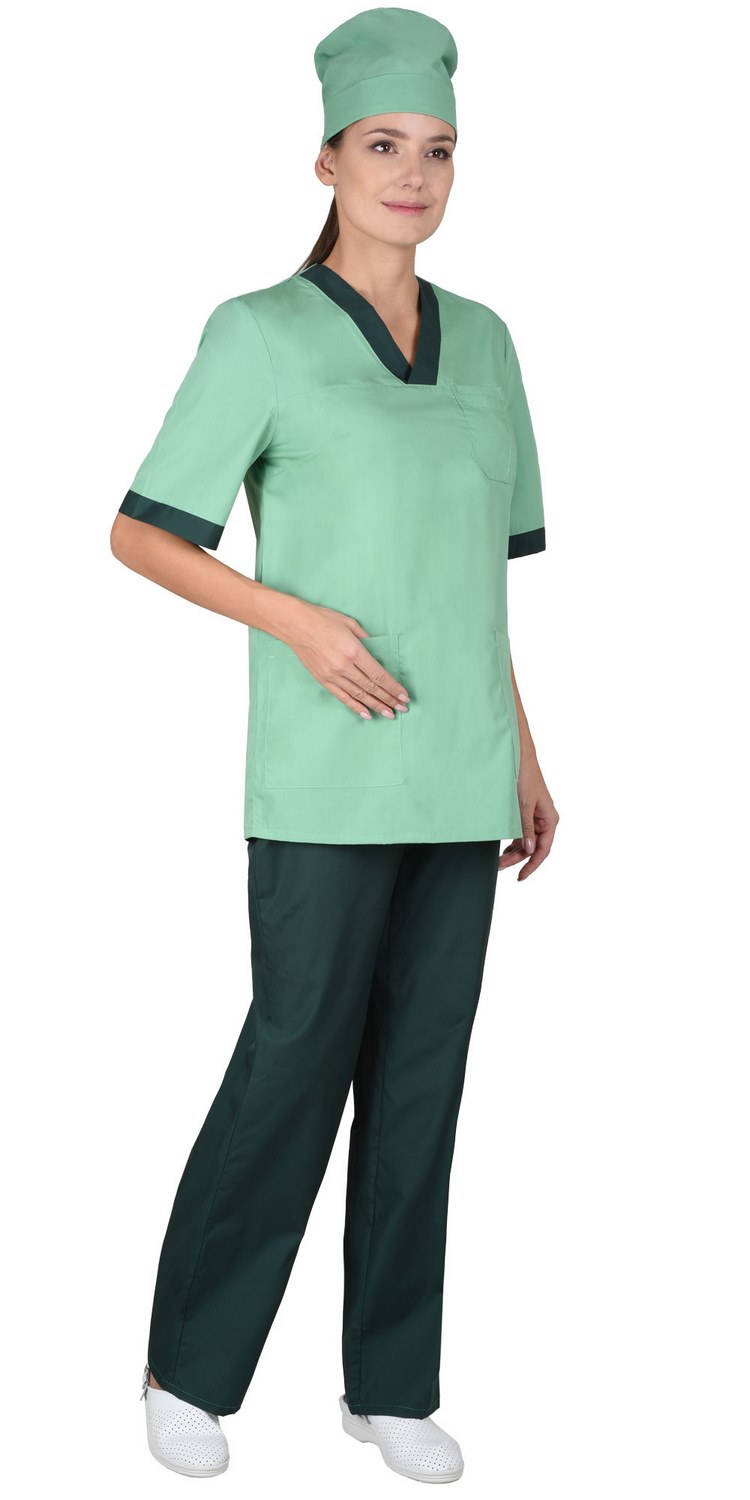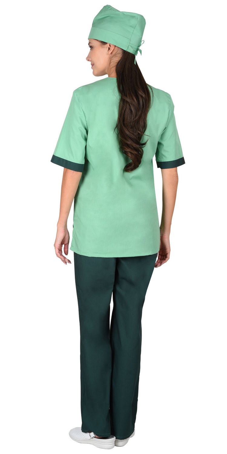 Костюм состоит из блузы, брюк и колпака. Блуза прямого покроя с V-образным вырезом горловины. На полочке один верхний и два нижних накладных кармана. Рукава короткие. Вырез горловины и манжеты рукавов из контрастной ткани. Брюки прямого покроя на резинке. Колпак одноцветный с отворотом.