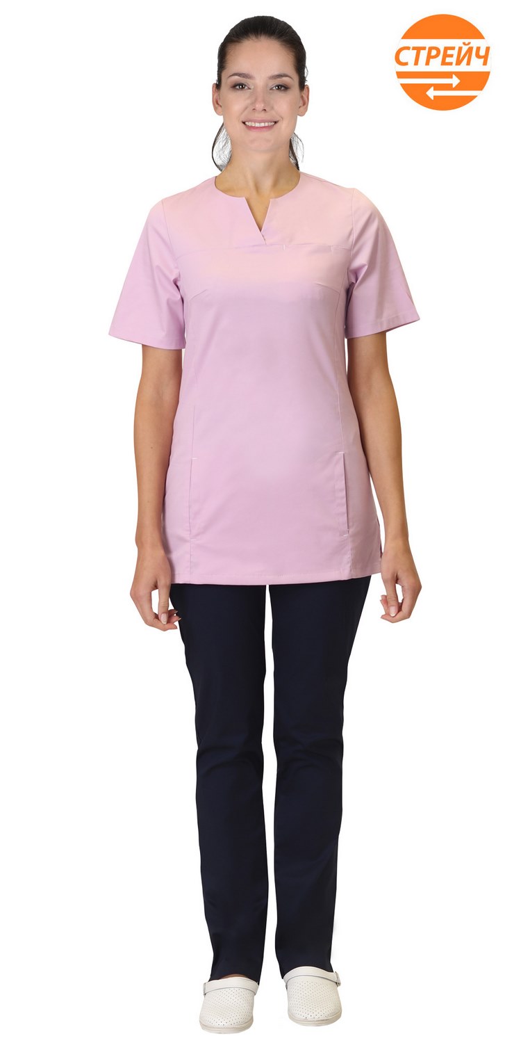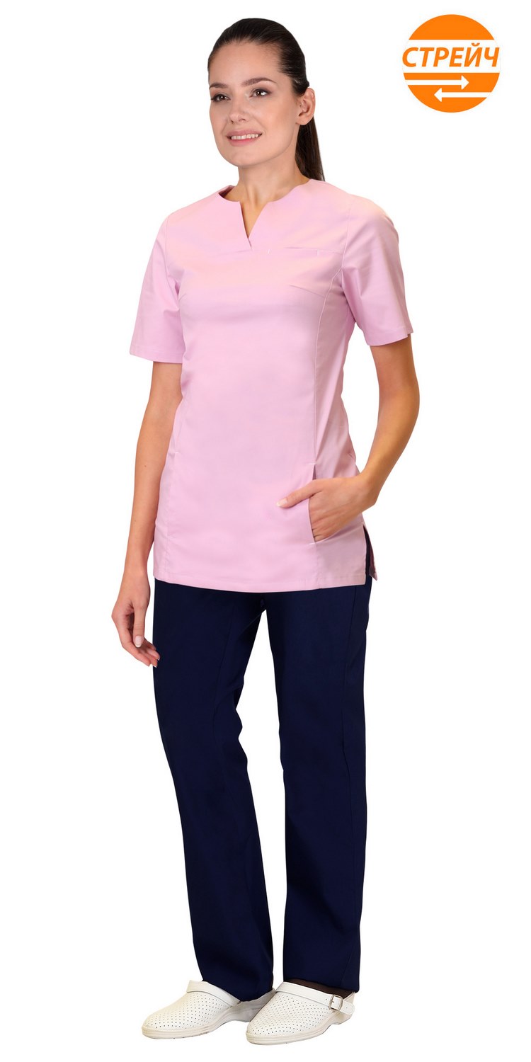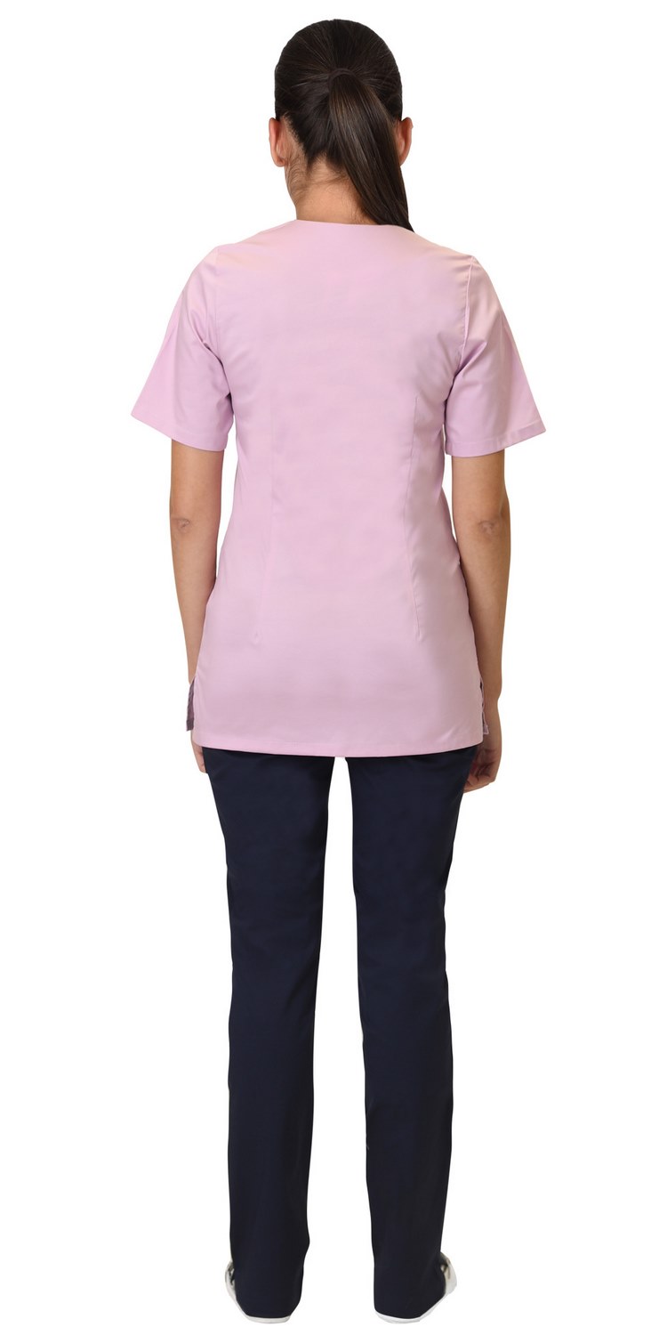 Костюм женский комбинированный из ткани двух цветов состоит из блузы розового цвета и брюк темно-синего цвета. Блуза полуприлегающего силуэта с короткими рукавами, без застёжки. Фигурный вырез горловины. С левой стороны нагрудный карман и два кармана в рельефах. По боковым швам разрезы. Брюки прямые на притачном поясе с застежкой на молнию и пуговицу. Два боковых внутренних кармана и два задних накладных кармана.