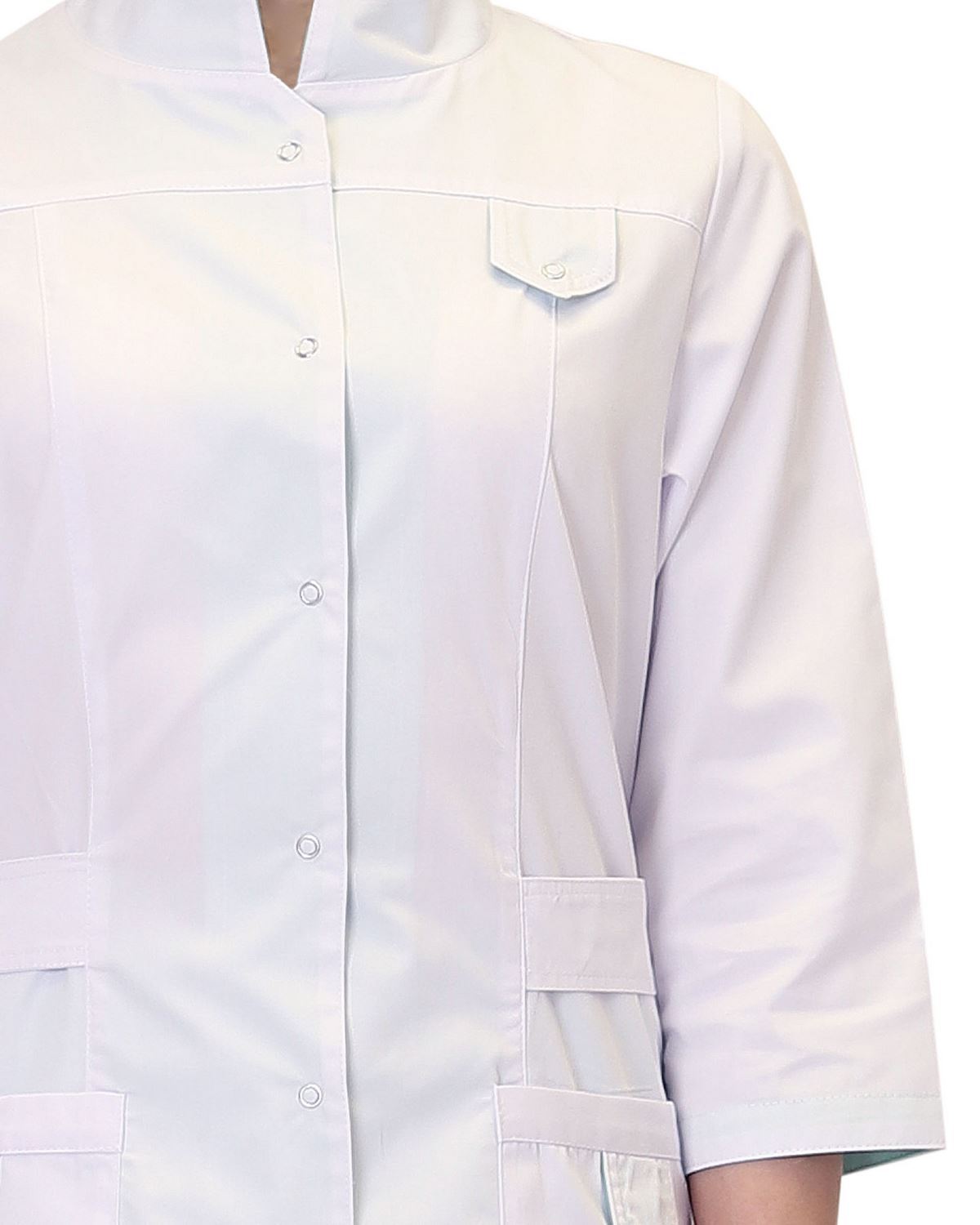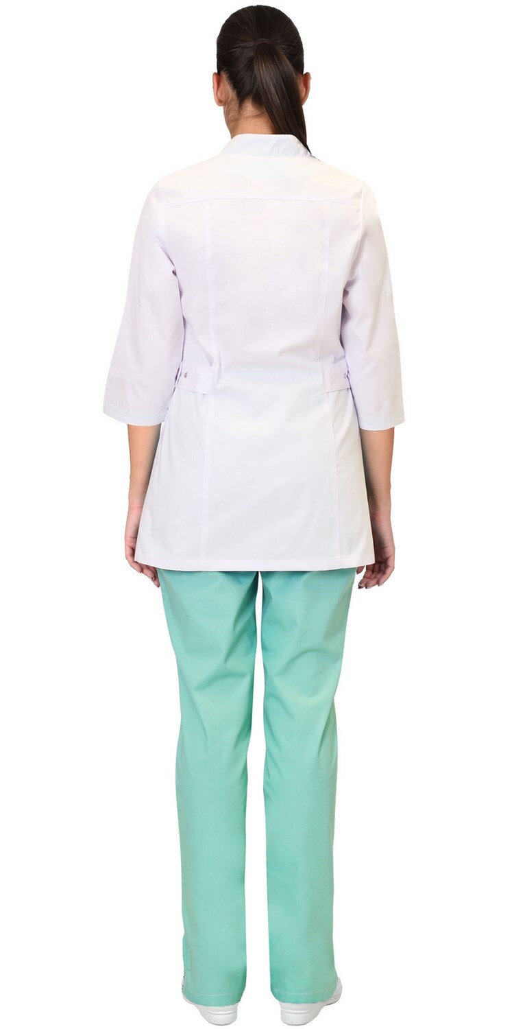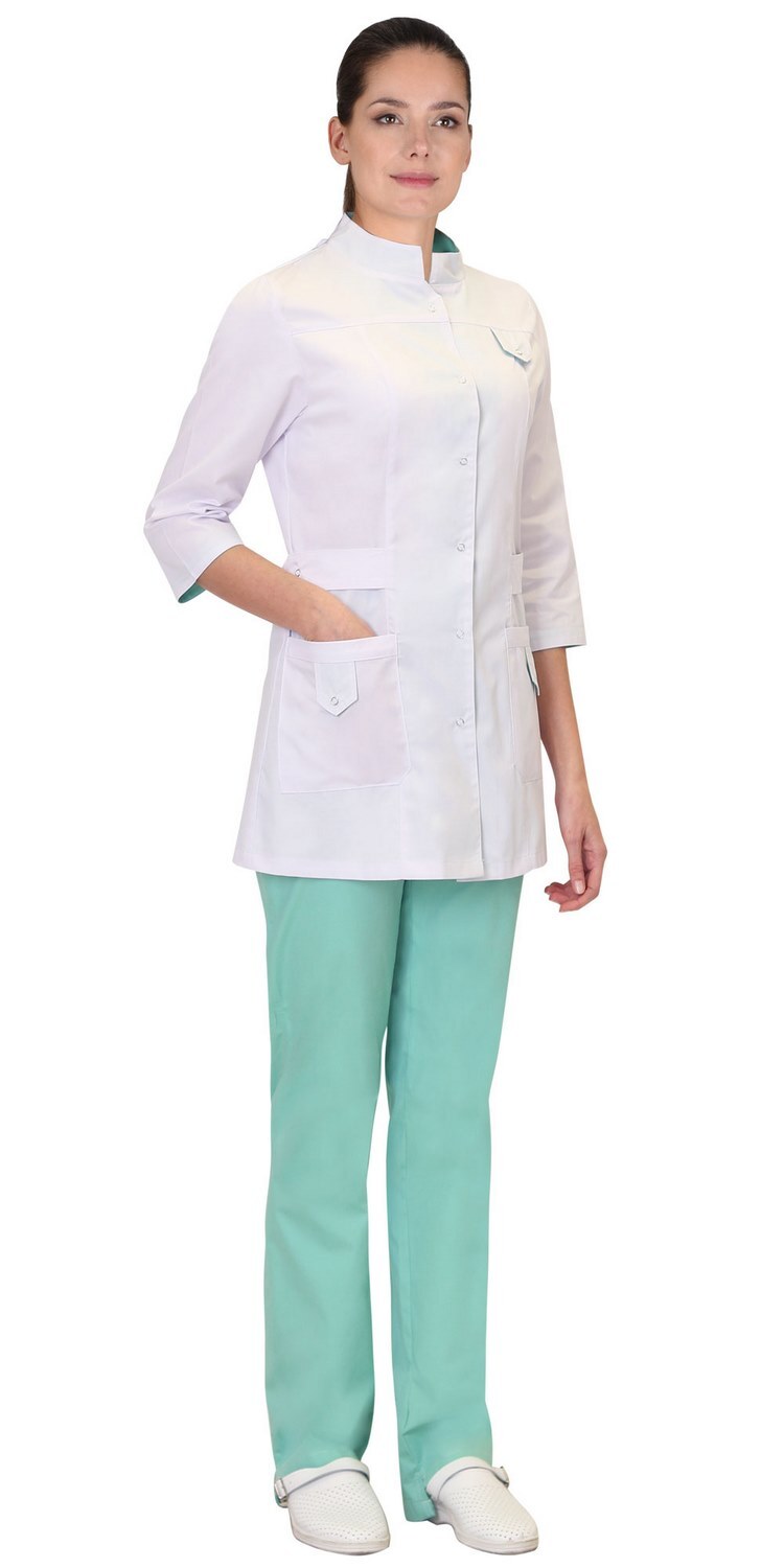 Костюм женский, комбинированный из ткани двух цветов, состоит из блузы белого цвета с отделкой и брюк из отделочной ткани. Блуза полуприлегающего силуэта с центральной сквозной бортовой застежкой на 6 кнопок. Воротник стойка. Два нижних накладных кармана. Рукава втачные, 3/4. Брюки прямые, с застёжкой на пуговицу и на тесьму «молния». Пояс частично стянут резинкой по боковым сторонам.