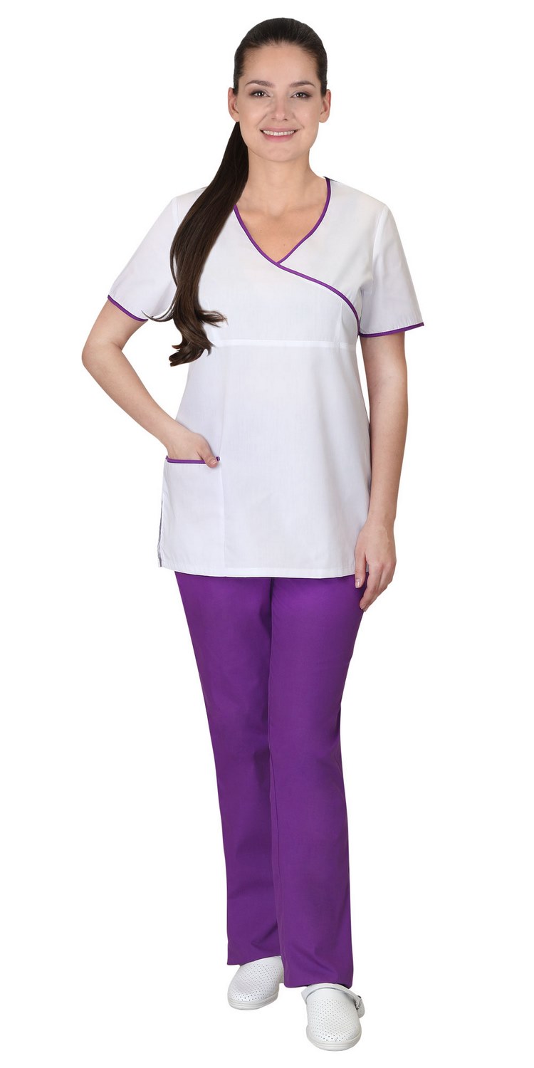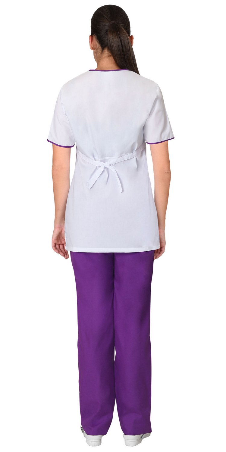 Костюм женский комбинированный из ткани двух цветов состоит из блузы белого цвета и брюк фиолетового цвета. Блуза полуприлегающего силуэта, без застёжки, с V – образным вырезом, с накладным карманом, с втачными короткими рукавами. Горловина, низ рукавов и верх кармана окантованы косой бейкой из ткани отделка. Блуза с завязывающимся сзади поясом. Брюки прямые с притачным поясом стянутым резинкой.