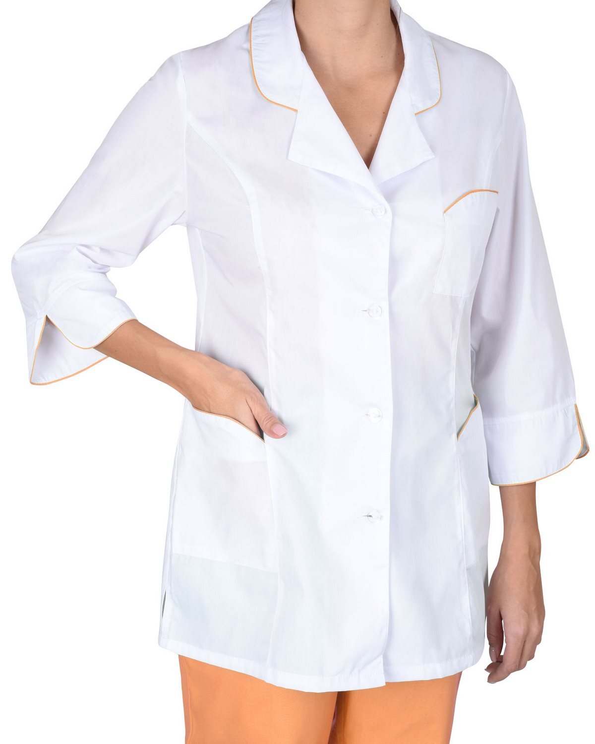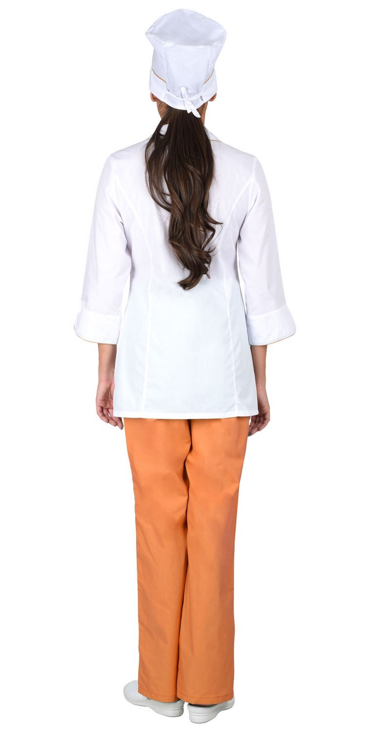 Костюм состоит из блузы, брюк и колпака. Блуза с центральной застежкой на пуговицы. На полочках вертикальные рельефы. Фигурные карманы, воротник и манжеты с отделкой в виде канта контрастного цвета. Рукава 3/4. Брюки свободного покроя на резинке. Колпак с фигурной отделкой.