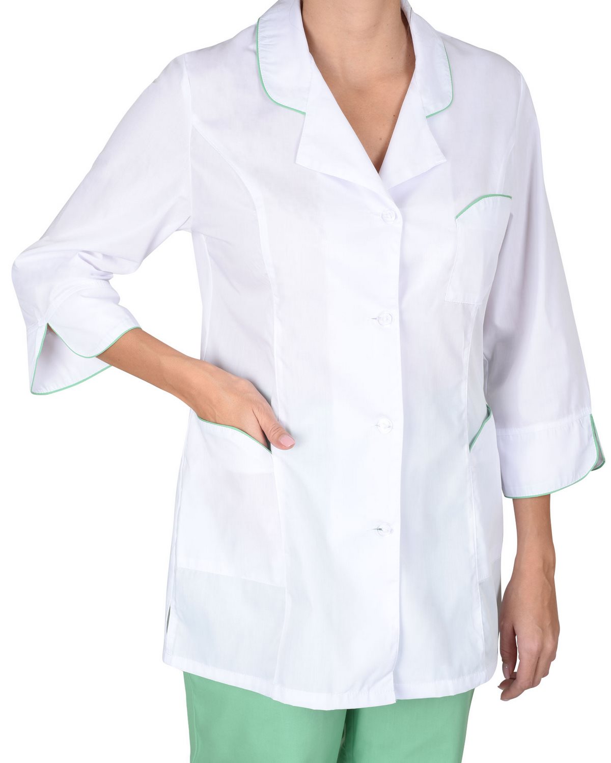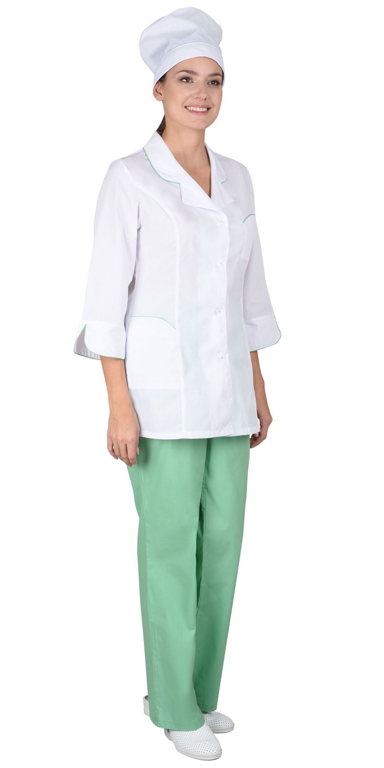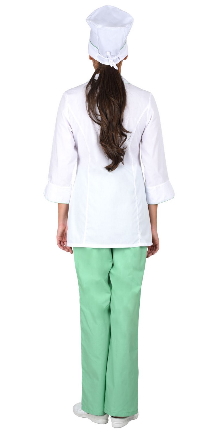 Костюм состоит из блузы, брюк и колпака. Блуза полуприлегающего силуэта с центральной застежкой на пуговицы. На полочках вертикальные рельефы. Фигурные карманы, воротник и манжеты с отделкой в виде канта контрастного цвета. Рукава 3/4. Брюки свободного покроя на резинке. Колпак с фигурной отделкой.