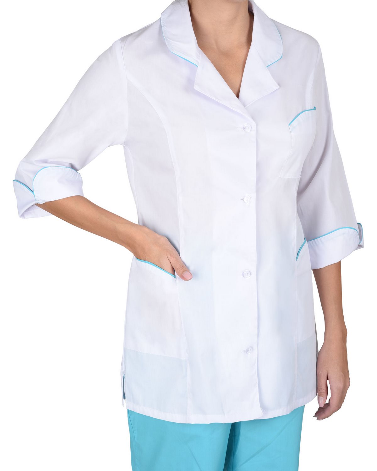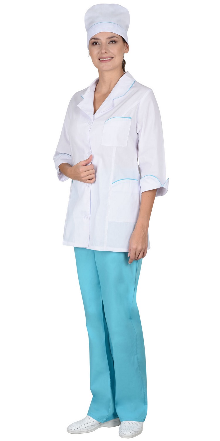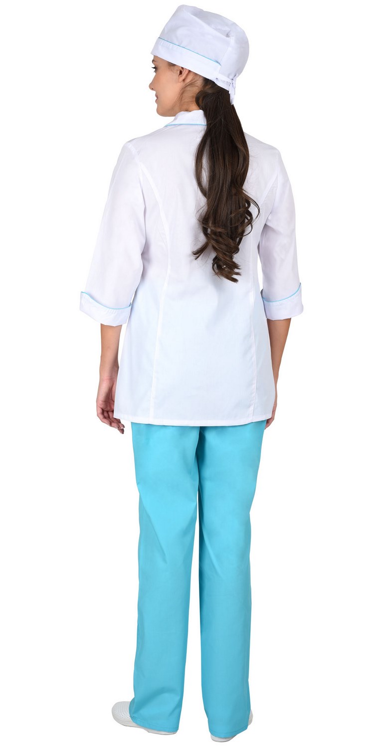 Костюм состоит из блузы, брюк и колпака. Блуза с центральной застежкой на пуговицы. На полочках вертикальные рельефы. Фигурные карманы, воротник и манжеты с отделкой в виде канта контрастного цвета. Рукава 3/4. Брюки свободного покроя на резинке. Колпак с фигурной отделкой.