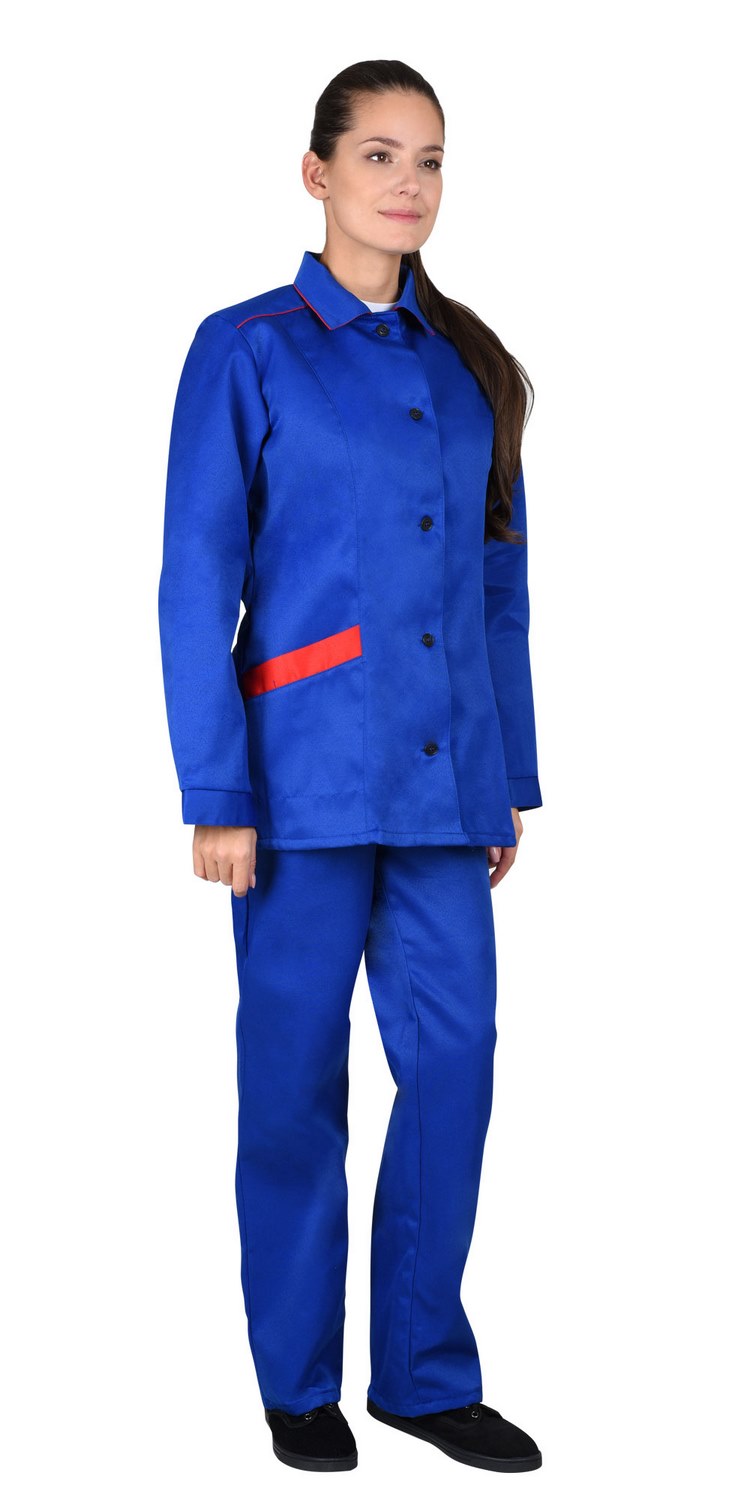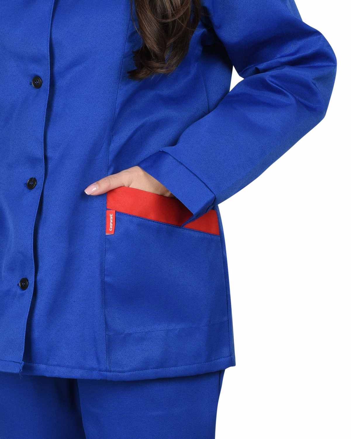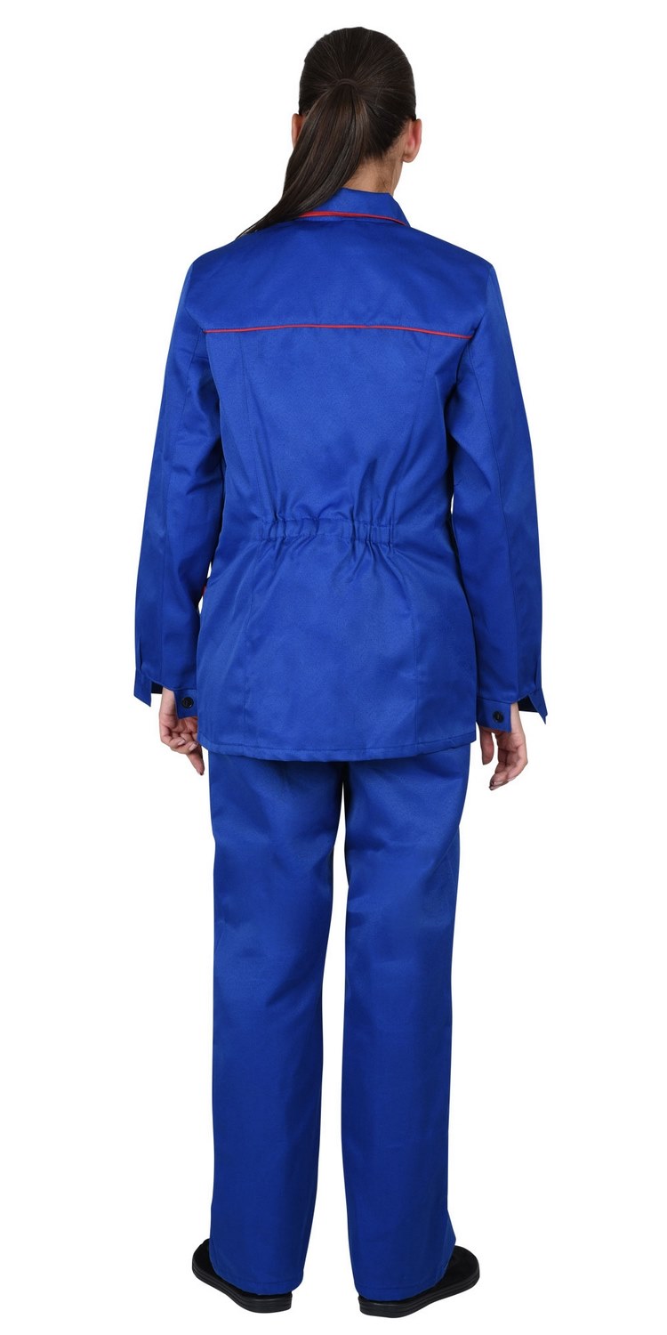 Куртка длинная, с центральной бортовой застежкой на пять петель и 5 пуговиц; с отложным воротником, с нижними накладными карманами. Рукава втачные с манжетами на пуговицах. По средней части спинки в области талии проложена кулиска с эластичной тесьмой для прилегания.