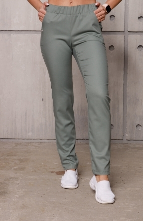 Брюки женские, слегка зауженные к низу, цельнокроенным поясом с эластичной резиной, регулирующей объем по талии.