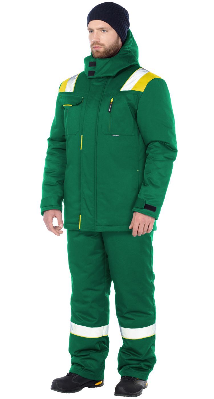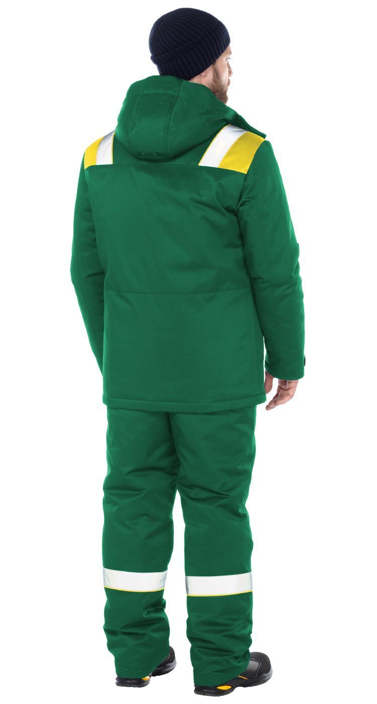 На кокетках куртки и по низу полукомбинезона расположены широкие световозвращающие полосы для безопасности при работе в условиях плохой видимости.