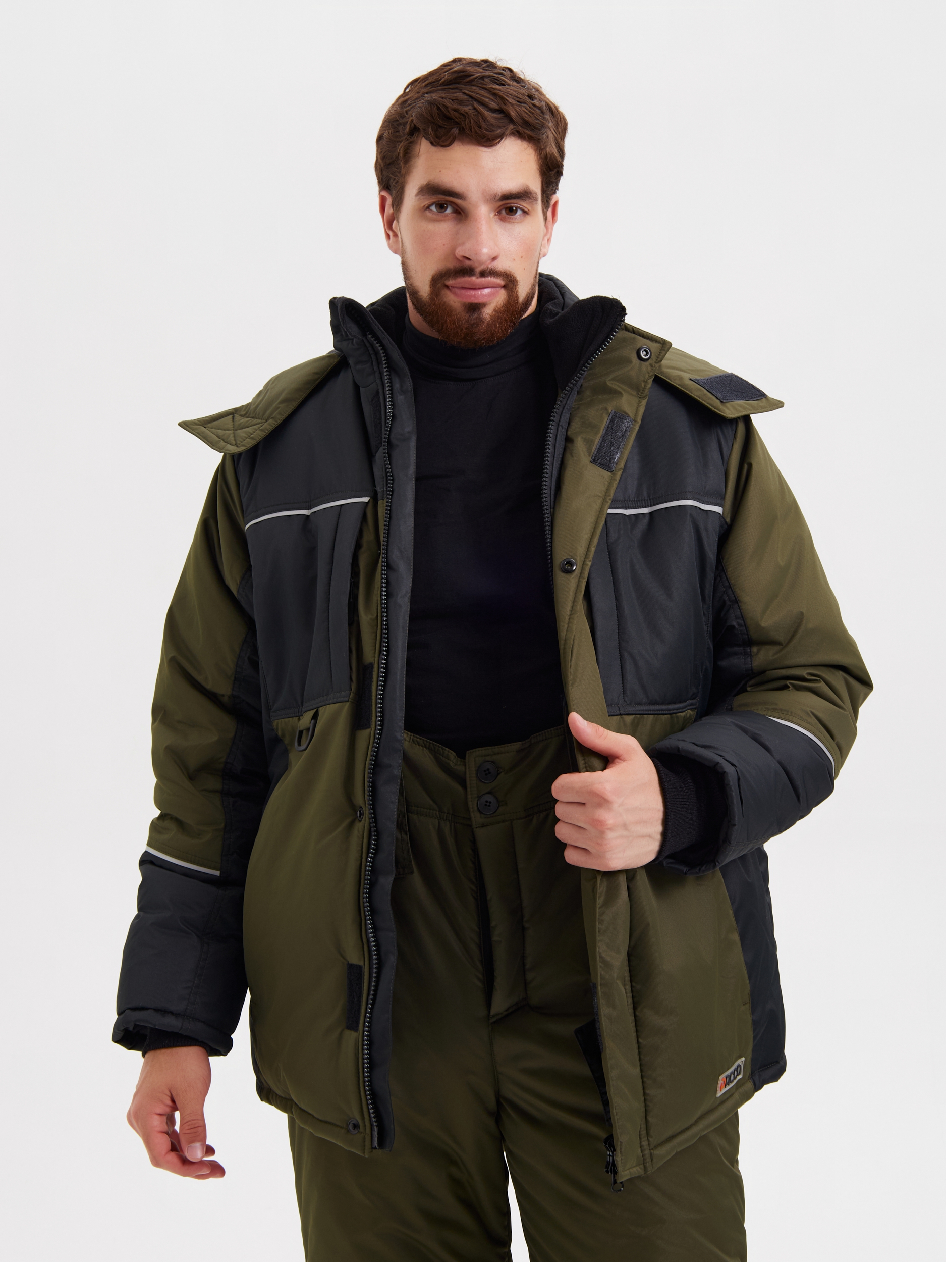 Куртка прямого силуэта с притачной утепленной подкладкой и съёмным капюшоном; центральной бортовой застежкой - «молнию» с ветрозащитной левосторонней планкой, застёгивающейся на 4 кнопки и ленты-липучки. Воротник стойка. Со стороны лица ветрозащитная планка из флиса. Два нагрудных утеплённых кармана с застёжкой – “молнией”. На нижних частях куртки вертикальные карманы в швах с застёжкой – “молнией”. Мешковины карманов из флиса. На правом нагрудном кармане располо- жен держатель для бейджа. Спинка удлинённой нижней частью. Подкладка куртки притачная утеплённая. Центральная и средняя часть спинки из флиса. Для улучшения гигроскопичности в областях подмышечных впадин и центральной нижней части спинки расположена сетка Аir-mesh. Левая полочка с прорезным карманом на застёж- ку – “молнию”. По линии талии спинки кулиса со шнуром эластичным продетым через люверсы и держатели для регулировки ширины изделия. Внутри куртки ниже линии талии - ветрозащитный пояс на резинке.