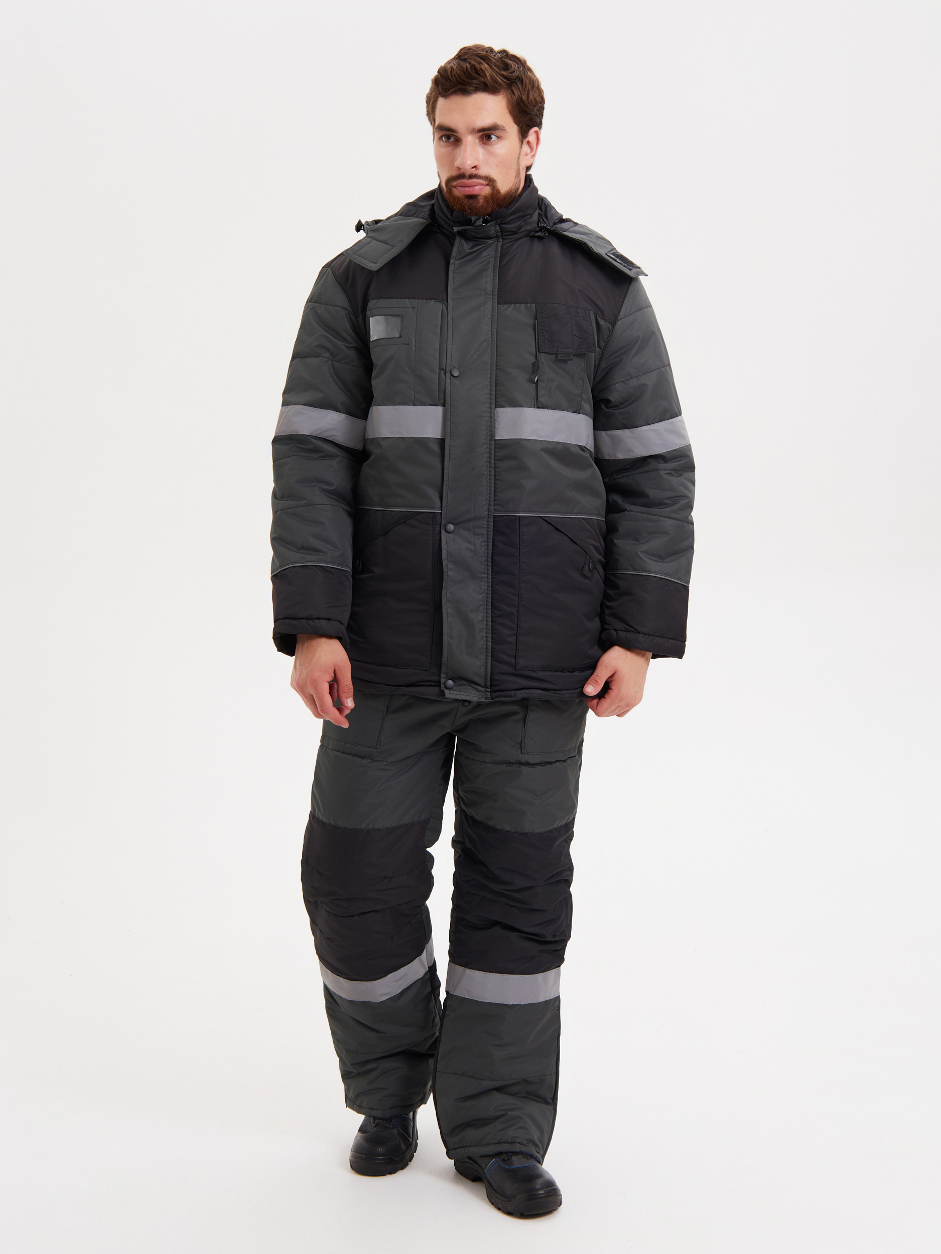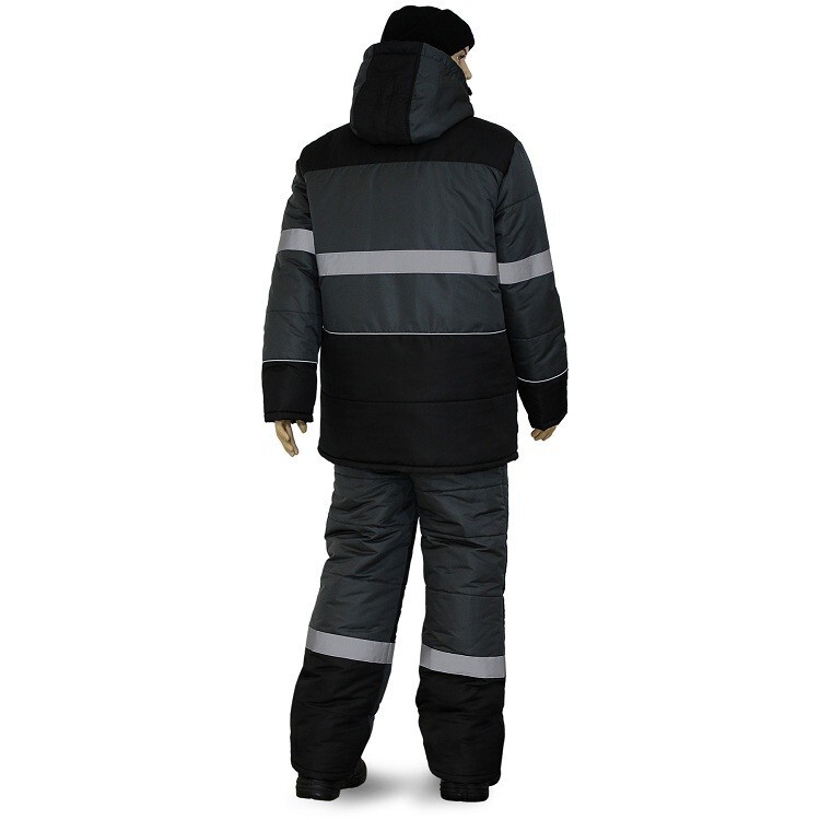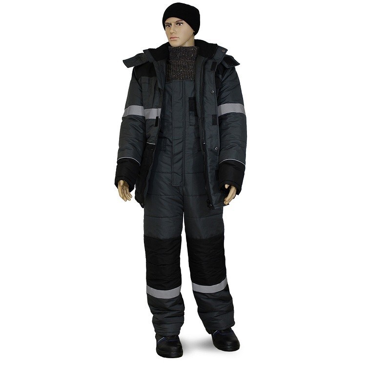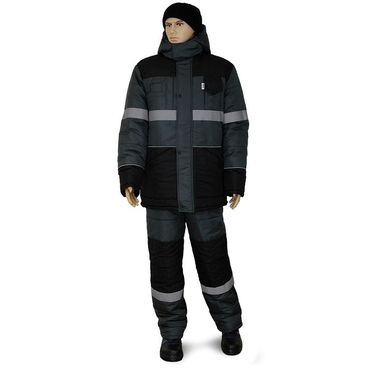 Костюм состоит из куртки и полукомбинезона. Куртка со светоотражающими полосами и кантом, с центральной застежкой на молнию, ветрозащитным клапаном на текстильную застежку с чередованием кнопок и внутреннюю планку с уголком для защиты подбородочной части от молнии. Воротник стойка, с внутренней стороны флис, съемный утепленный капюшон. На правой полочке нагрудный карман для бейджа. Рукава с внутренними полушерстяными манжетами. Полукомбинезон со светоотражающими полосами , с центральной застежкой на молнию и планку на текстильную застежку, на регулируемых по длине бретелях. На правой передней половинке нагрудный карман для сотового телефона. На спинке, по линии талии в области боковых швов, кулиса Ткань Taslan 228 Milky PU, пл.135 г. Ткань из 100% нейлона с нанесением полиуретанового покрытия