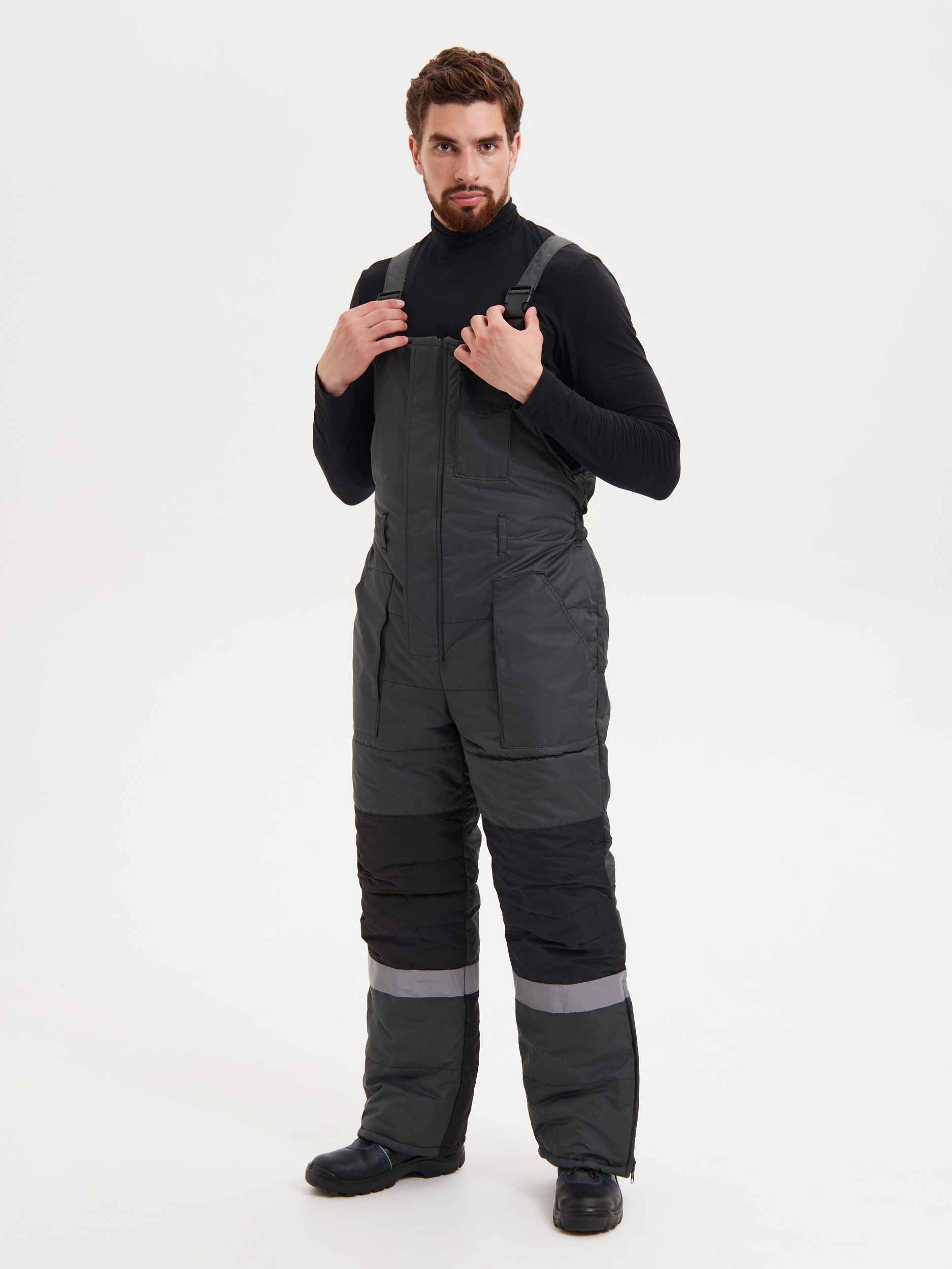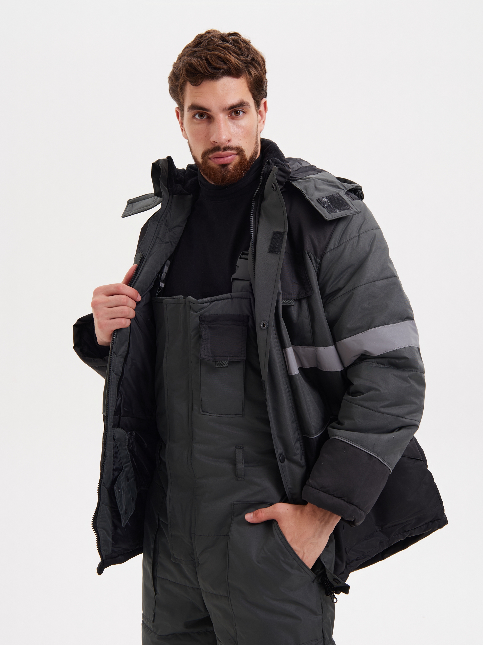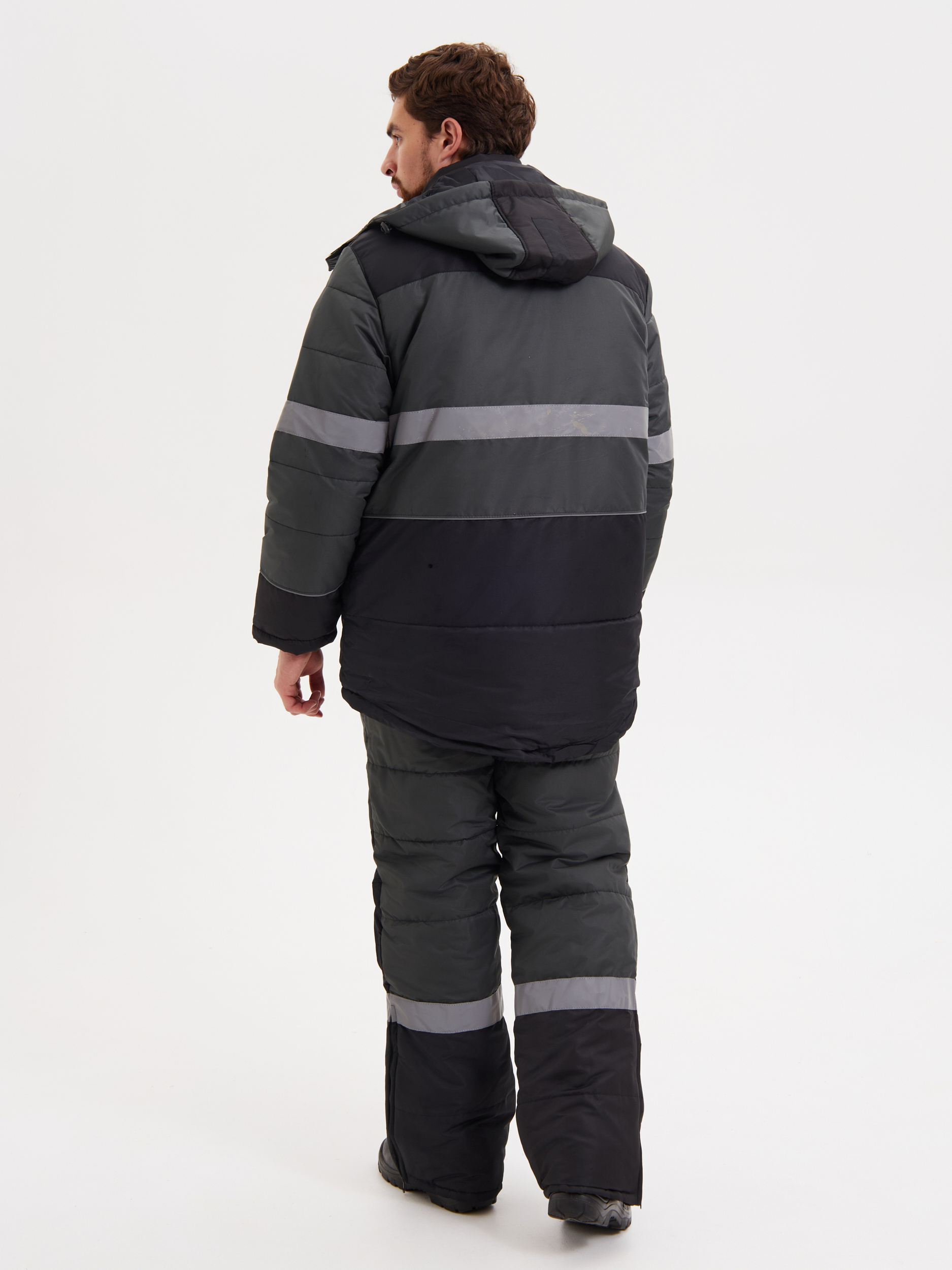 Костюм состоит из куртки и полукомбинезона. Куртка со светоотражающими полосами и кантом, с центральной застежкой на молнию, ветрозащитным клапаном на текстильную застежку с чередованием кнопок и внутреннюю планку с уголком для защиты подбородочной части от молнии. Воротник стойка, с внутренней стороны флис, съемный утепленный капюшон. На правой полочке нагрудный карман для бейджа. Рукава с внутренними полушерстяными манжетами. Полукомбинезон со светоотражающими полосами , с центральной застежкой на молнию и планку на текстильную застежку, на регулируемых по длине бретелях. На правой передней половинке нагрудный карман для сотового телефона. На спинке, по линии талии в области боковых швов, кулиса Ткань Taslan 228 Milky PU, пл.135 г. Ткань из 100% нейлона с нанесением полиуретанового покрытия