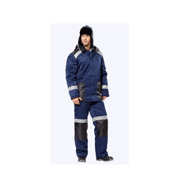 Рекомендуется для работ в условиях. Севера и средней полосы, для рабочих различных специальностей. Костюм состоит из удлиненной куртки и брюк. Куртка с супатной застежкой на петли и пуговицы. На куртке накладные карманы с косым входом из отделочной ткани. На рукава настрочены усилительные накладки из отделочной ткани и световозвращающая полоса. Воротник из искусственного меха. Съемный регулируемый капюшон. Брюки с широким поясом на бретелях и двумя накладными карманами из отделочной ткани. На коленях усилительные накладки из отделочной ткани, по верхнему срезу наколенников настрочена световозвращающая полоса.