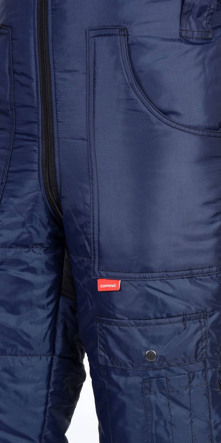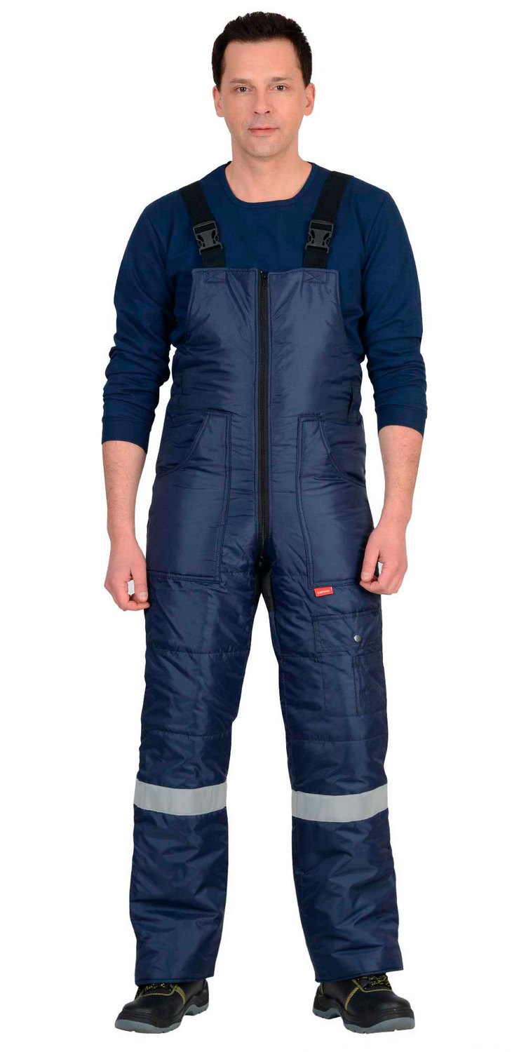 Полукомбинезон прямой, с притачной утеплённой подкладкой; с цельнокроеной грудкой и отрезной спинкой; с центральной застёжкой на 2-х замковую тесьму-«молнию» и внутренним ветрозащитным клапаном; с боковыми накладными карманами с фигурным входом; 2-мя шлевками на передней части; 2-мя шлевками на задней части; с эластичной лентой по линии талии спинки,