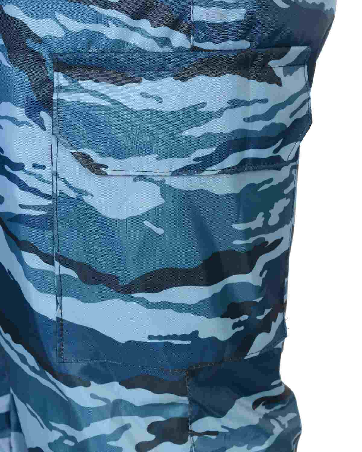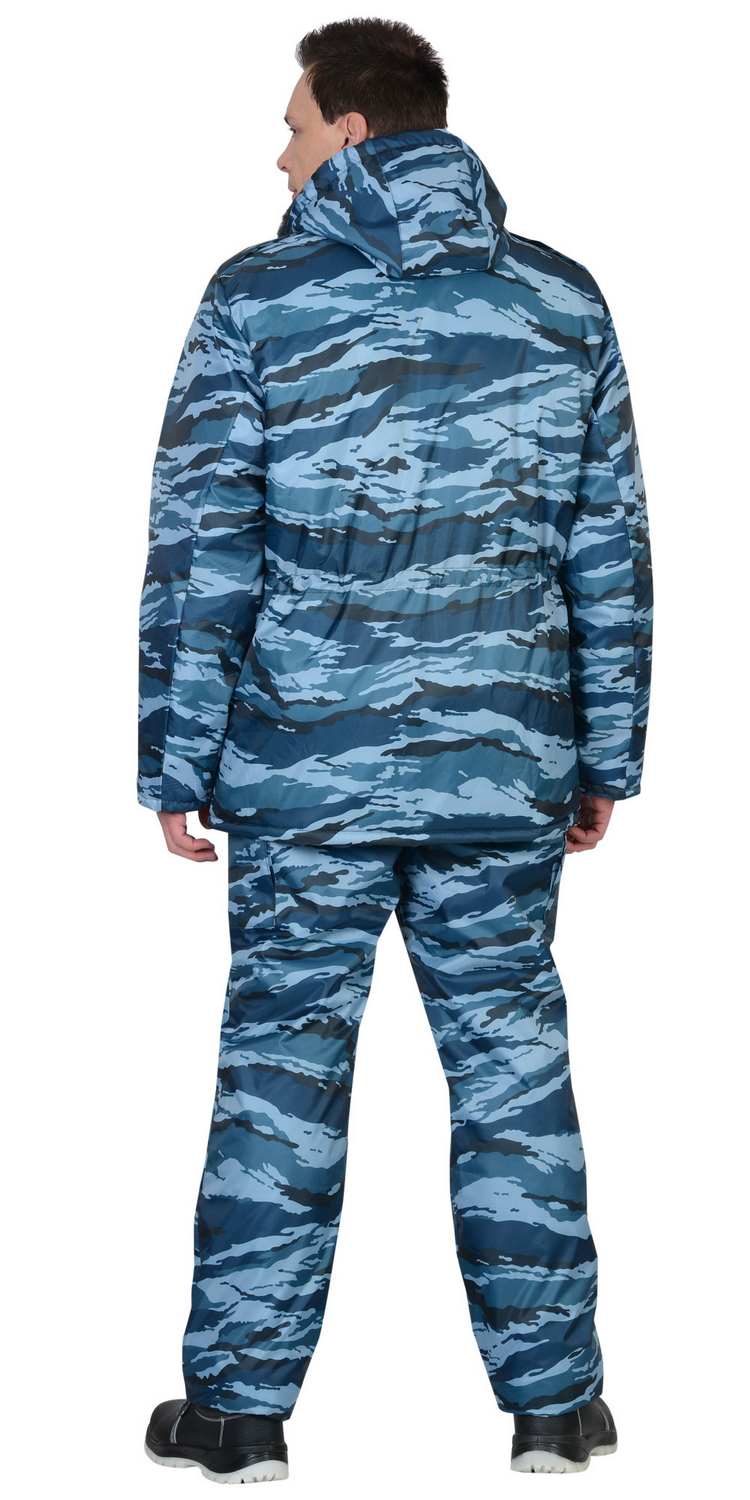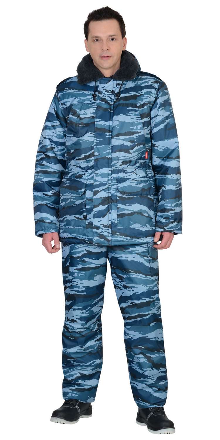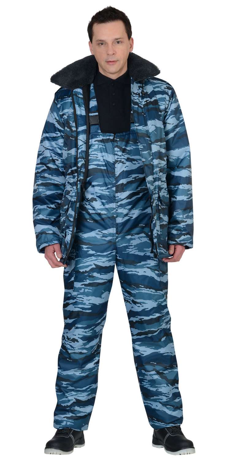 Костюм мужской утеплённый: куртка длинная, полукомбинезон. Куртка на молнии с ветрозащитным клапаном, съёмным капюшоном, накладными и прорезными карманами. Притачной меховой воротник, кулиска по линии талии, трикотажные манжеты внутри рукавов обеспечивают дополнительную теплозащиту. Полукомбинезон с центральной застёжкой-"молнией" и двумя боковыми накладными карманами.