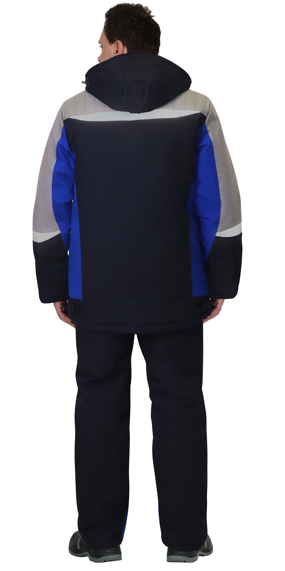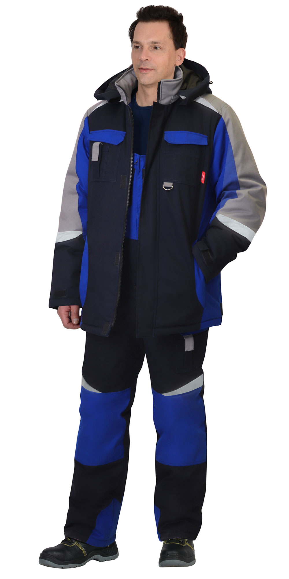 Костюм зимний трёхцветный, из полиэфирнохлопковой ткани с водоотталкивающей пропиткой, состоит из удлинённой куртки и полукомбинезона. В костюме предусмотрены детали из ленты светоотражающей ш.50мм, что обеспечивает видимость рабочего при любом освещении.