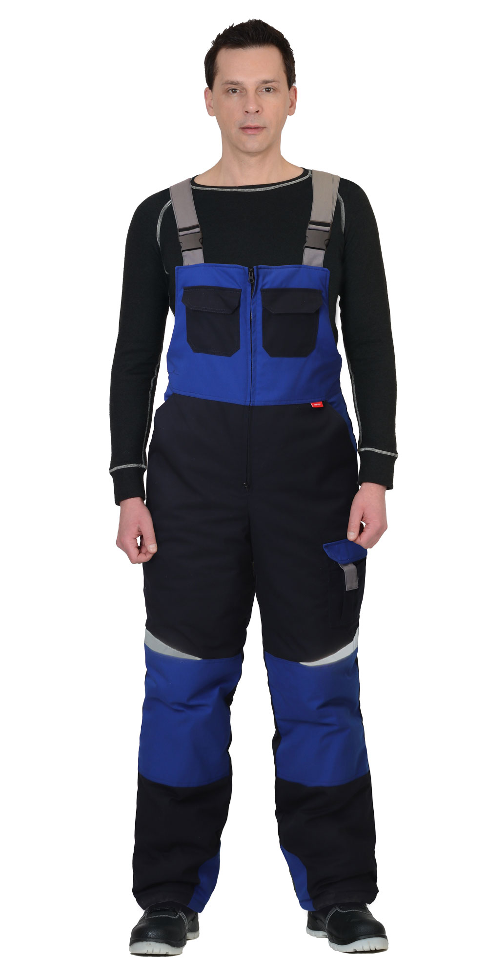 Полукомбинезон утепленный, с застёжкой спереди на двухзамковую молнию, сзади с резинкой по талии для лучшего прилегания, с наколенниками, с боковыми карманами спереди, с нагрудными карманами с клапаном, с двойным карманом на левом боковом шве и с карманами сзади. Полукомбинезон с бретелями, регулируемыми по длине.