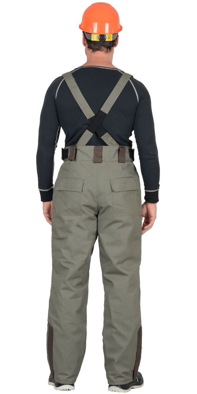 БРЮКИ с застежкой гульфика на молнию, с притачным широким поясом, застегивающимся на 2 пуговицы, с широкими шлевками и съемными бретелями. Бретели регулируются эластичной тесьмой и фастексам. Два боковых внутренних кармана, и накладные карманы с клапанами на задних половинках брюк.