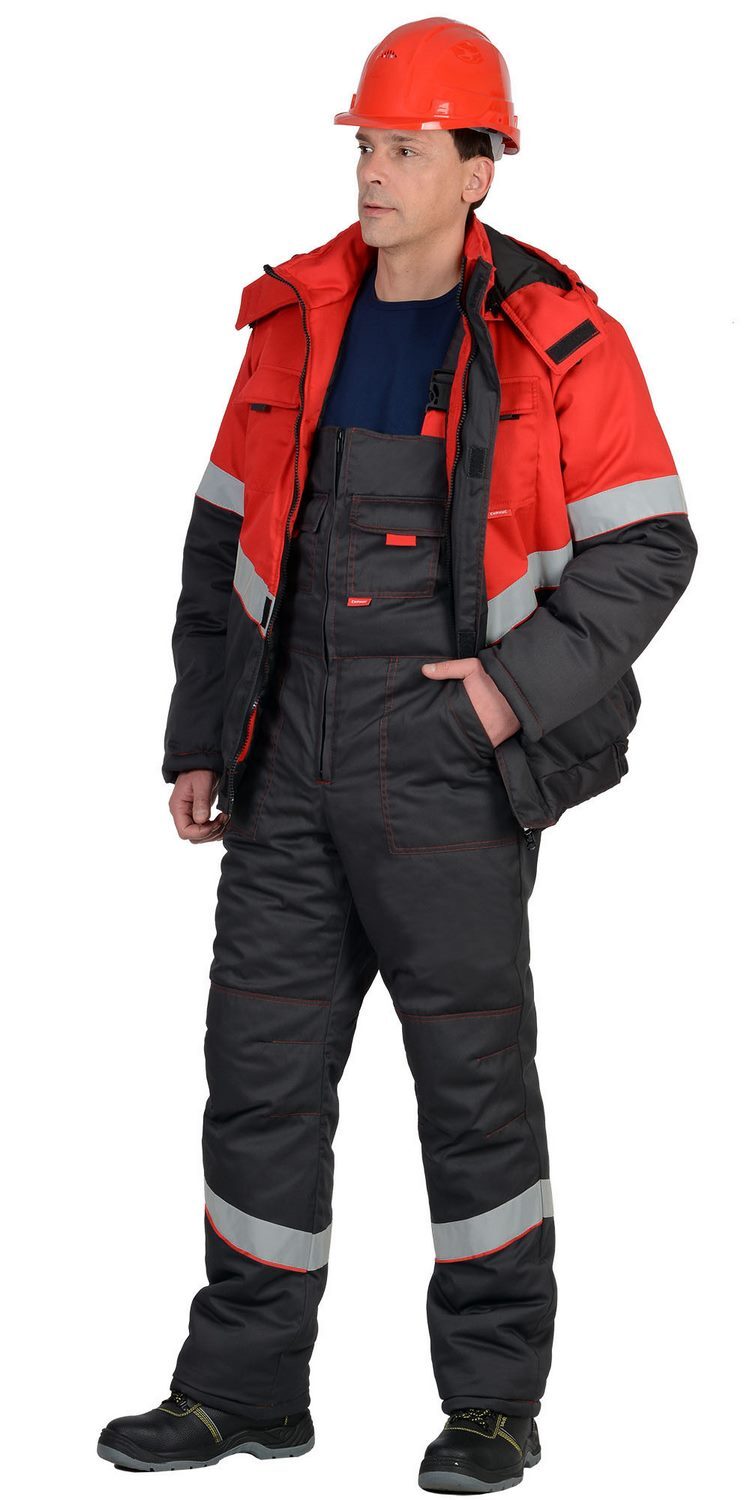 Полукомбинезон прямой; с притачной утеплённой подкладкой, с регулируемыми за счёт эластичной тесьмы и фастексов бретелями; притачным нагрудником; центральной застёжкой на молнию; с двумя нагрудными накладными карманами с клапанами с патой и с липучкой, боковыми накладными карманами.