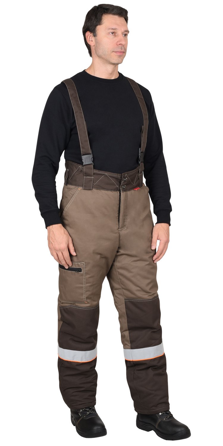 БРЮКИ прямые, с бретелями, с притачной утеплённой подкладкой, с центральной застежкой гульфика на тесьму «молния», широким фигурным поясом, с застежкой на поясе на две пуговицы, с тремя узкими шлевками на задних половинках и двумя щлевками-держателями фастексов на передних половинках. Внутренние боковые карманы с наклонным входом, с накладным карманом на правом боковом шве, застегивающимся на тесьму «молния». Наколенники на передних половинках, накладные задние карманы. СОП 50мм для обеспечения видимости.