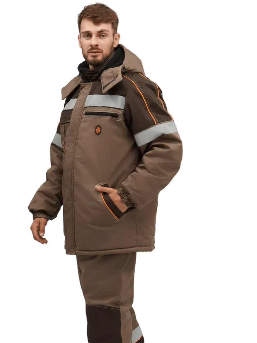 КУРТКА прямая длинная, с притачной утепленной подкладкой, с ветрозащитной прокладкой, с центральной застежкой на двухзамковую тесьму "молния". Внешняя ветрозащитная планка застегивается на потайные текстильные «липучки». Воротник стойка, с утепленным капюшоном пристегивающимся на тесьму «молния». Накладной функциональный нагрудный карман с клапаном; нагрудный карман в рамку на тесьму «молния». Нижние карманы в «листочку». Рукава втачные с притачной манжетой. СОП шириной 50мм для обеспечения видимости.