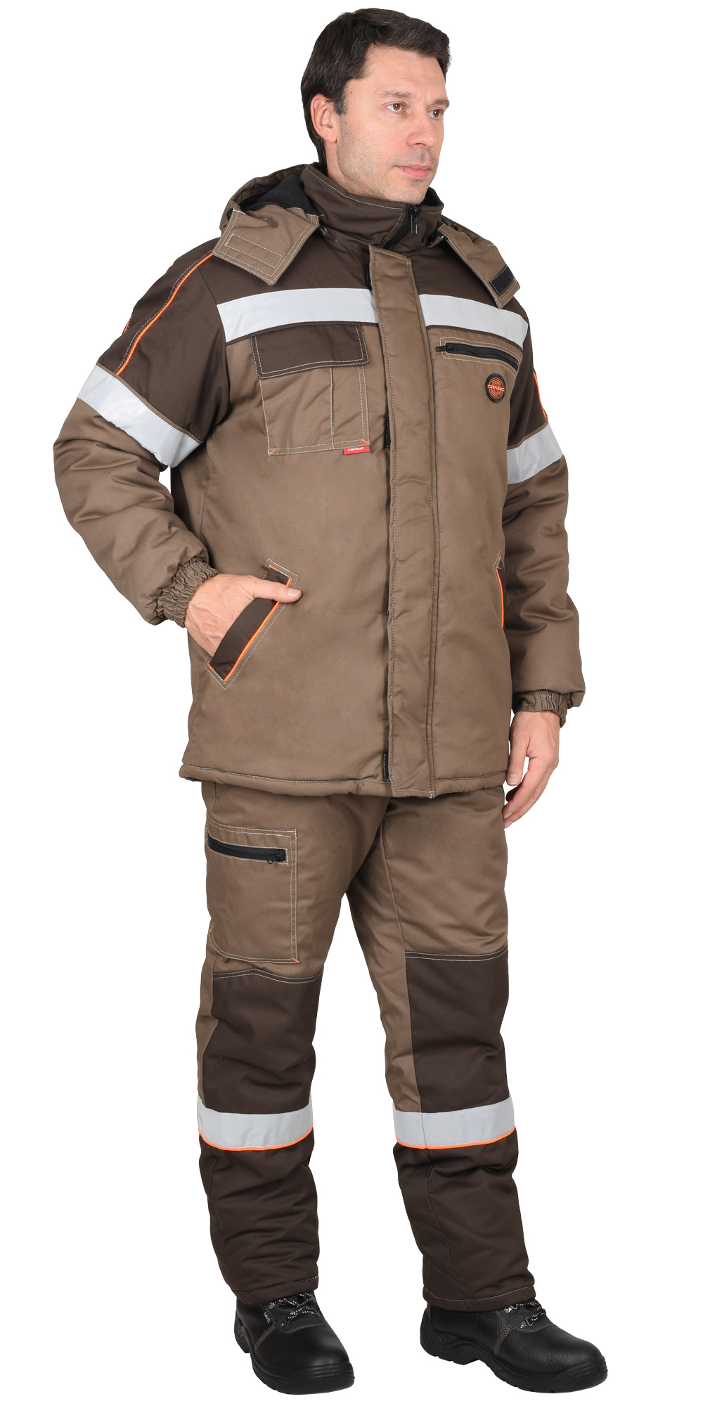 Костюм зимний состоит из куртки и брюк, в костюме предусмотрена светоотражающая полоса для обеспечения видимости.