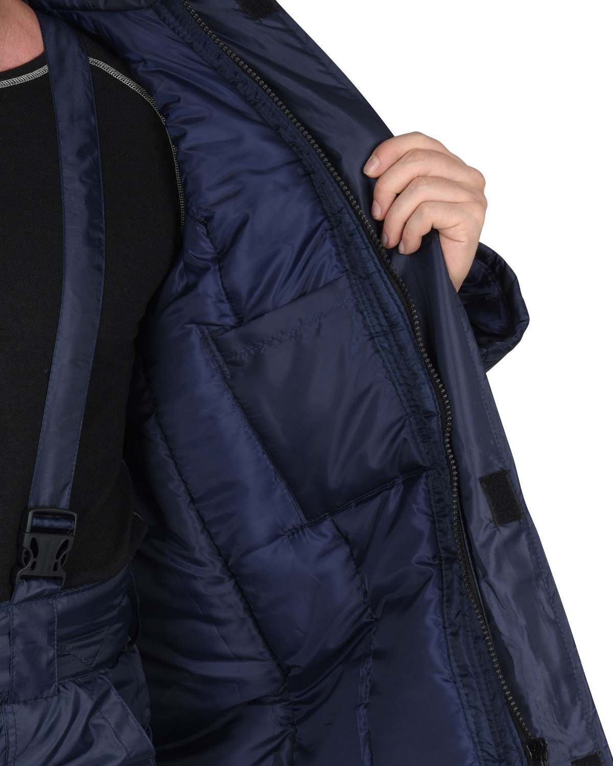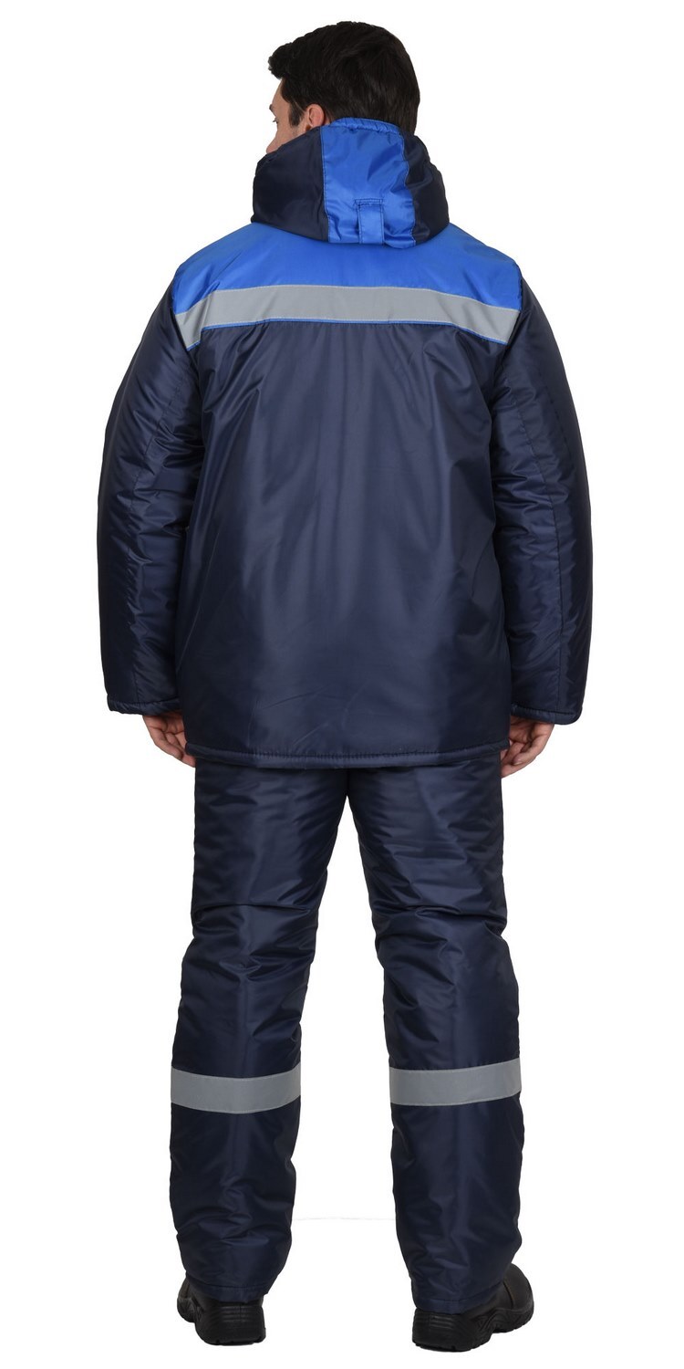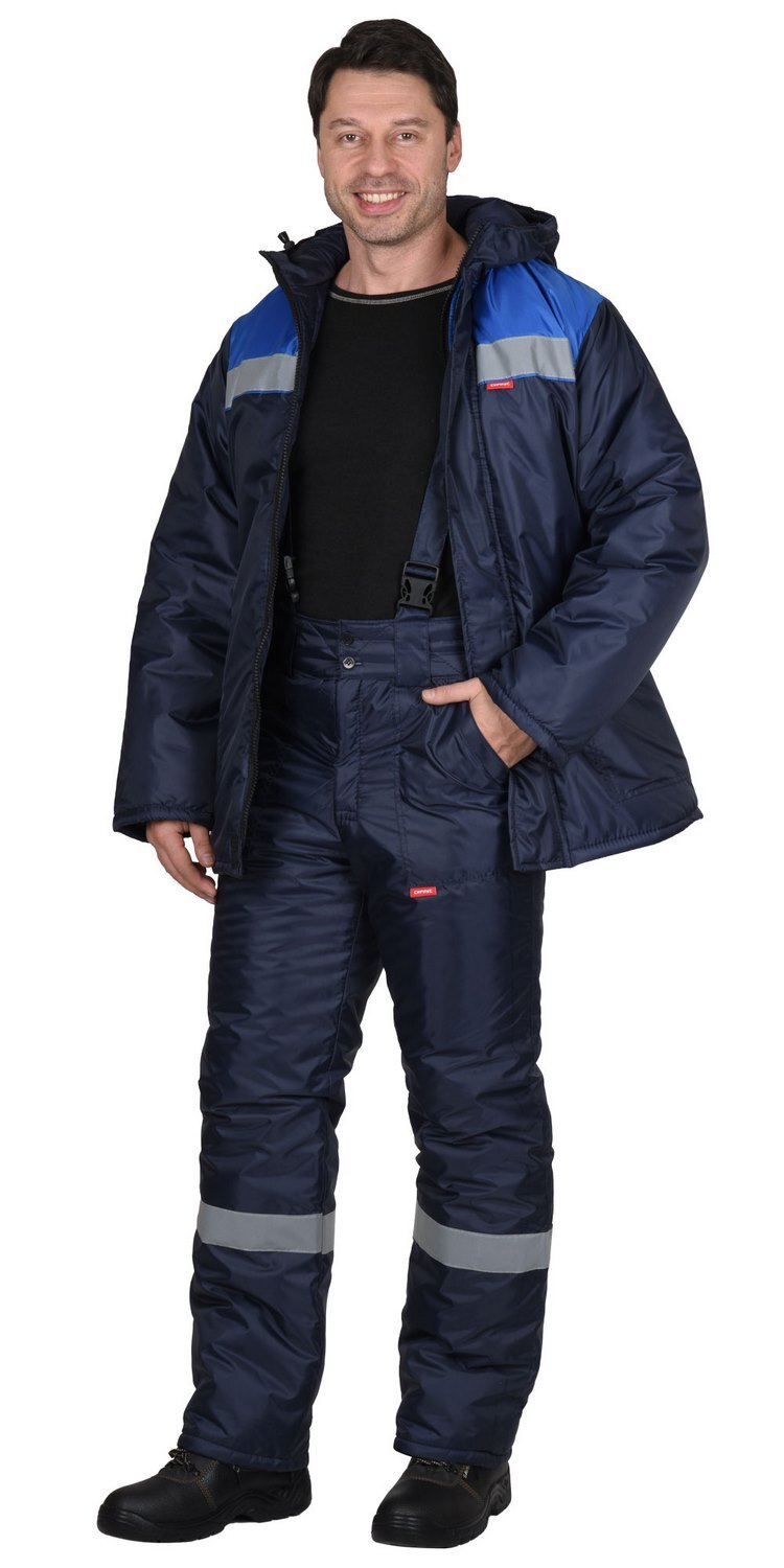 Куртка прямая, с притачной утепленной подкладкой, с центральной застежкой на тесьму-«молния», с притачным капюшоном, с накладными карманами. Рукава втачные. В куртке предусмотрена лента светоотражающая (серая) 50мм для обеспечения видимости.Брюки прямые, с притачной утеплённой подкладкой, с центральной застежкой гульфика на тесьму - «молния», широким фигурным поясом, с застежкой на две обметанные петли и пуговицы, с тремя узкими шлевками на задних половинках и двумя щлевками-держателями фастексов на передних половинках, с боковыми накладными карманами с наклонным входом, с бретелями. В брюках предусмотрена лента светоотражающая (серая) 50мм для обеспечения видимости.