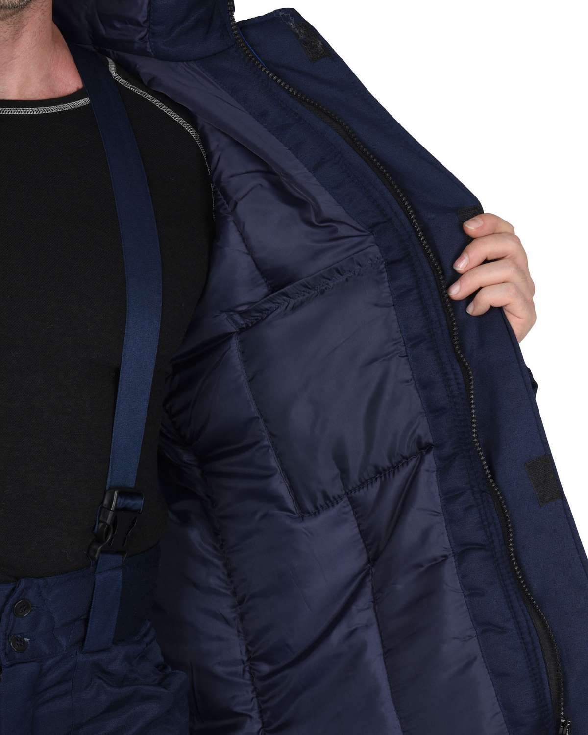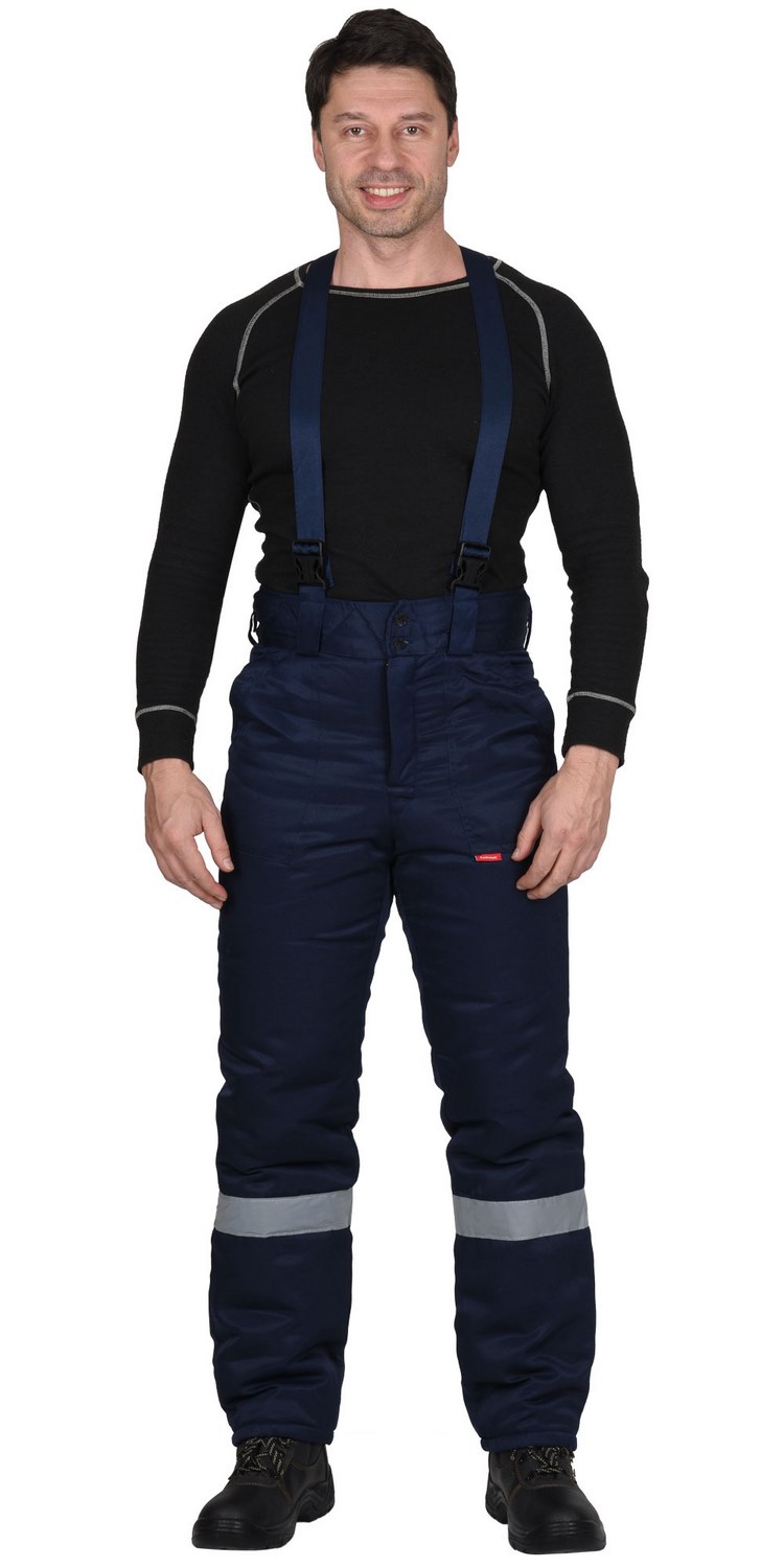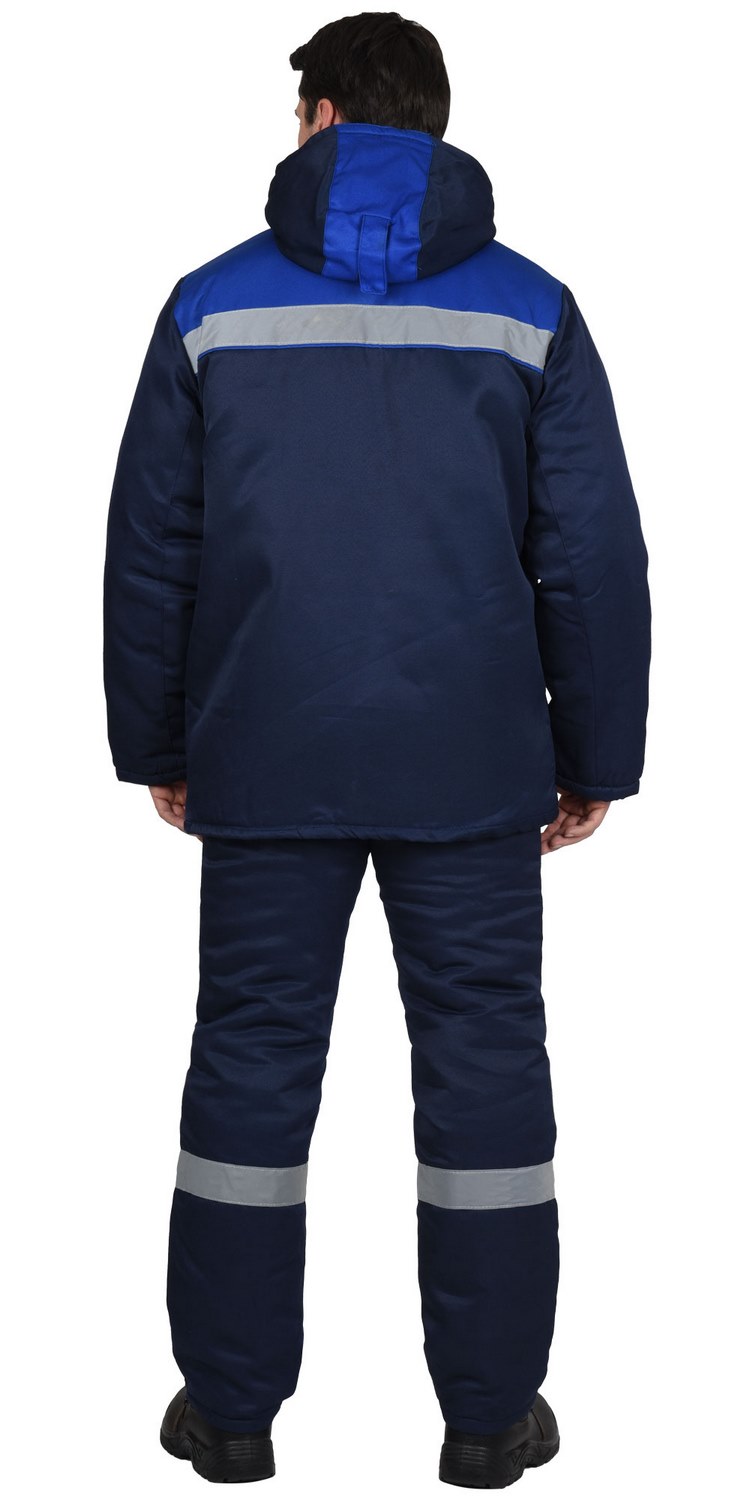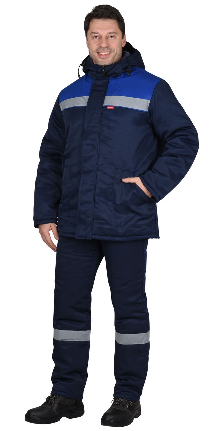 Куртка прямая, с притачной утепленной подкладкой, с центральной застежкой на тесьму-«молния», с притачным капюшоном, с накладными карманами. Рукава втачные. В куртке предусмотрена лента светоотражающая (серая) 50мм для обеспечения видимости.Брюки прямые, с притачной утеплённой подкладкой, с центральной застежкой гульфика на тесьму - «молния», широким фигурным поясом, с застежкой на две обметанные петли и пуговицы, с тремя узкими шлевками на задних половинках и двумя щлевками-держателями фастексов на передних половинках, с боковыми накладными карманами с наклонным входом, с бретелями. В брюках предусмотрена лента светоотражающая (серая) 50мм для обеспечения видимости.