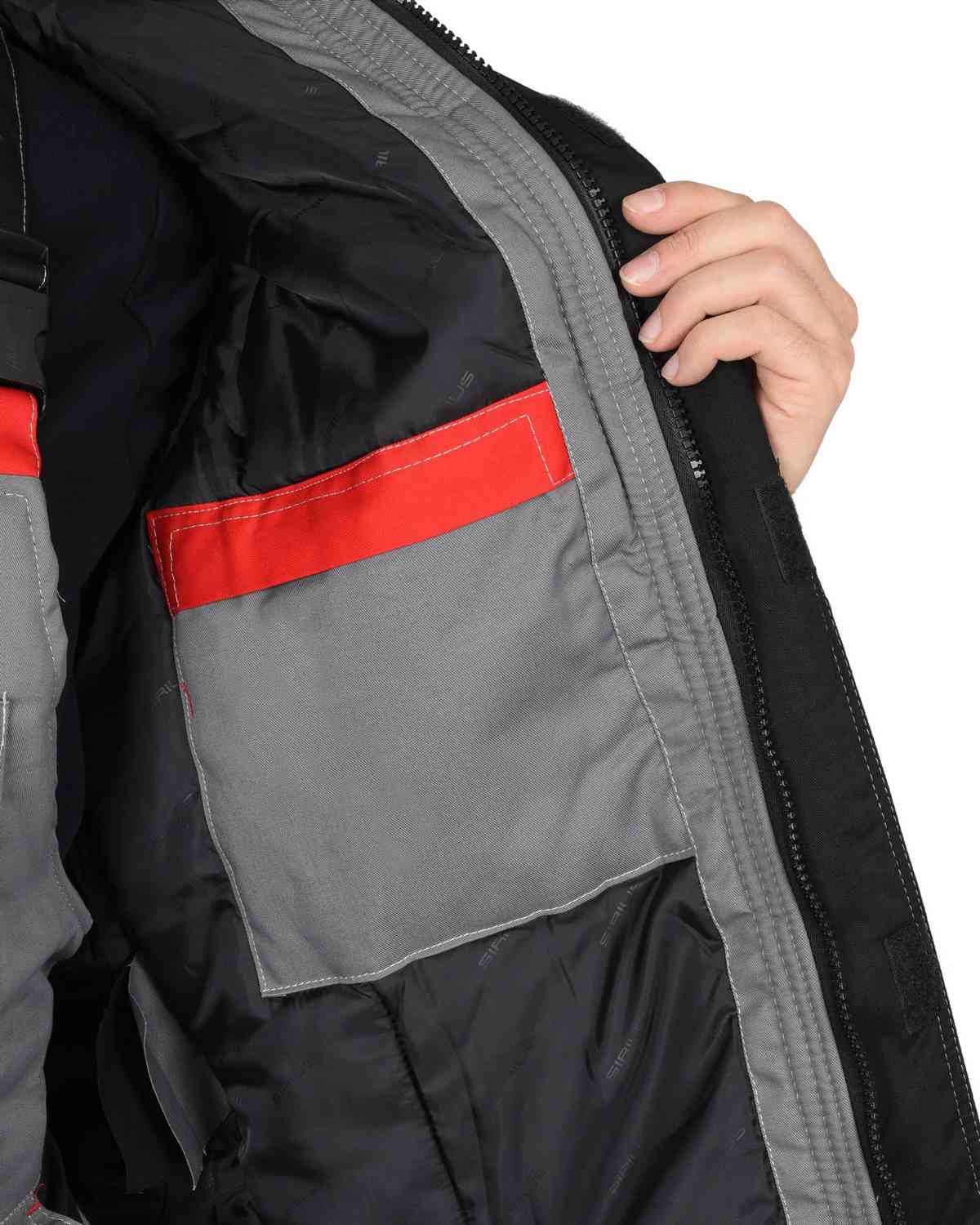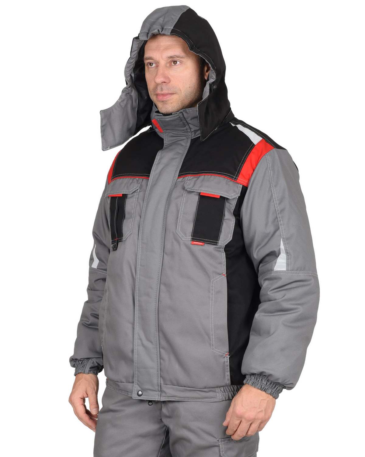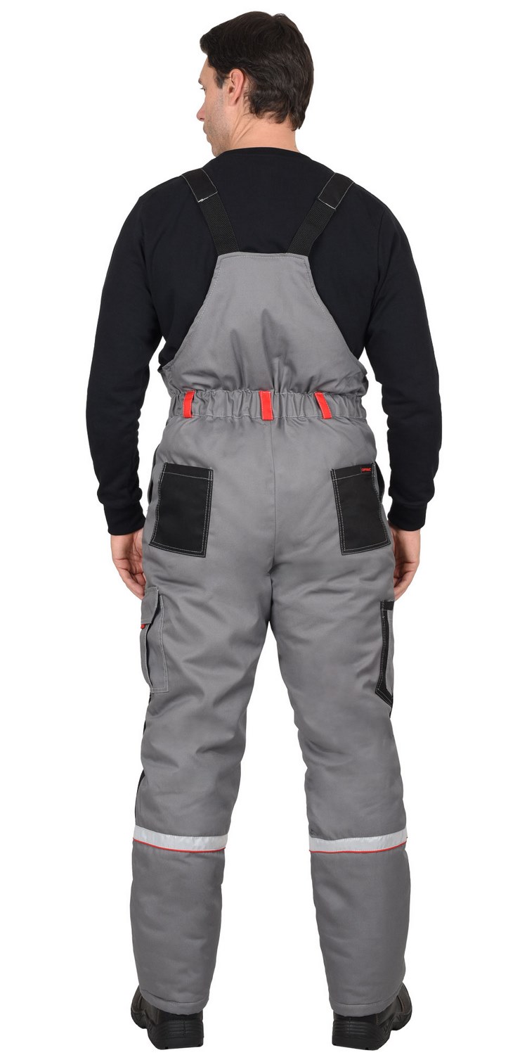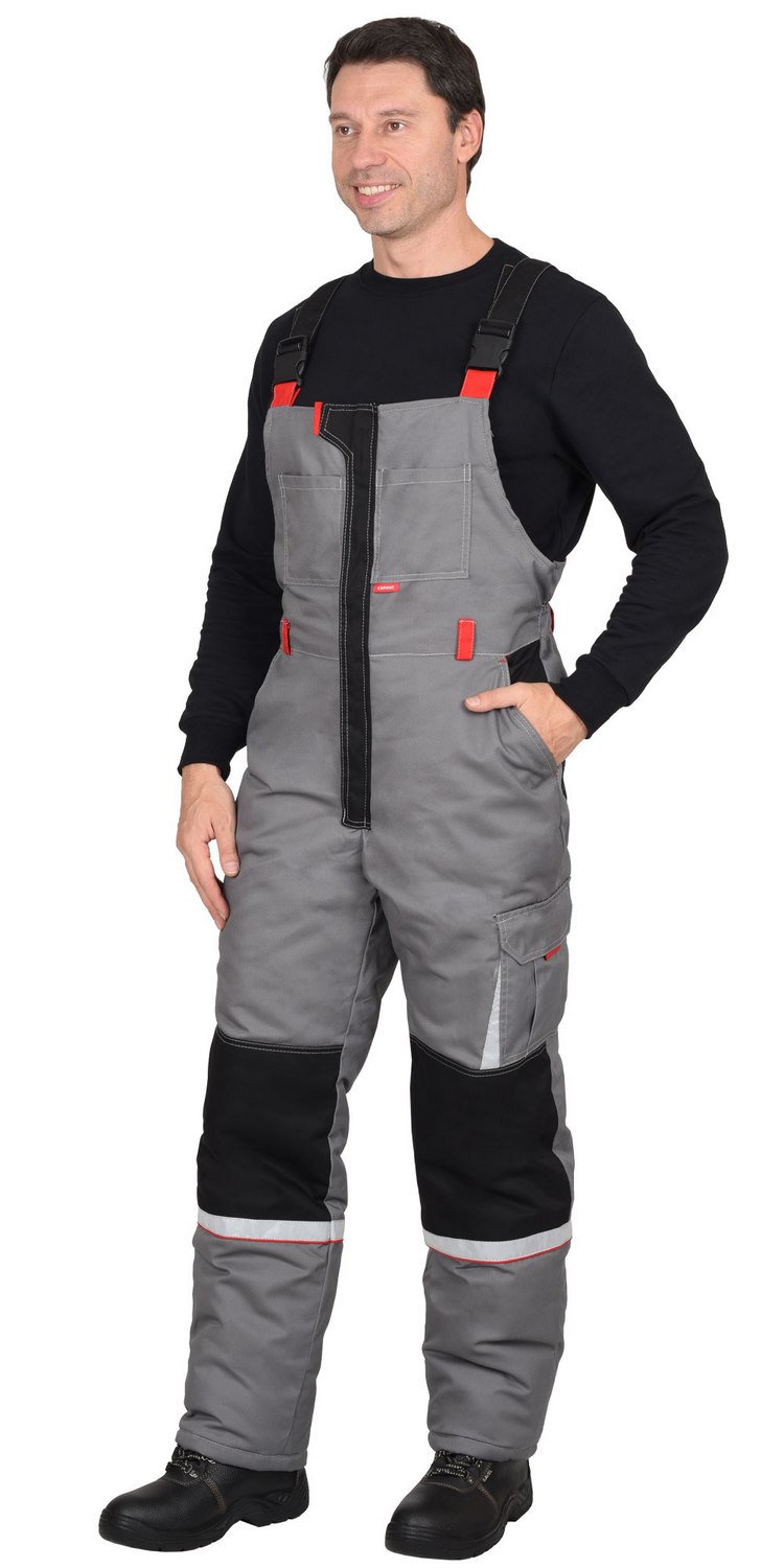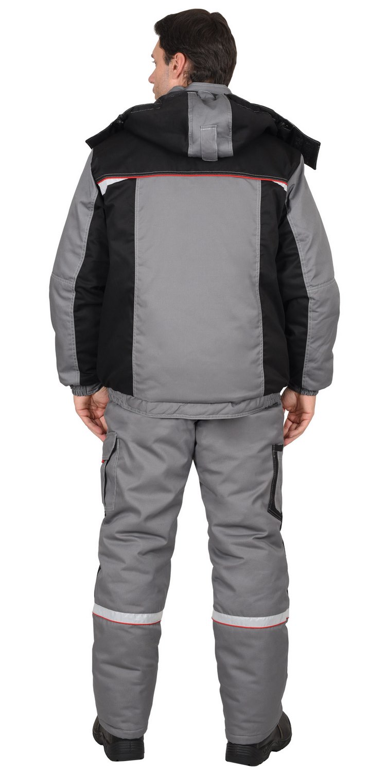 Куртка прямого силуэта, короткая, с прокладкой из ветрозащитной ткани, с воротником стойка, с центральной застёжкой на тесьму-«молния» накрытую ветрозащитной планкой, застёгивающимся на одну кнопку и 4 липучки, с подрезными бочками, с верхними фигурными карманами и фигурными клапанами на липучках, с нижними карманами в рельефах, с притачным поясом частично стянутый на резинку ткацкую. Рукава с притачными манжетами частично стянутые на резинку ткацкую. В куртке предусмотрена фигурная лента светоотражающая 50 мм. для обозначения сигнальной видимости.Полукомбинезон прямой, с притачной утепленной подкладкой, с центральной застежкой на тесьму – «молния» накрытая планкой застегивающиеся на липучку, с нагрудными накладными карманами, с нижними внутренними карманами с наклонным входом, с накладным карманом и фигурным клапаном застёгивающийся на липучку на боковом шве, с задними накладными карманами и карманами под инструменты, с резинкой ткацкой в области спины, с наколенниками. Бретели регулируются помочной резинкой и фастексам.