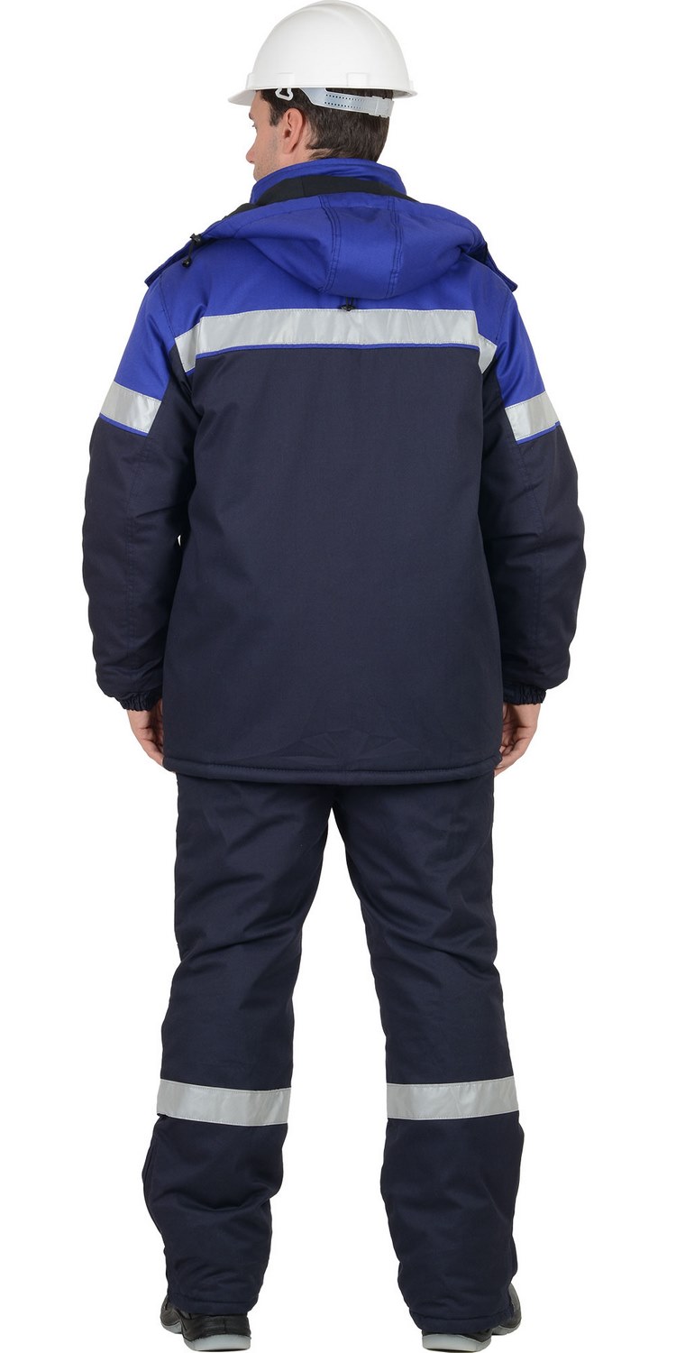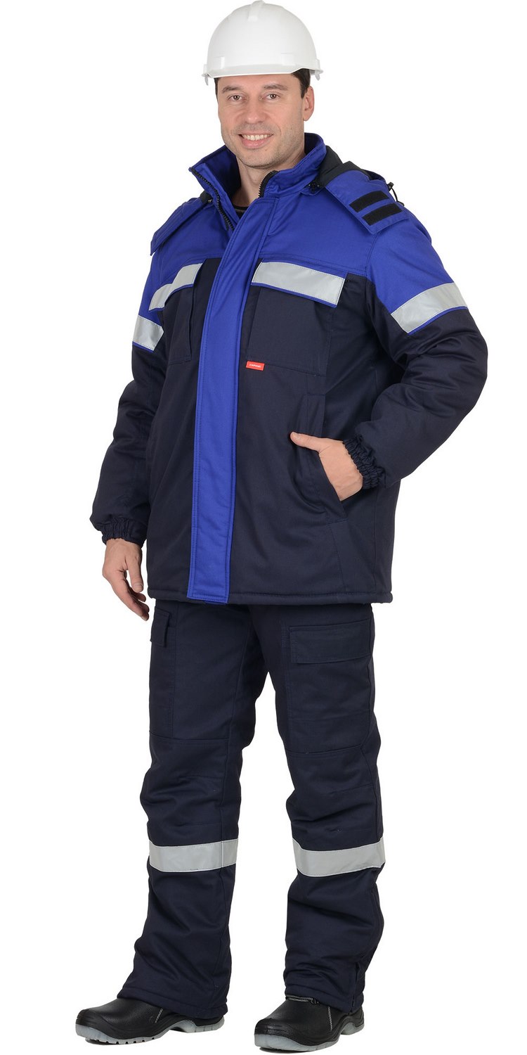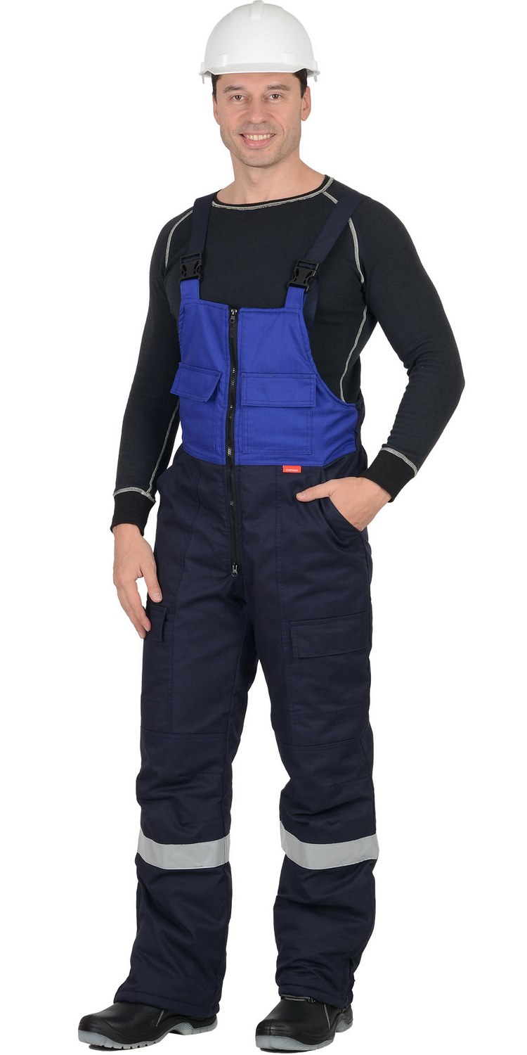 Костюм состоит из куртки и полукомбинезона.Куртка прямого силуэта с центральной застёжкой на 2-х замковую молнию, ветрозащитной планкой с застежкой на липучку, воротником - стойка и пристёгивающимся капюшоном, верхними накладными карманами с клапанами на липучках, с карманом молния на левой полочке, нижними карманами в рельефах, внутренним на молнии, ветрозащитной юбкой на кнопках. Рукава втачные, с притачной манжетой. Полукомбинезон с притачной утепленной подкладкой, центральной застёжкой на двухзамковую молнию, с подпланкой с правой стороны, нагрудными карманами с клапанами застегивающиеся на липучку, с накладными боковыми карманами с наклонным входом, нижними кармами и клапанами на передних половинках застегивающиеся на липучку, с объёмными наколенниками, с разрезами понизу боковых швов и пуфтой. С бретелями регулирующимися эластичной тесьмы и держателями фастексов. По спинке проходит резинка для лучшего прилегания.СОП - 50 мм. по спинке кокетки, на рукавах и клапанах нагрудных карманов, нузу брюк.