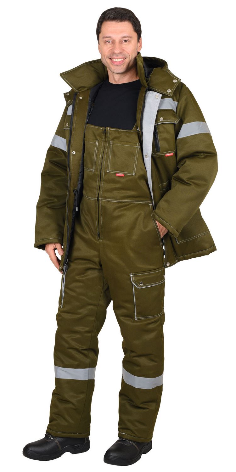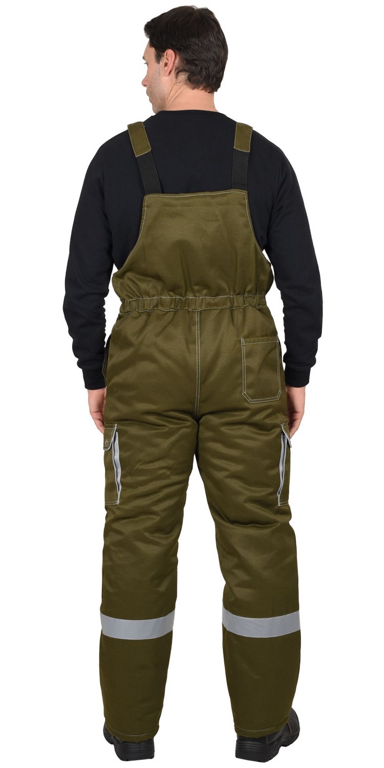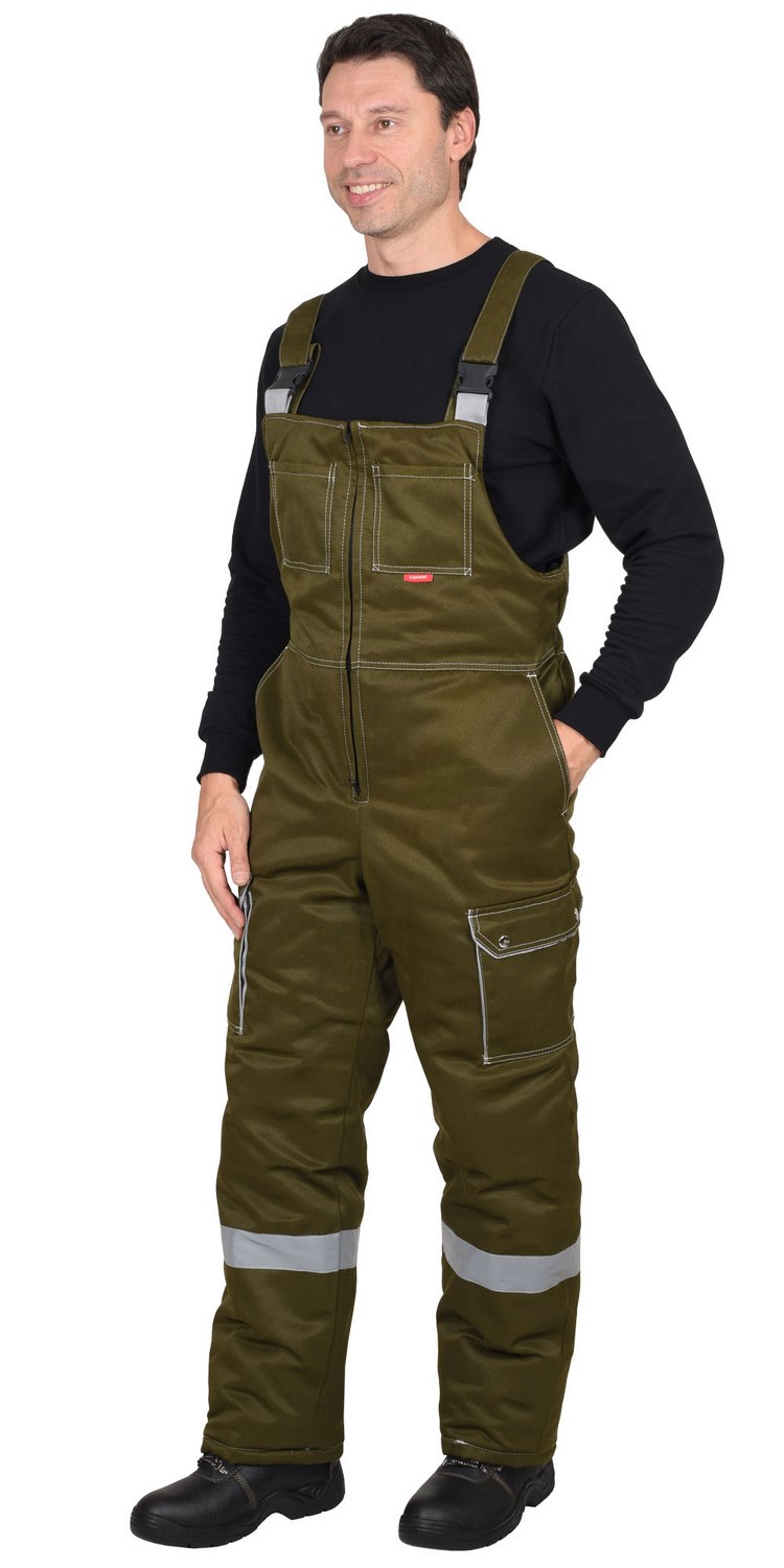 Полукомбинезон прямой; с притачной утепленной подкладкой, с регулируемыми за счет пряжек - бретелями; с притачным нагрудником; с центральной застежкой на молнию, с нагрудными накладными карманами, с двумя боковыми внутренними карманами, с наклонным входом, с двумя нижними накладными карманами.В костюме предусмотрен СОП ш.50мм для обеспечения сигнальной видимости в условиях пониженной видимости.