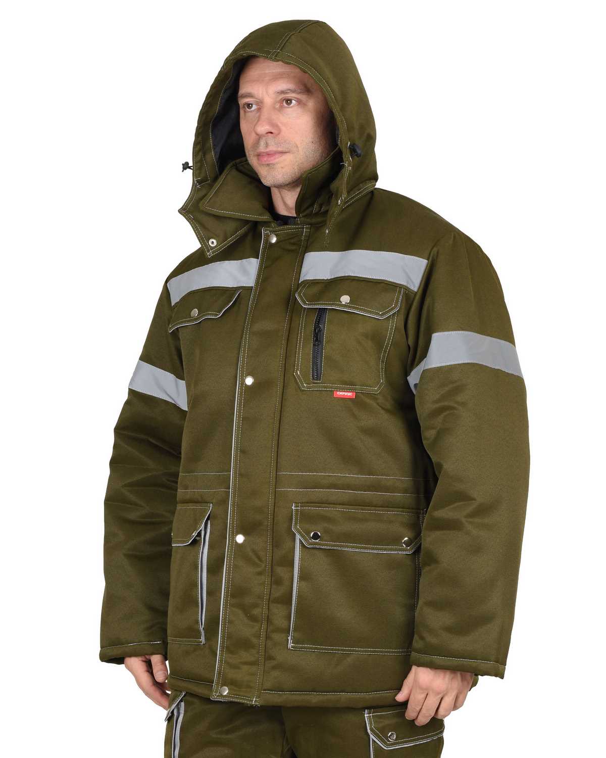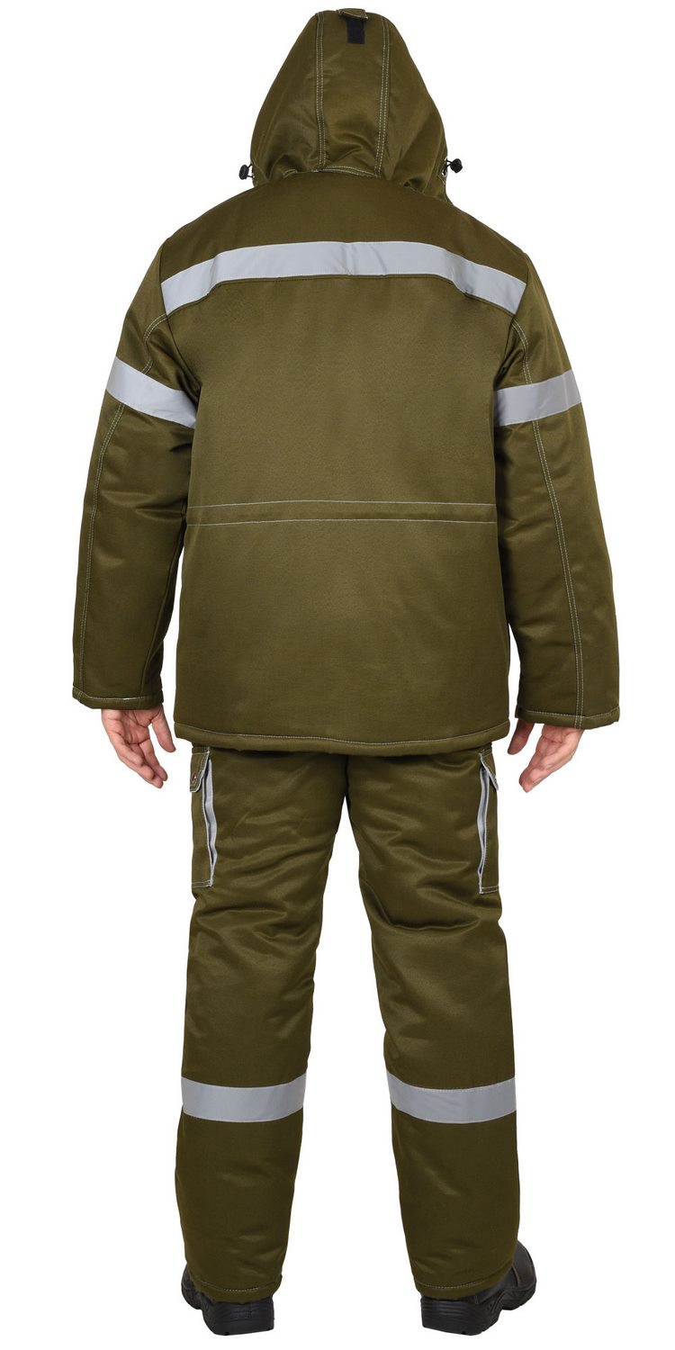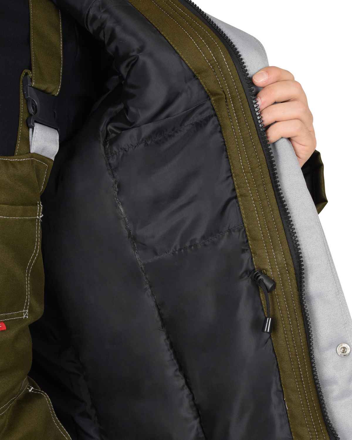 Полукомбинезон прямой; с притачной утепленной подкладкой, с регулируемыми за счет пряжек - бретелями; с притачным нагрудником; с центральной застежкой на молнию, с нагрудными накладными карманами, с двумя боковыми внутренними карманами, с наклонным входом, с двумя нижними накладными карманами.В костюме предусмотрен СОП ш.50мм для обеспечения сигнальной видимости в условиях пониженной видимости.