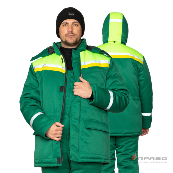 Костюм мужской утепленный «Стройка» — это модель зимней спецодежды эконом-сегмента, предназначенная для рабочих занятых в строительных, монтажных и ремонтных работах. Утепленный костюм «Стройка» отшит из смесовой ткани с влагоотталкивающей пропиткой, комплектуется курткой и полукомбинезоном, имеет 2 класс защиты от пониженных температур и предназначен для III климатического пояса. На куртке и полукомбинезоне настрочены светоотражающие полосы шириной 25 мм. Капюшон съёмный с утеплённой подкладкой, удобно застёгивается на контактную ленту, он достаточно глубокий и может использоваться под каску. Зимний мужской рабочий костюм с СОП дополняет линейку костюмов эконом-класса, но в отличии от зимнего костюма Стандарт комплектуется полукомбинезоном, а не брюками. Утепленные рабочие костюмы «Стройка» — это максимально простые комплекты тёплой спецодежды для строителей с более презентабельным внешним видом. Костюмы предлагаются в двух цветовых сочетаниях: синий и зелёный.