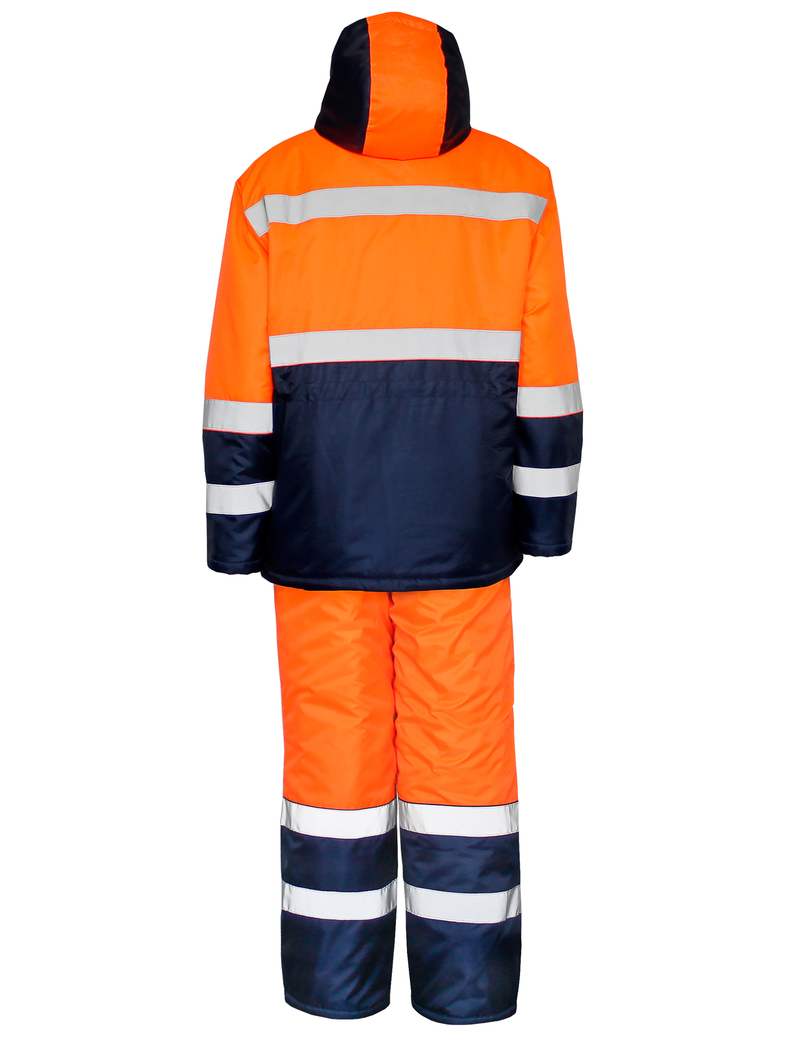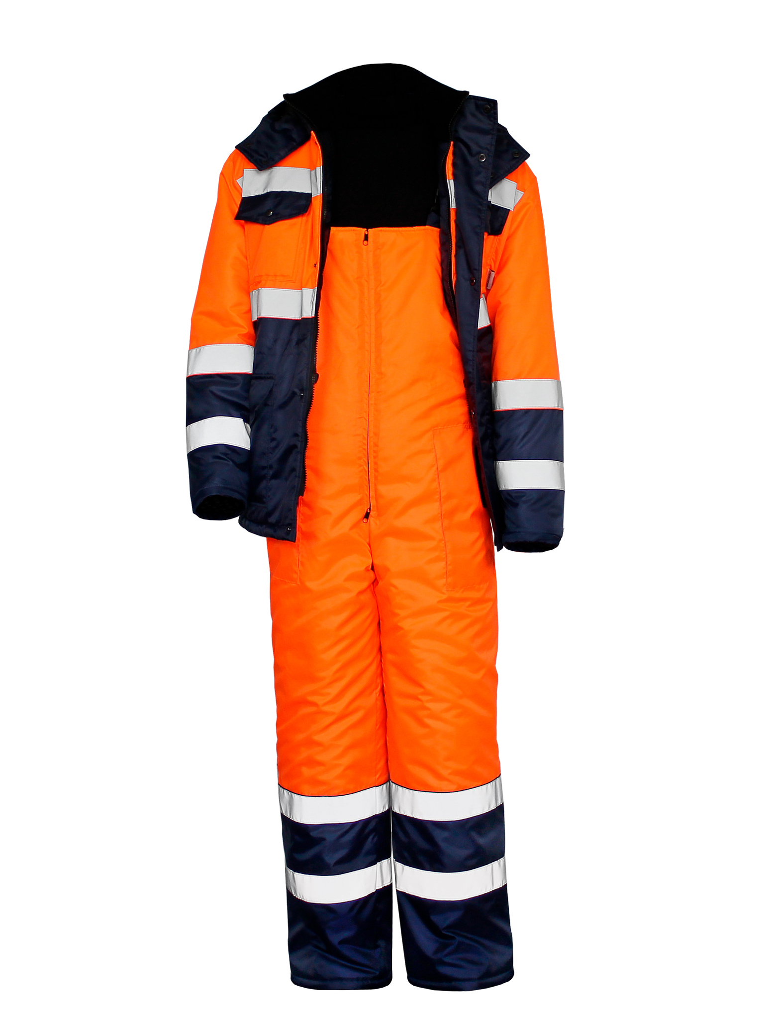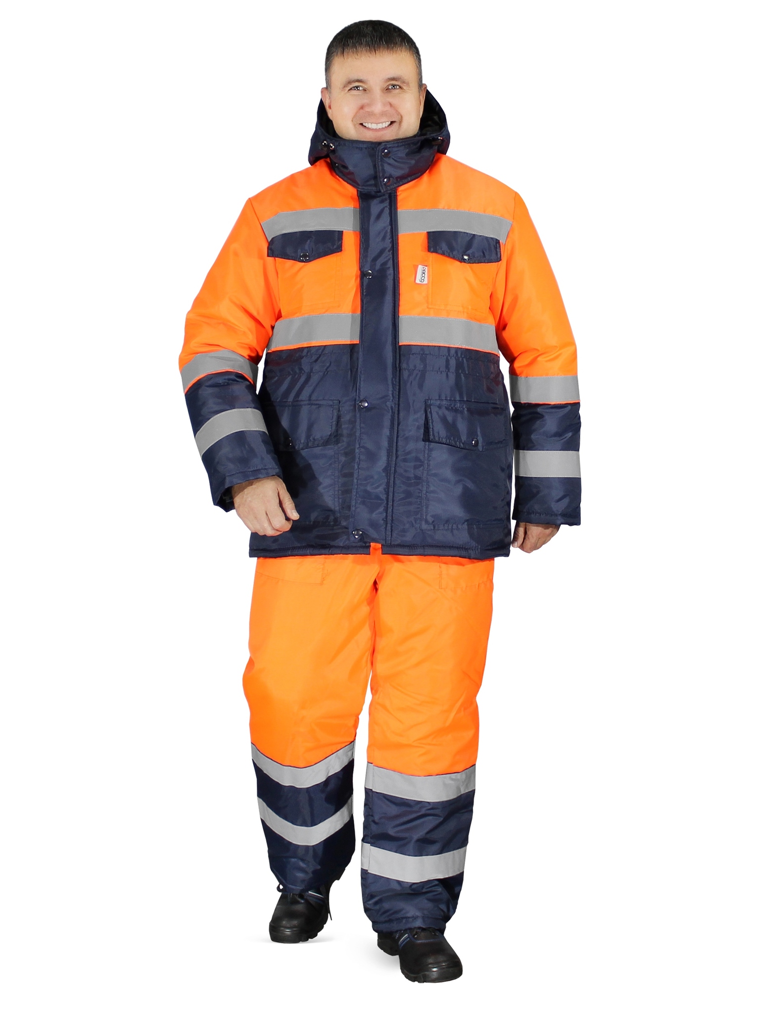 Куртка прямого силуэта с притачной утепленной подкладкой, центральной бортовой застежкой на тесьму молнию с ветрозащитной левосторонней планкой, застёгивающейся на кнопки. Куртка с втачными рукавами, с воротником – стойкой и капюшоном. Внутренний воротник из флиса. На куртке имеются накладные карманы с клапанами: два нагрудных и два нижних. Полукомбинезон прямого силуэта с двумя накладными карманами на притачной подкладке с центральной застёжкой - «молнией» и регулируемыми бретелями с застежкой на фастексы. Световозвращающая лента шириной 50 мм проходит по линии кокетки на полочках и спинке, низу куртки, средней части рукавов, и двойные в нижней части полукомбинезона, что соответствует III классу защиты сигнальной одежды.