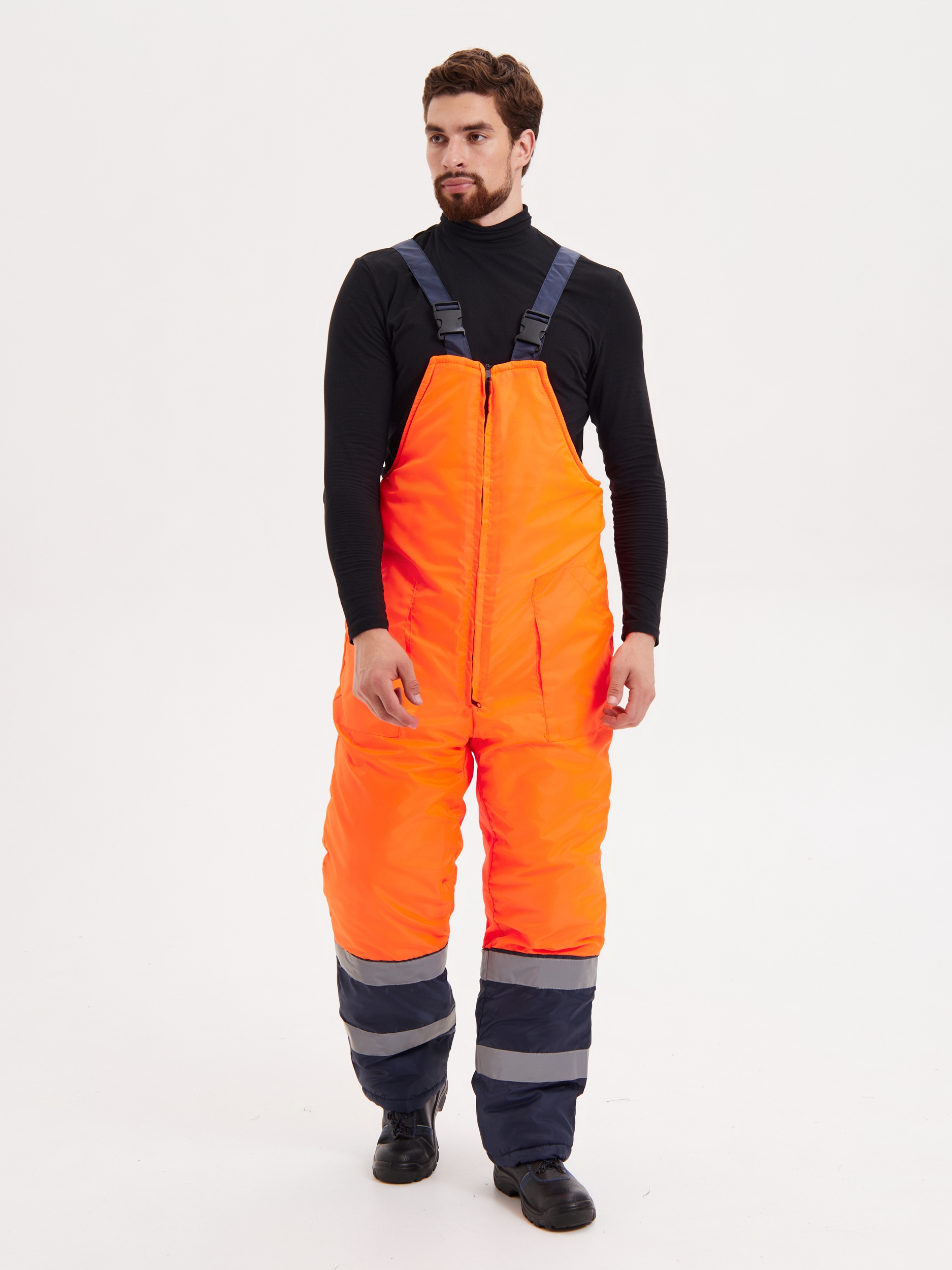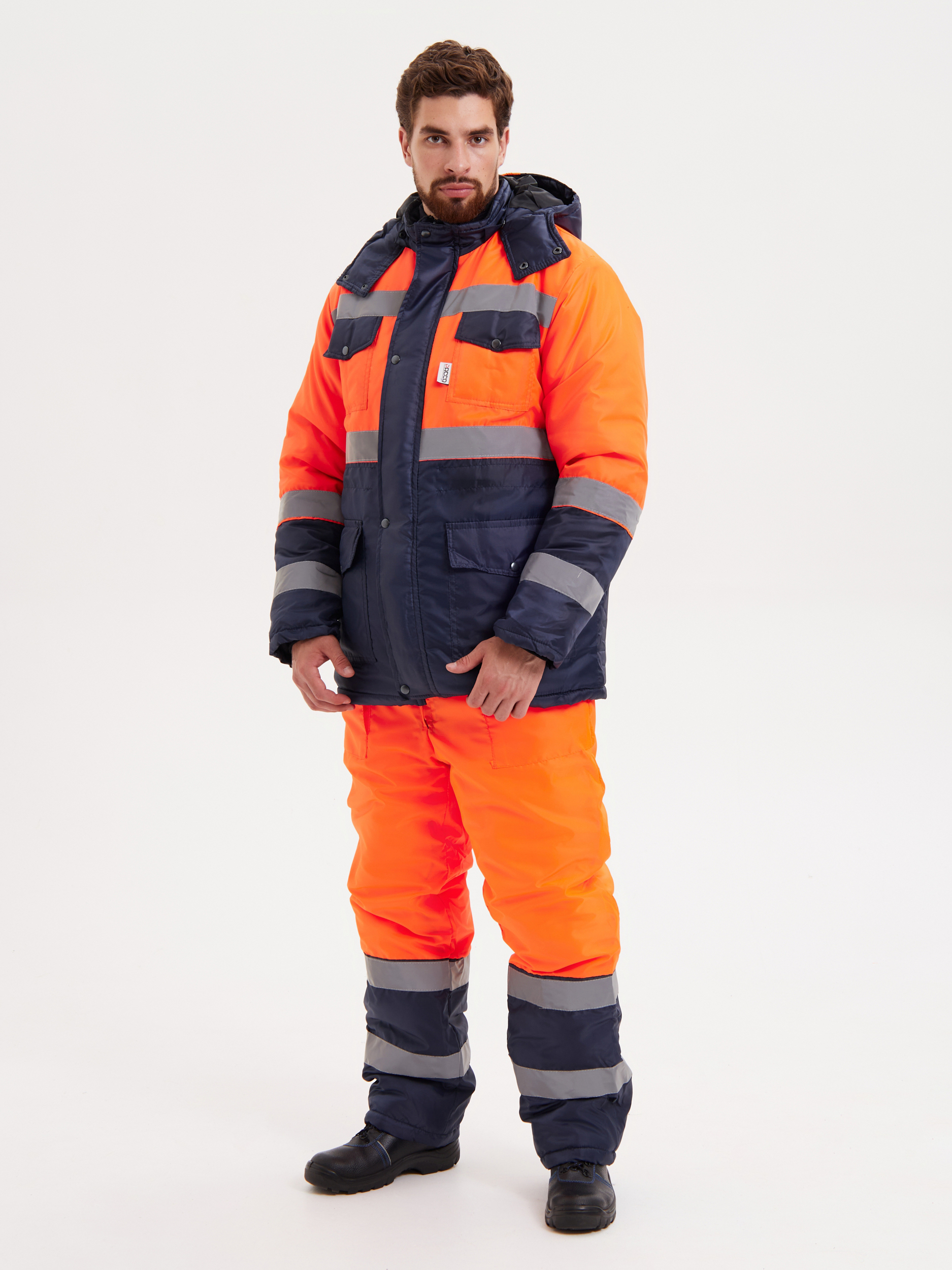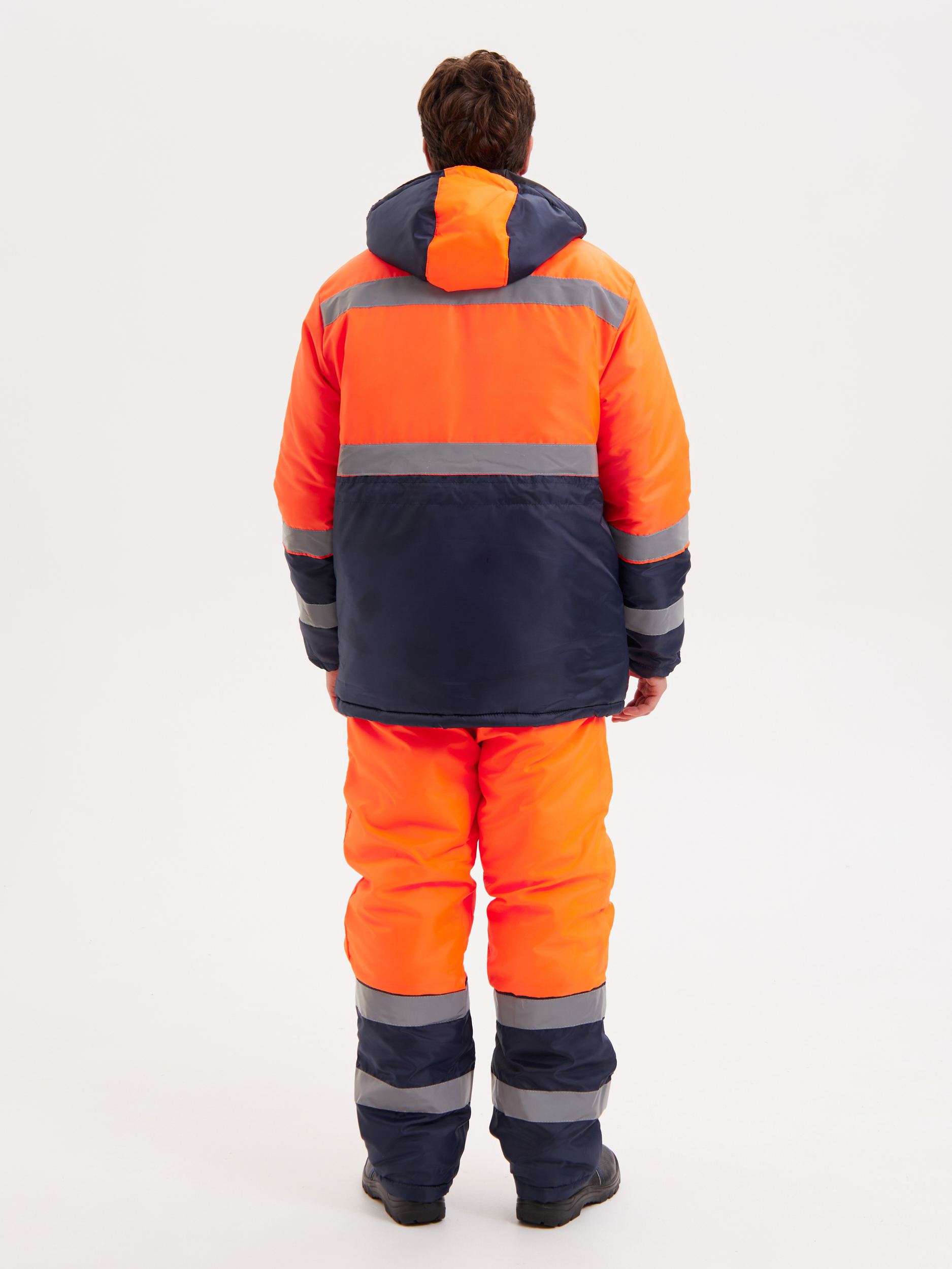 Куртка прямого силуэта с притачной утепленной подкладкой, центральной бортовой застежкой на тесьму молнию с ветрозащитной левосторонней планкой, застёгивающейся на кнопки. Куртка с втачными рукавами, с воротником – стойкой и капюшоном. Внутренний воротник из флиса. На куртке имеются накладные карманы с клапанами: два нагрудных и два нижних. Полукомбинезон прямого силуэта с двумя накладными карманами на притачной подкладке с центральной застёжкой - «молнией» и регулируемыми бретелями с застежкой на фастексы. Световозвращающая лента шириной 50 мм проходит по линии кокетки на полочках и спинке, низу куртки, средней части рукавов, и двойные в нижней части полукомбинезона, что соответствует III классу защиты сигнальной одежды.