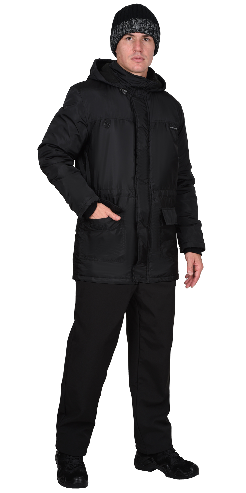 Куртка прямого силуэта, удлинённая, с утеплённой подкладкой, с центральной застежкой молния до края воротника, с ветрозащитным клапаном до горловины, с втачным воротником-стойка и втачным капюшоном, с втачными рукавами с внутренней трикотажной манжетой, с нижними накладными карманами с клапаном и карманом на подкладке. Куртка с кулиской по талии. Подкладка куртки утеплённая, верхняя часть подкладки из флиса, нижняя часть и рукава из подкладочной полиэфирной ткани. В куртке предусмотрено крепление для бейджа.
